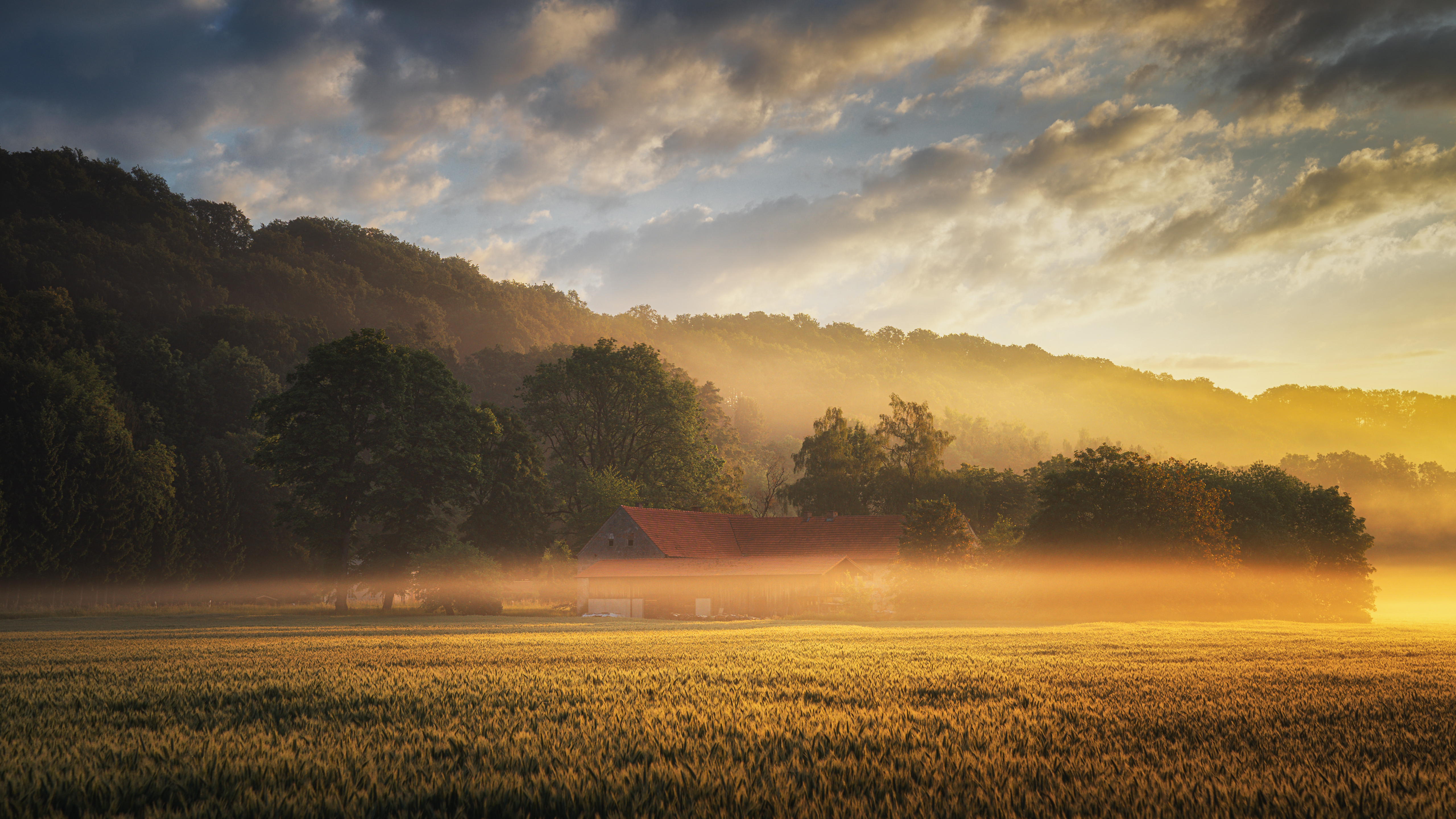 Sunrise, Landscape, Farm, Rural 5K Desktop and Mobile Wallpaper Background with a maximum resolution of 5120x2880 px.