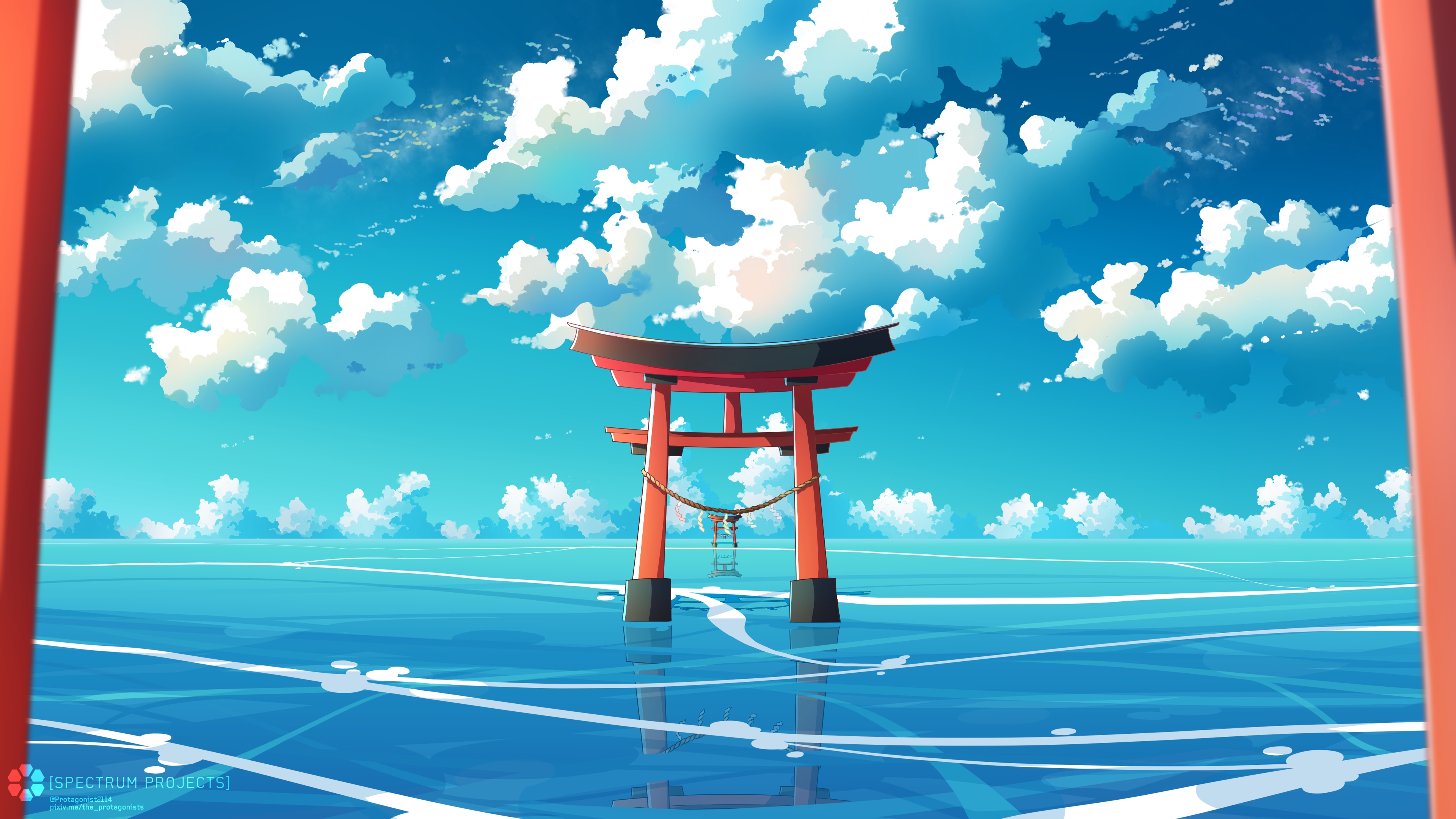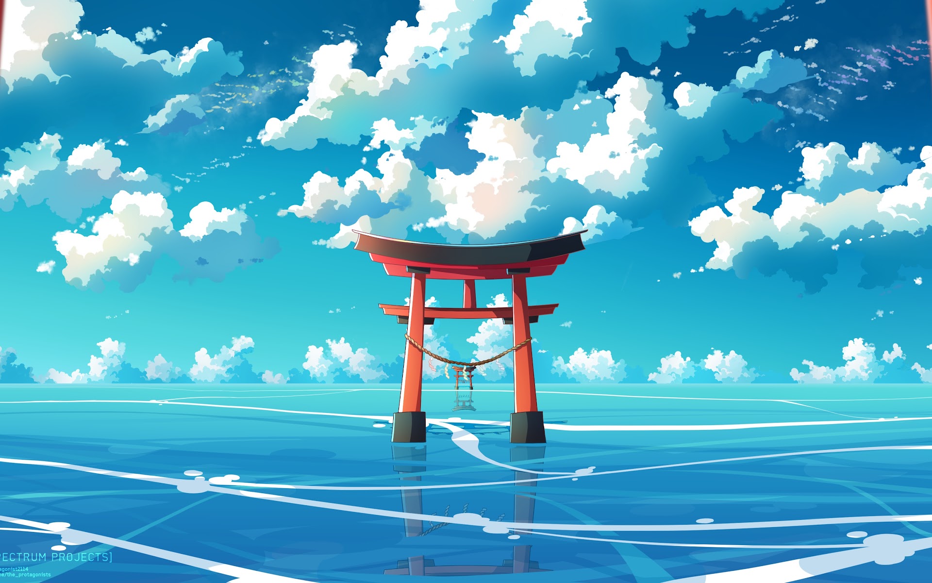 Torii Gate, Blue Sky, Anime Scenery, Japanese Architecture 4K Desktop Wallpaper