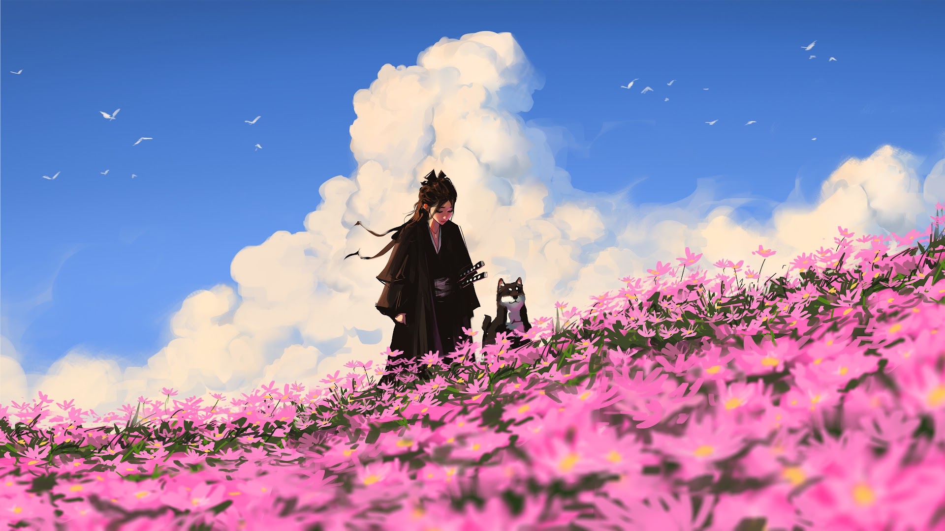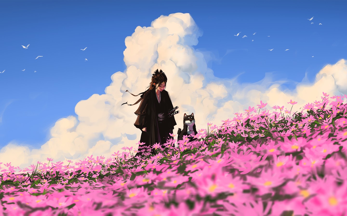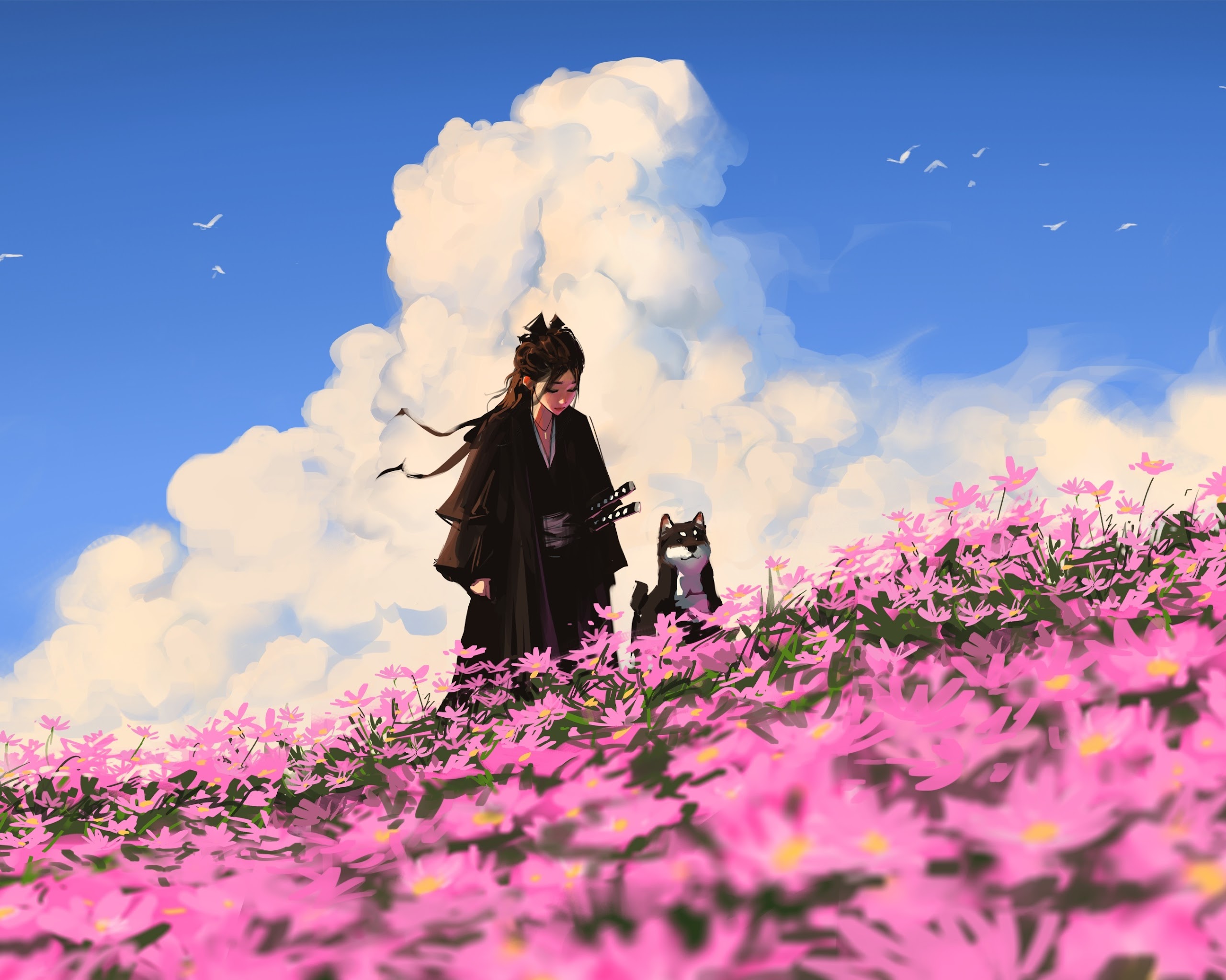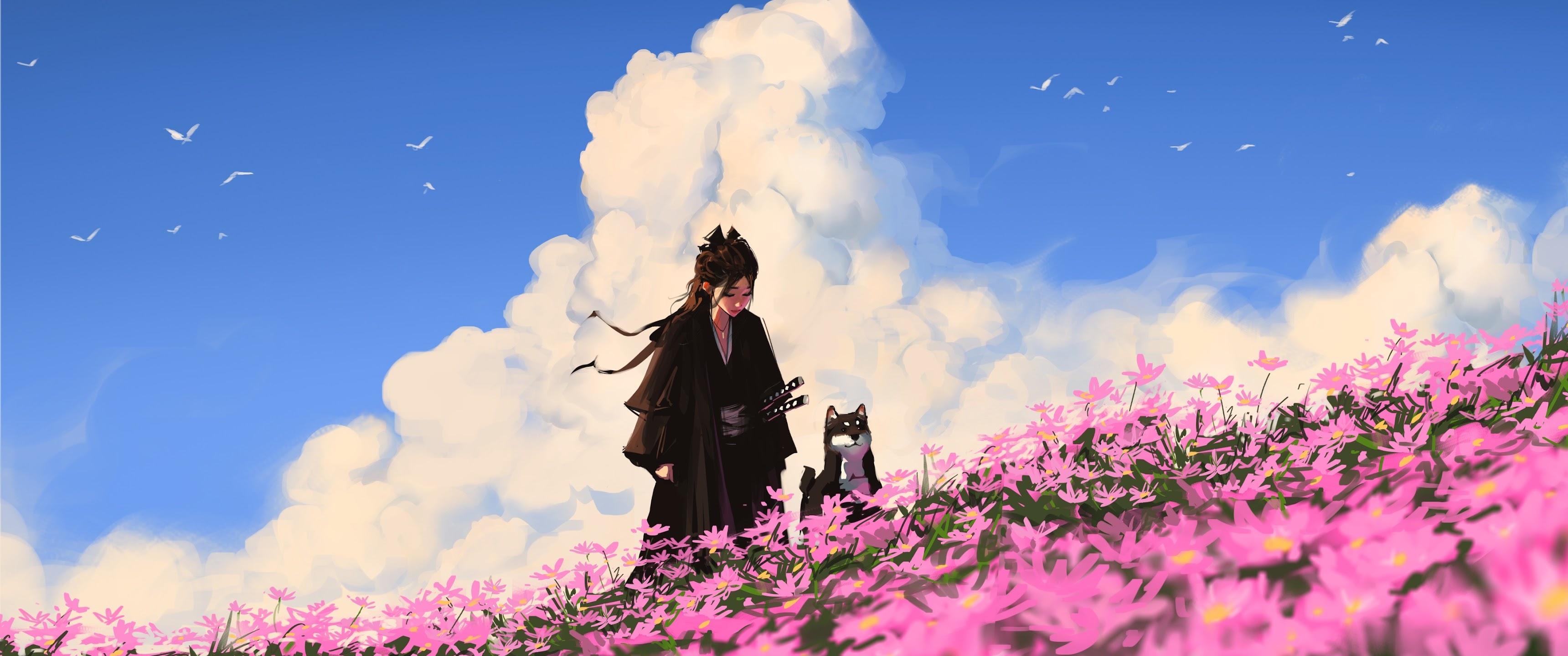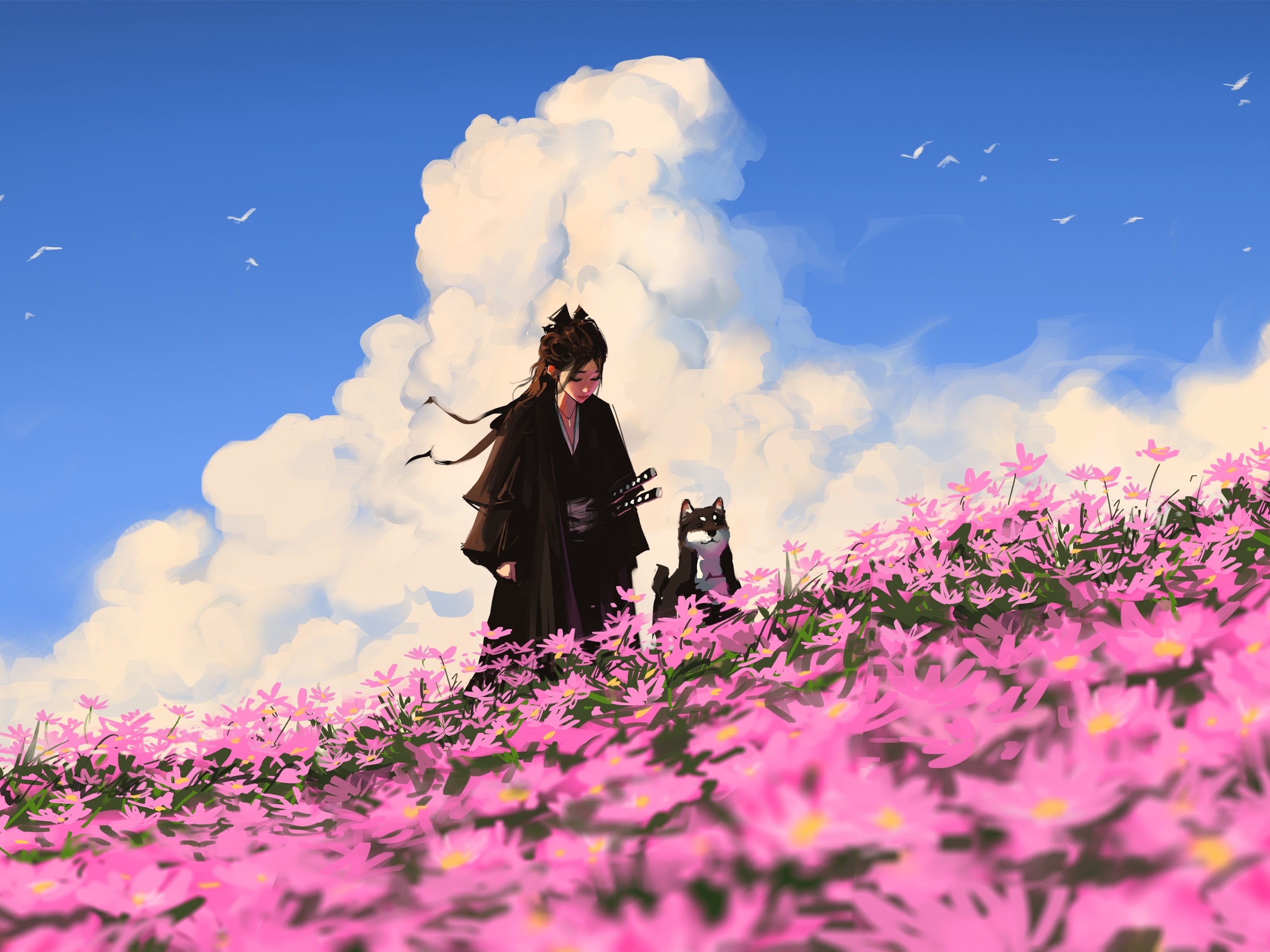 Anime, Samurai, Pet, Flowerfield 4K Desktop Wallpaper