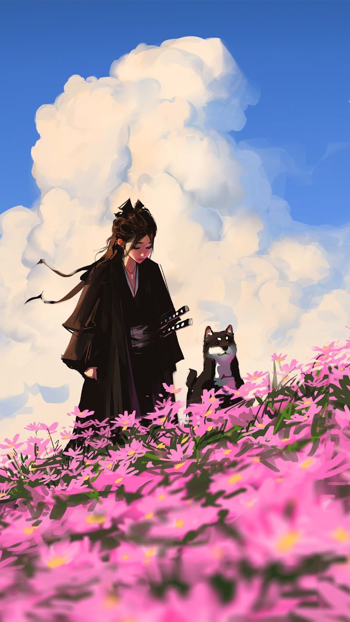 Anime, Samurai, Pet, Flowerfield 4K Desktop and Mobile Wallpaper Background with a maximum resolution of 3840x2160 px.