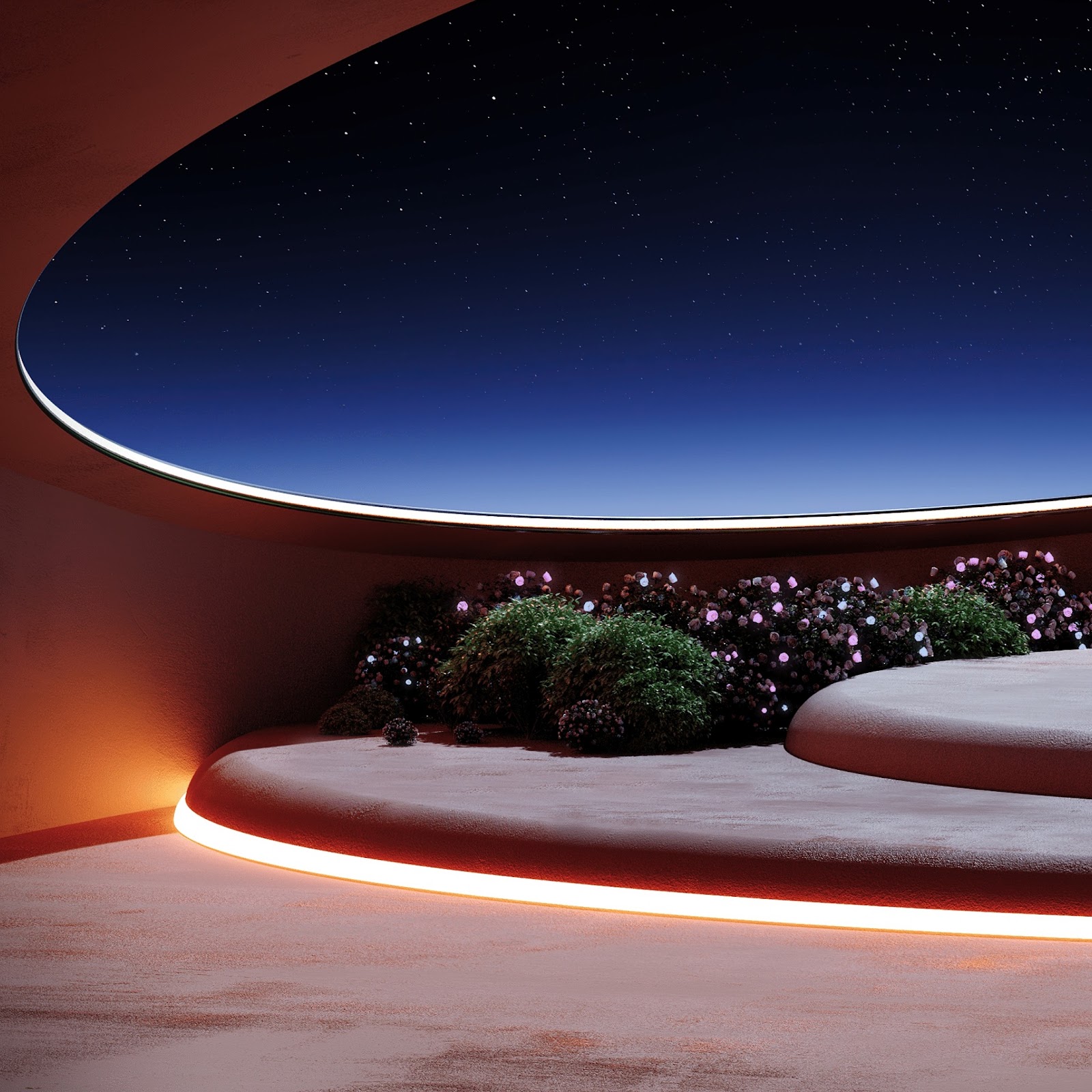 Futuristic Architecture, Night Sky, Modern Design, Outdoor Patio 4K Desktop and Mobile Wallpaper Background with a maximum resolution of 3840x2160 px.