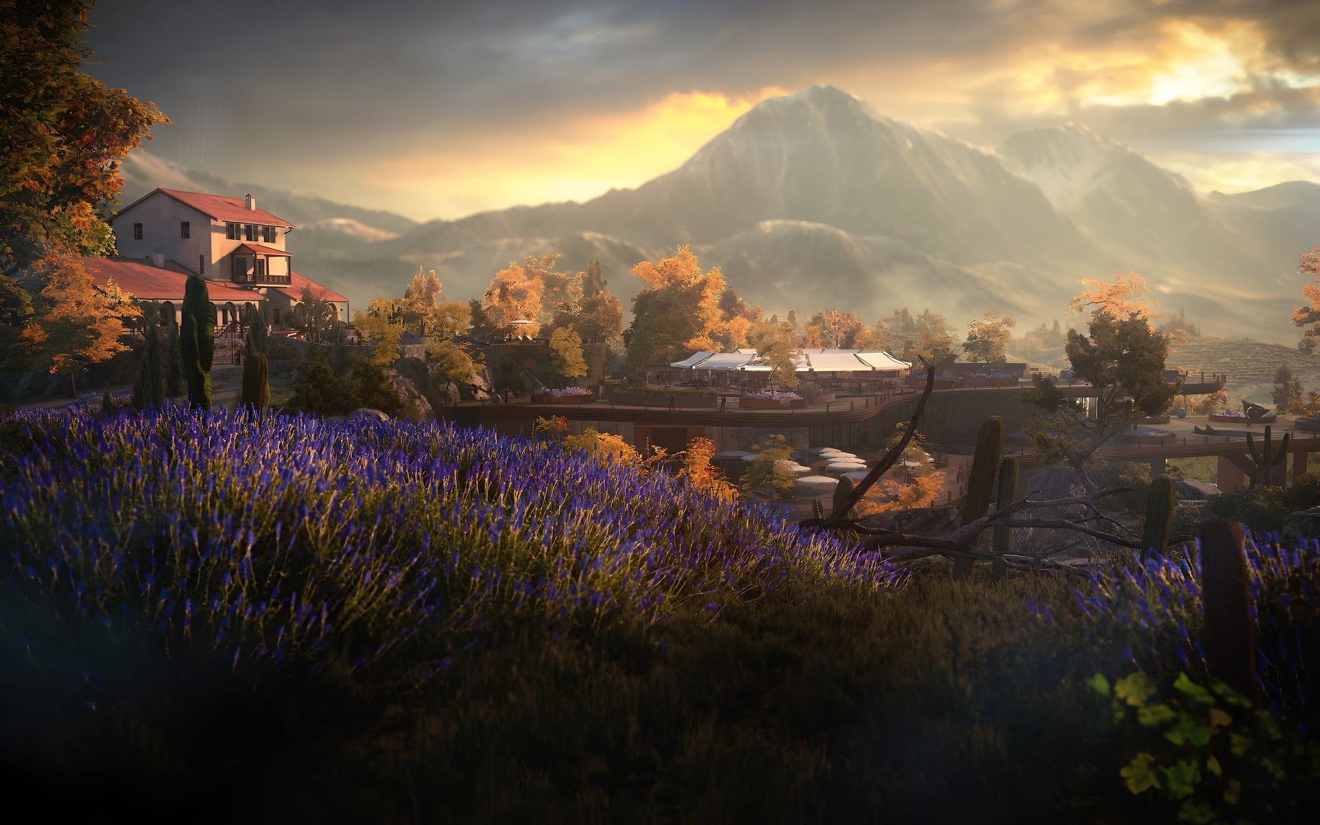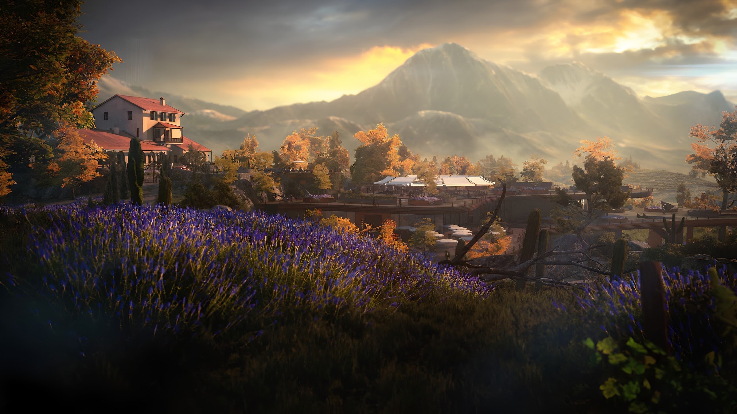 Italian Villa, Mountain Landscape, Lavender Field, Autumn Scenery 4K Desktop and Mobile Wallpaper Background with a maximum resolution of 3840x2160 px.