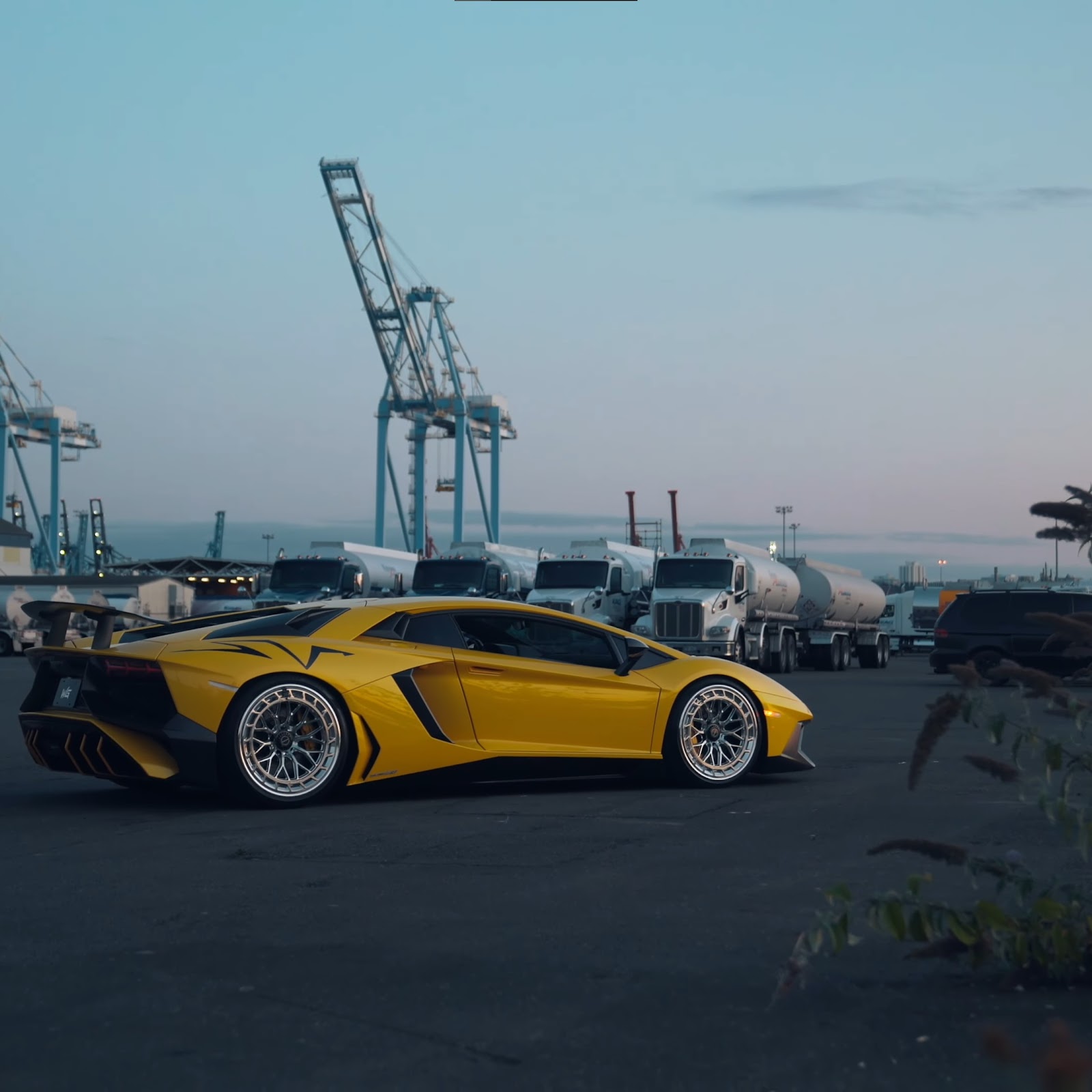 Lamborghini Aventador, Yellow Car, Industrial Port, Luxury Vehicle 4K Desktop and Mobile Wallpaper Background with a maximum resolution of 3840x2160 px.