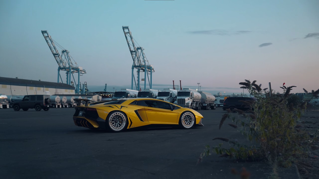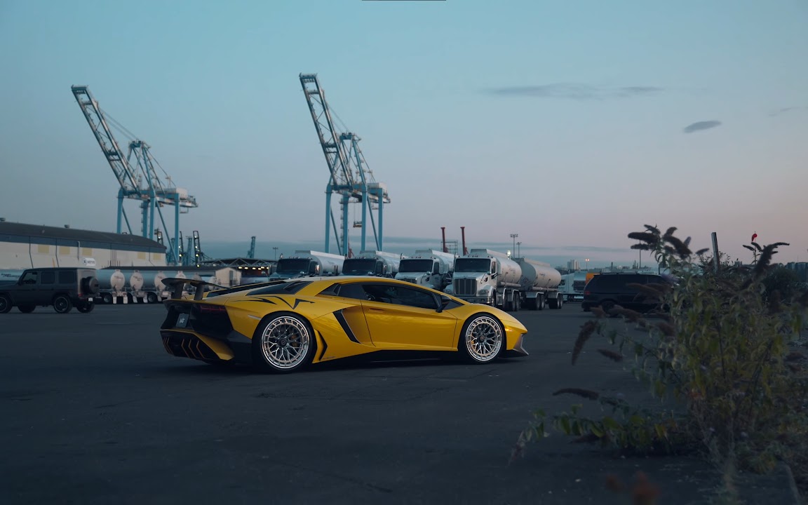 Lamborghini Aventador, Yellow Car, Industrial Port, Luxury Vehicle 4K Desktop and Mobile Wallpaper Background with a maximum resolution of 3840x2160 px.