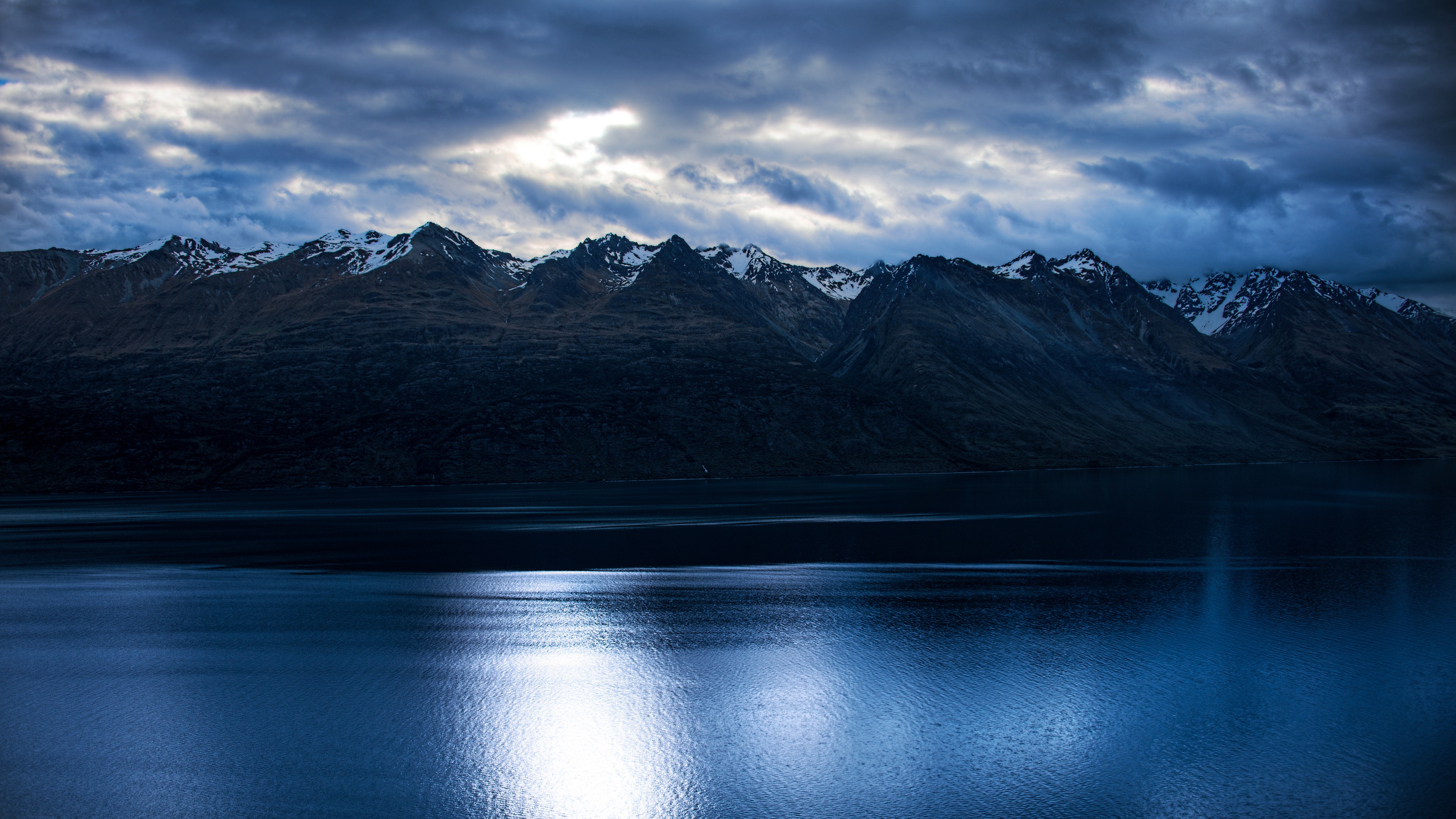 Mountain Lake, Dark Sky, Scenic Landscape, Nature Photography 4K Desktop and Mobile Wallpaper Background with a maximum resolution of 3840x2160 px.