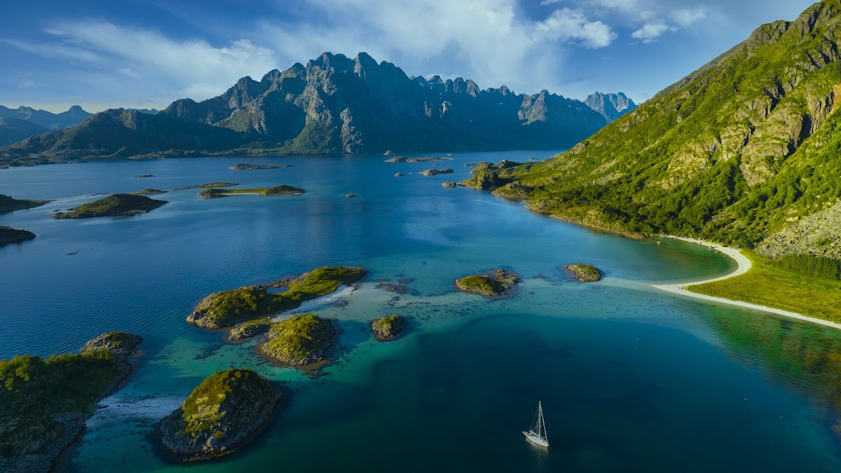 Mountain Lake, Fjord, Sailing, Scenic Landscape 5K Desktop and Mobile Wallpaper Background with a maximum resolution of 5120x2880 px.