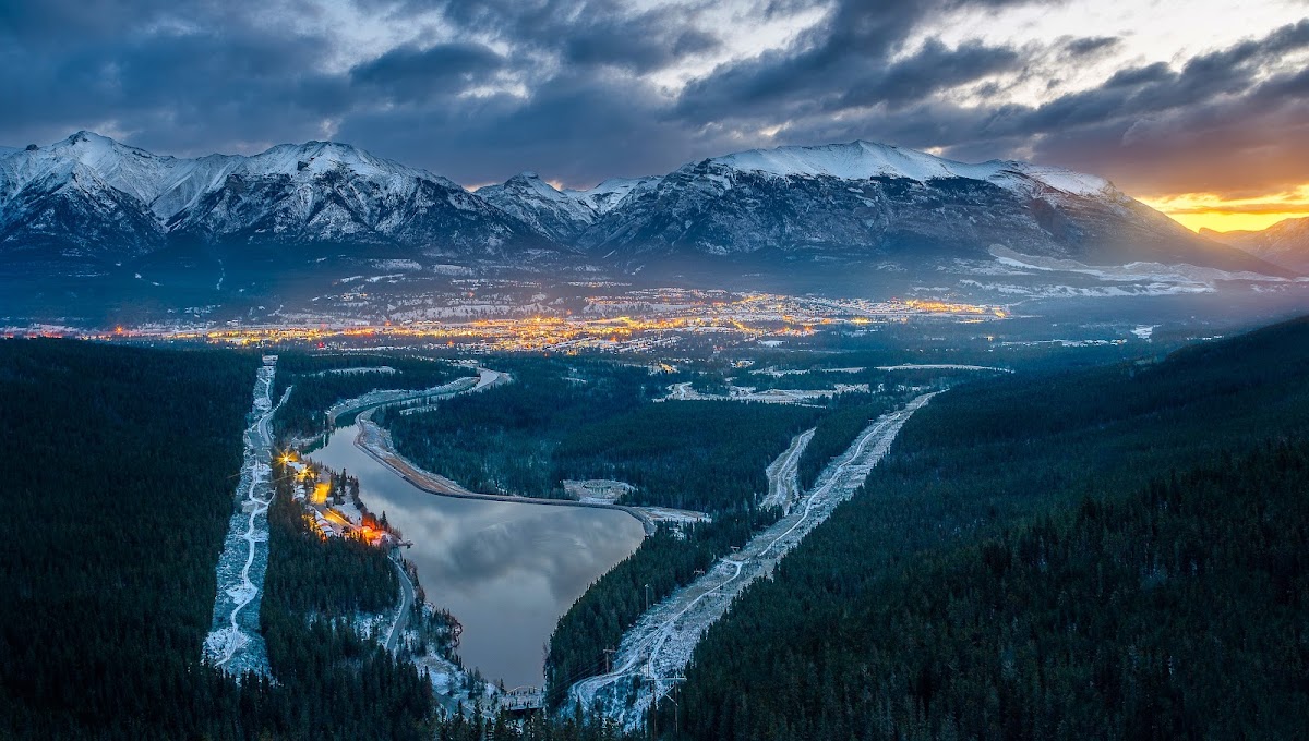 Mountain Landscape, City Lights, Snowy Peaks, Aerial View 5K Desktop Wallpaper