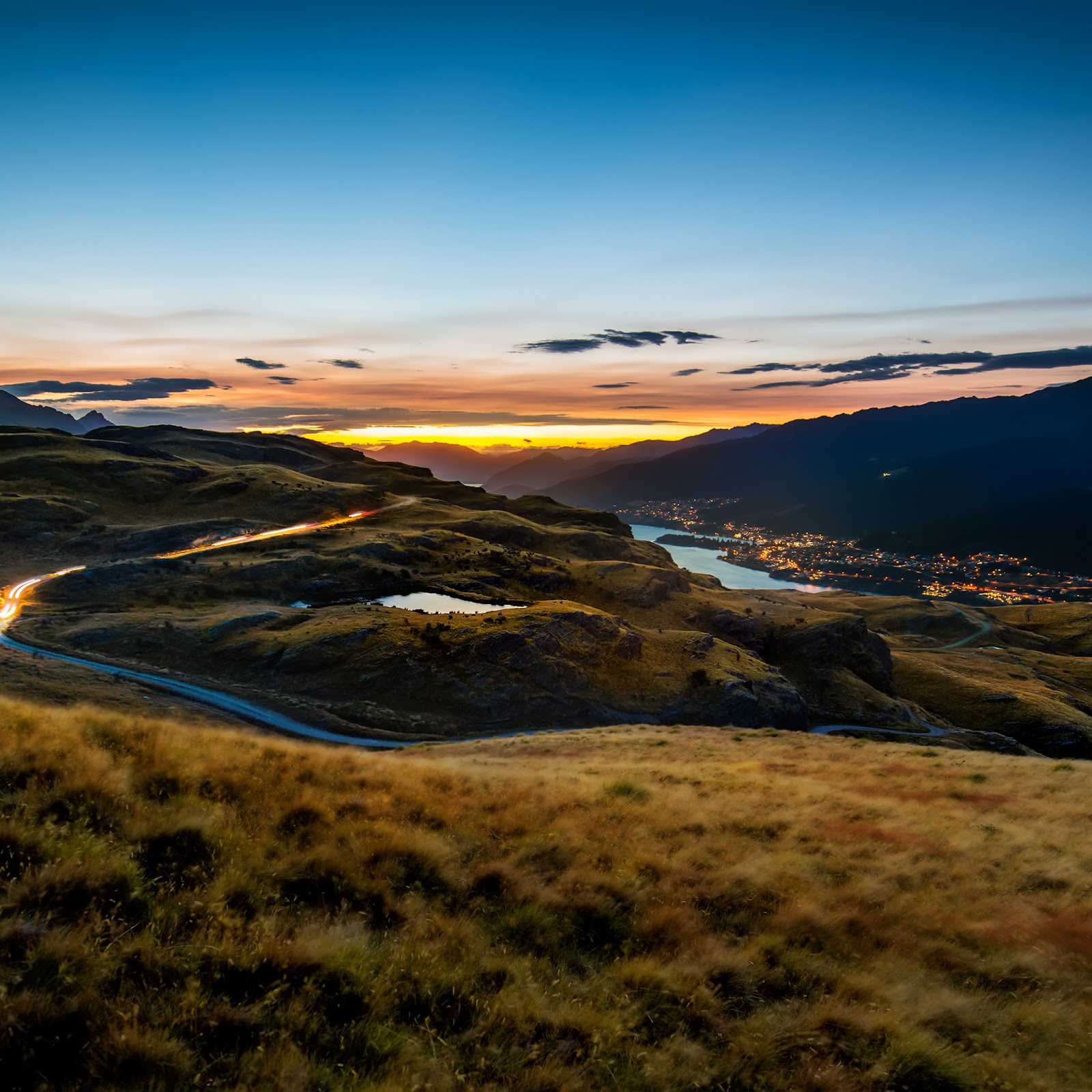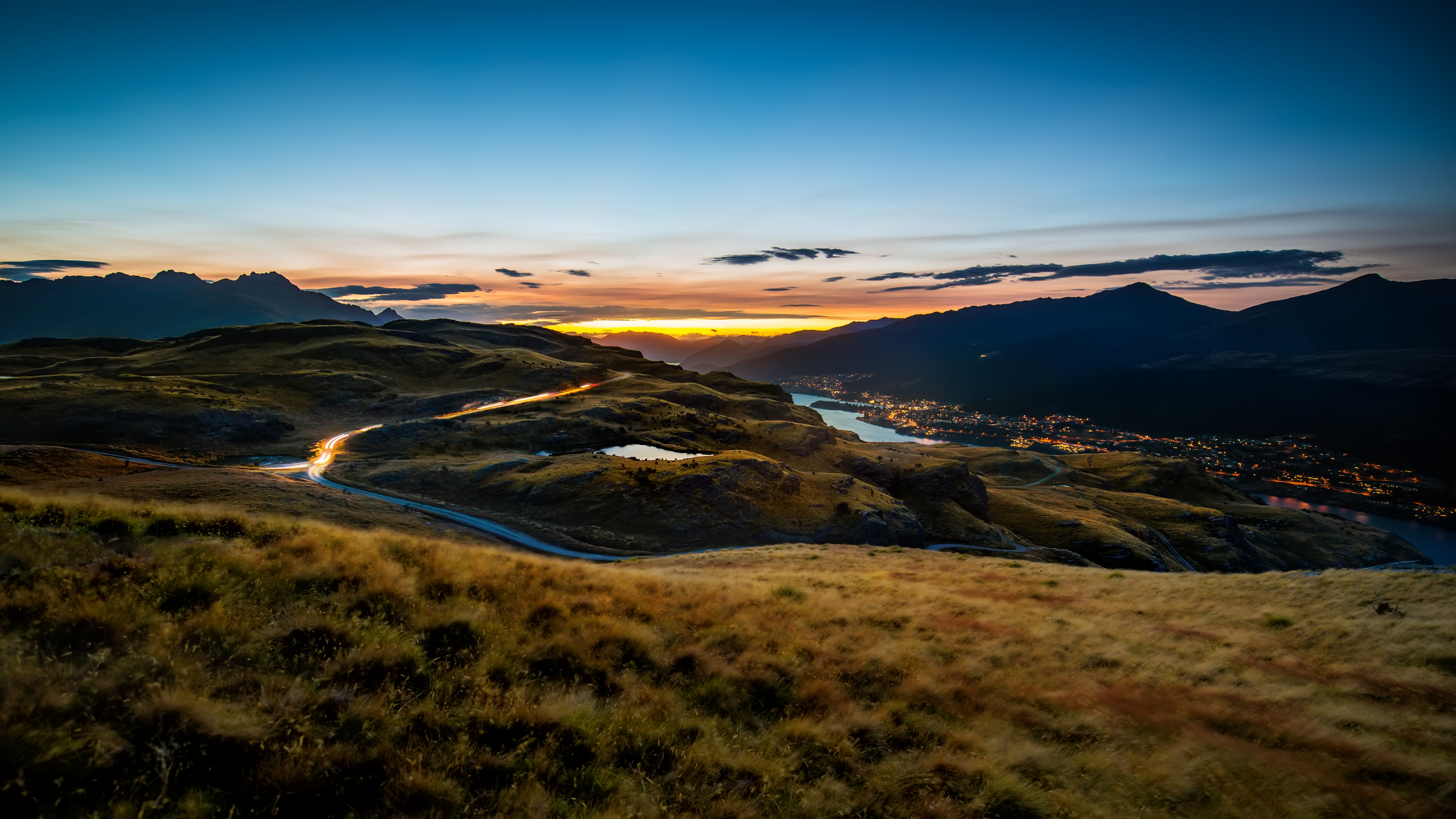 Mountain Landscape, Scenic View, Sunset, Night City 4K Desktop Wallpaper