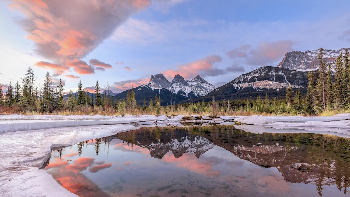 Mountain Reflection, Snowy Landscape, Pink Cloud, Canadian Rockies 5K Wallpaper Background (5472x3078)