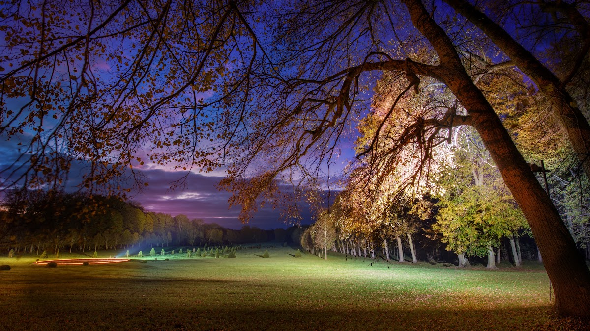 Night Landscape, Autumn Trees, Park Scene, Outdoor Lighting 4K Desktop and Mobile Wallpaper Background with a maximum resolution of 3840x2160 px.