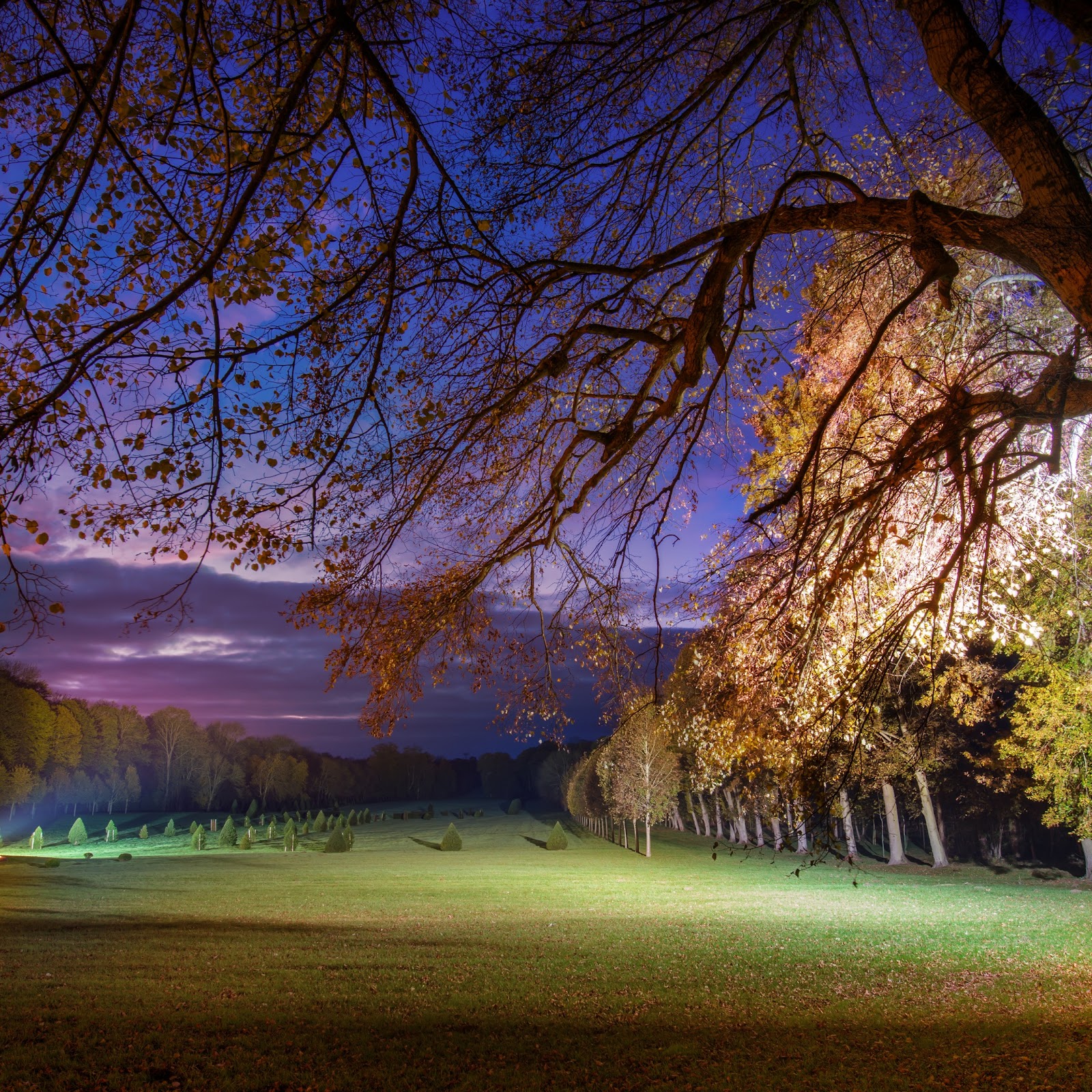 Night Landscape, Autumn Trees, Park Scene, Outdoor Lighting 4K Desktop and Mobile Wallpaper Background with a maximum resolution of 3840x2160 px.