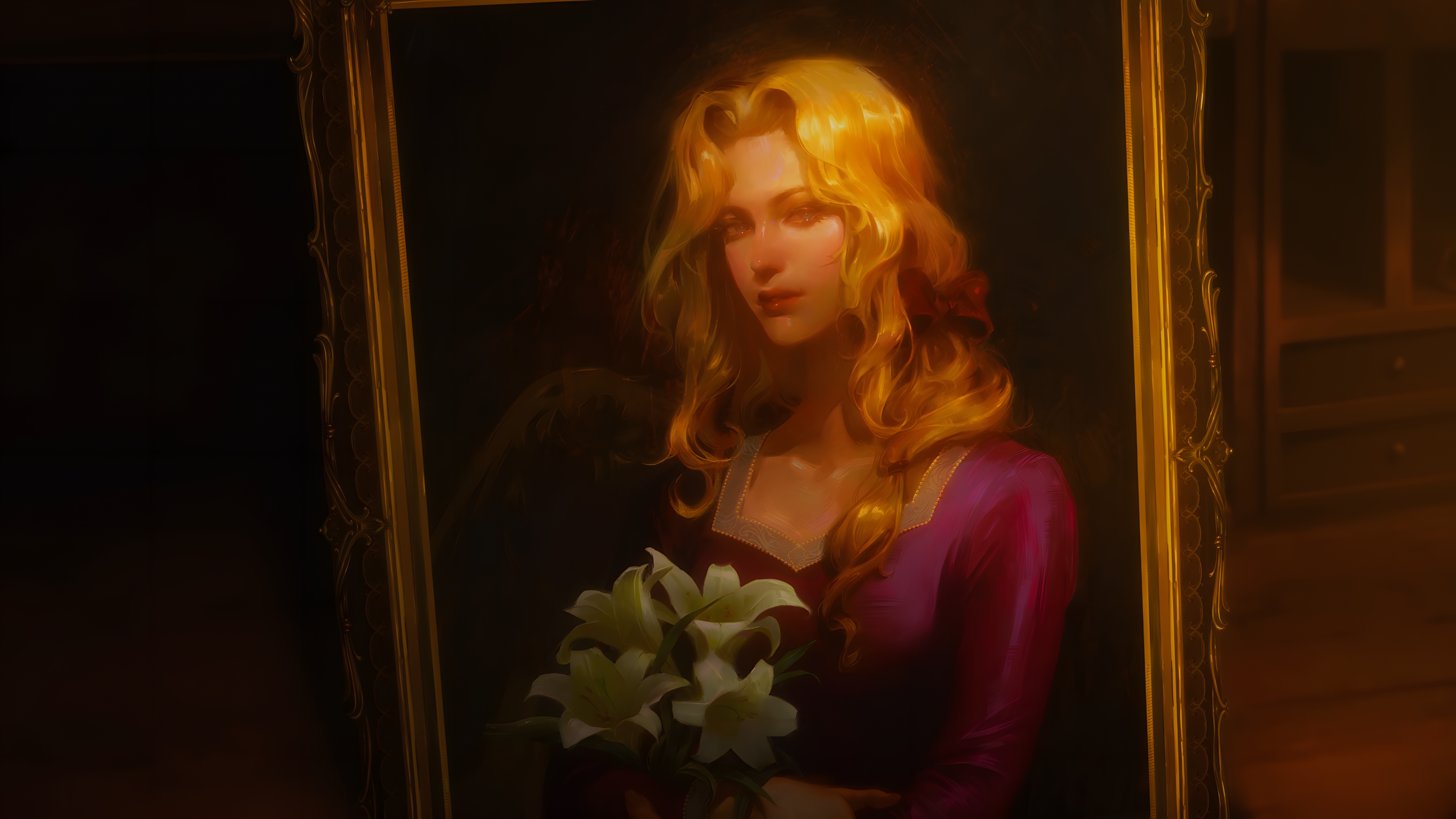 Portrait, Digital Art, Golden Frame, Female Character 4K Desktop Wallpaper