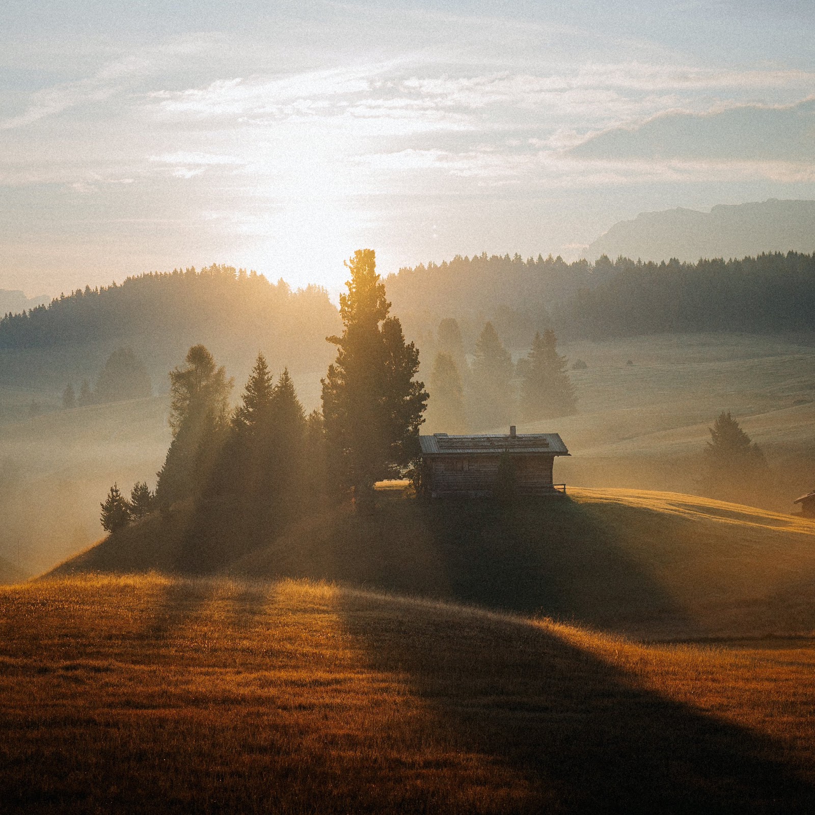 Sunrise, Mountain Landscape, Cabin, Foggy Morning 4K Desktop and Mobile Wallpaper Background with a maximum resolution of 4096x2732 px.