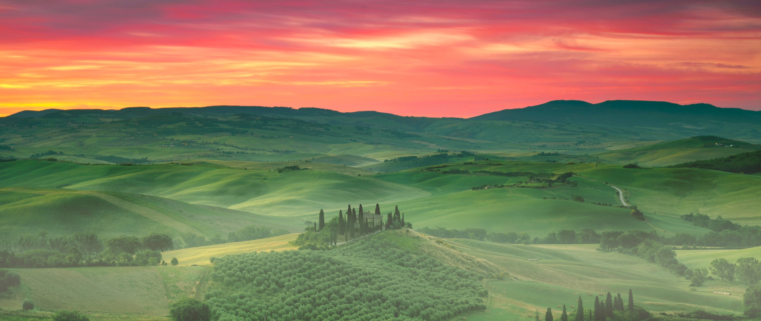 Tuscan Landscape, Italy, Sunset, Rolling Hills 5K Desktop and Mobile Wallpaper Background with a maximum resolution of 6000x3372 px.