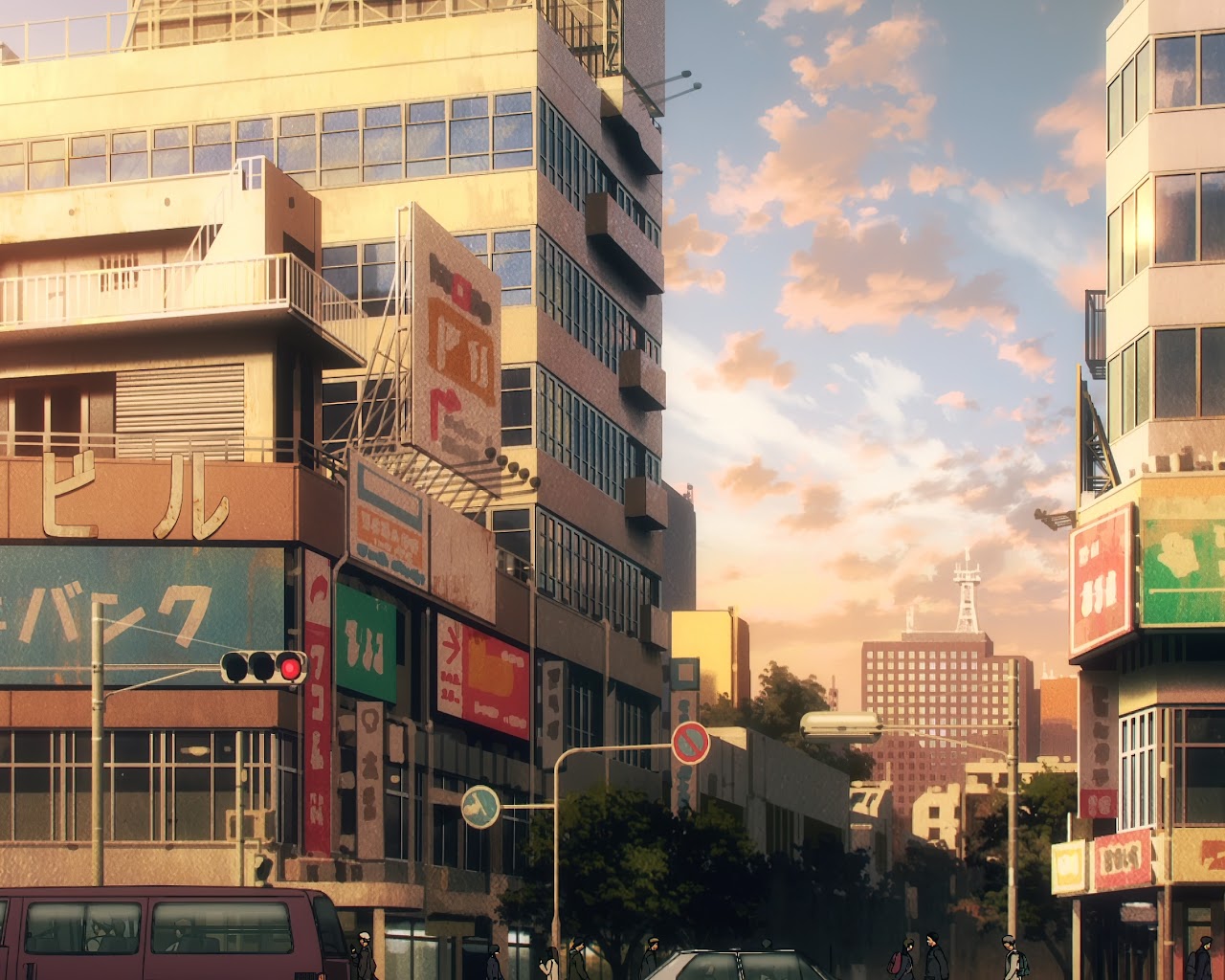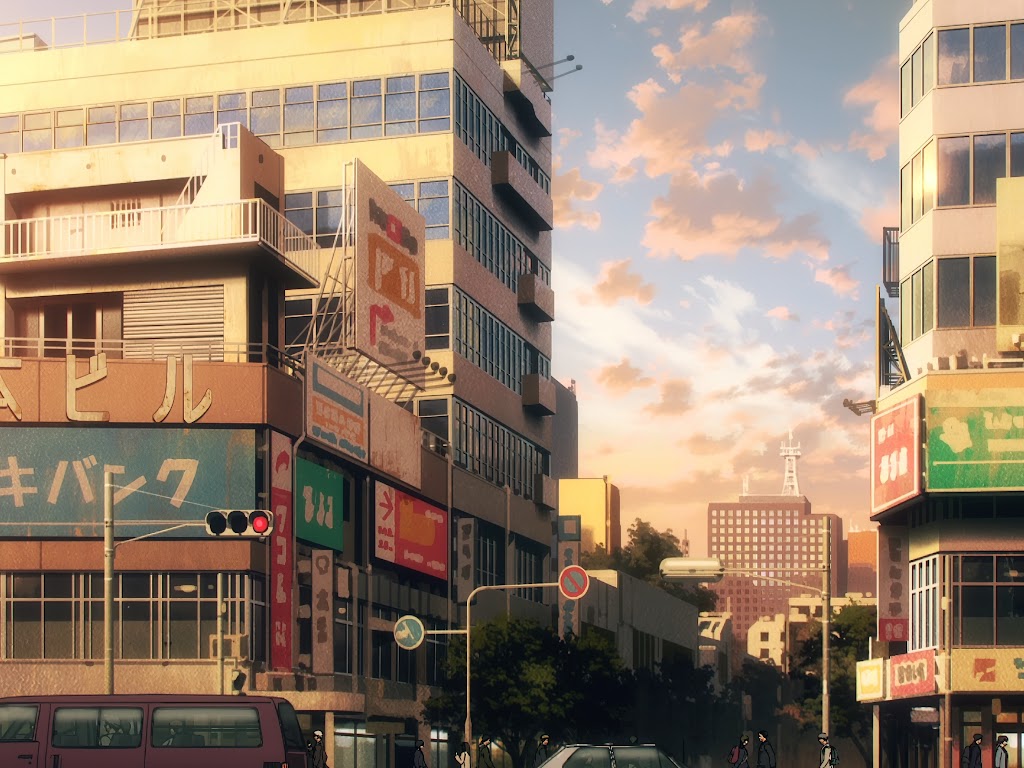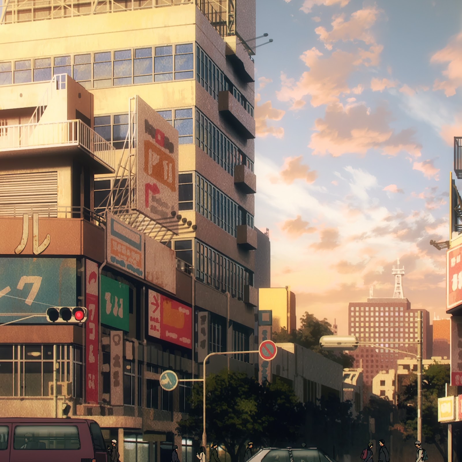 Urban Cityscape, Anime Art, Street Scene, Building Architecture 4K Desktop and Mobile Wallpaper Background with a maximum resolution of 3840x2160 px.