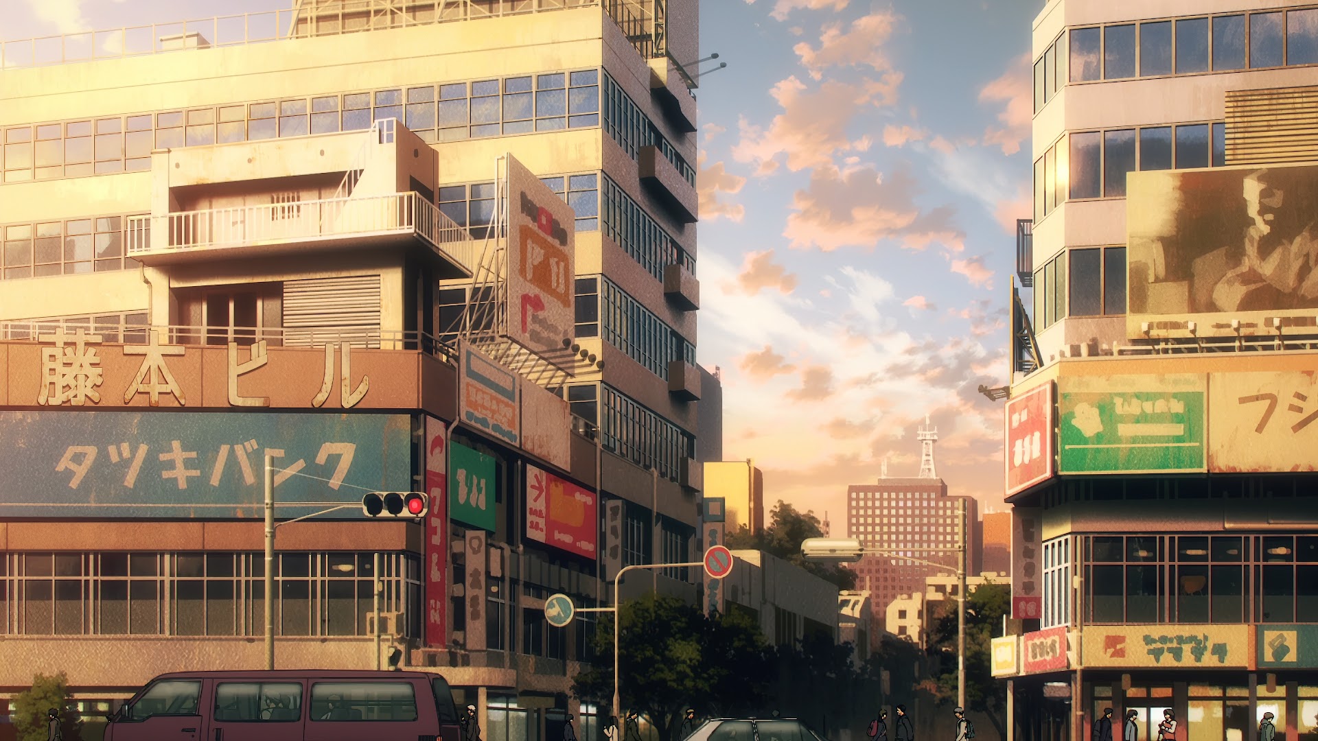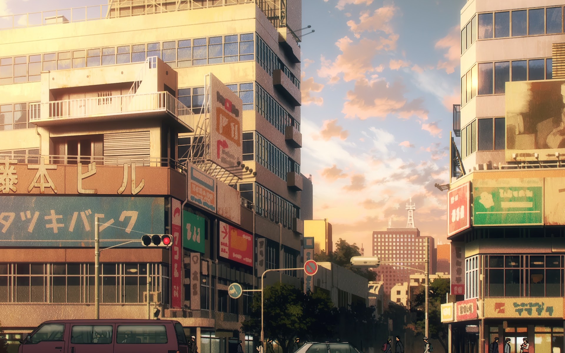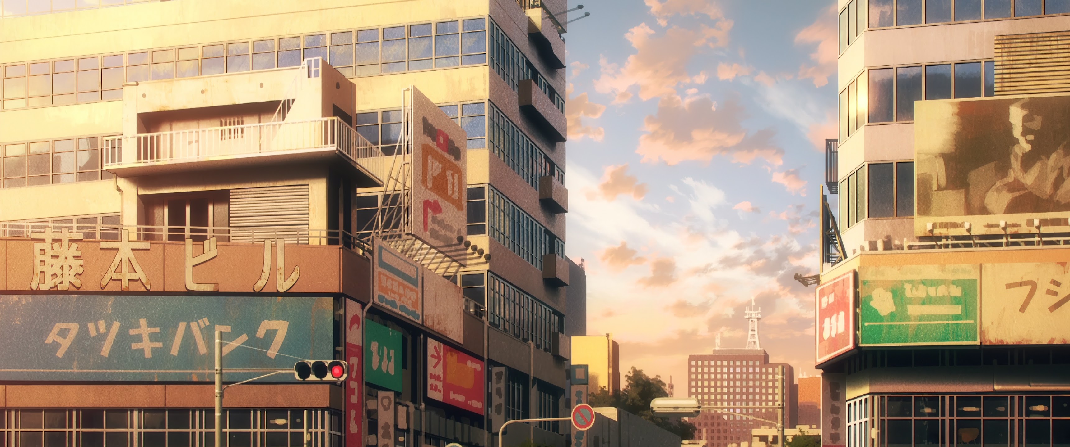 Urban Cityscape, Anime Art, Street Scene, Building Architecture 4K Desktop and Mobile Wallpaper Background with a maximum resolution of 3840x2160 px.