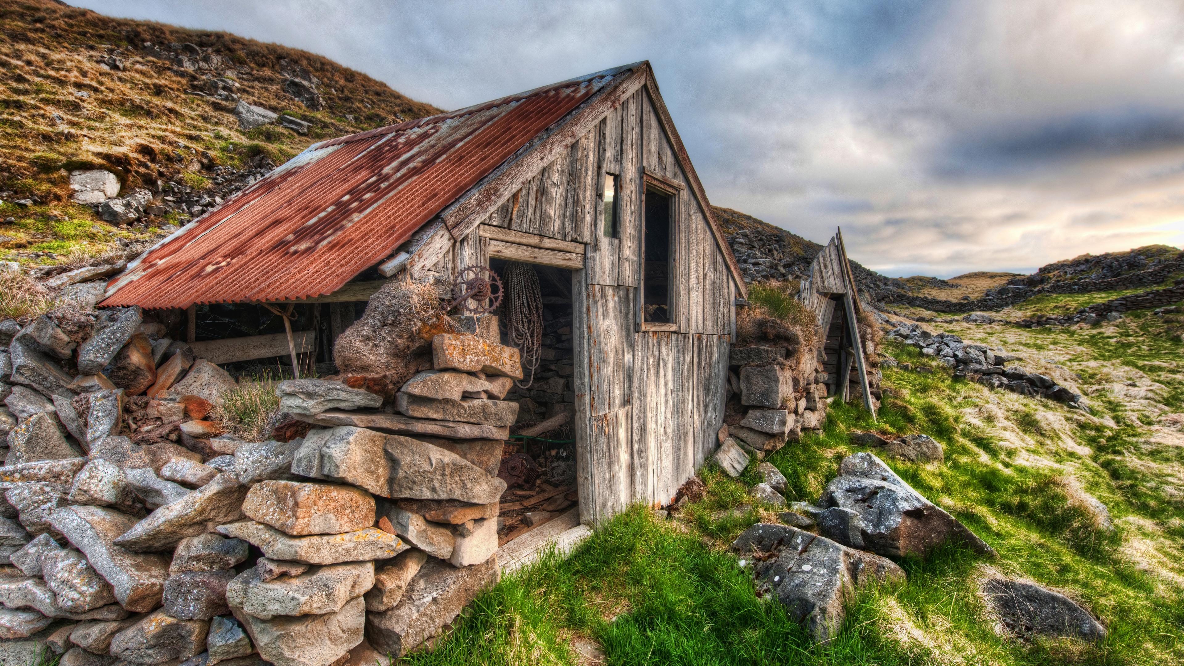 Abandoned Building, Rural Landscape, Stone Structure, Derelict Shed 4K Desktop Wallpaper