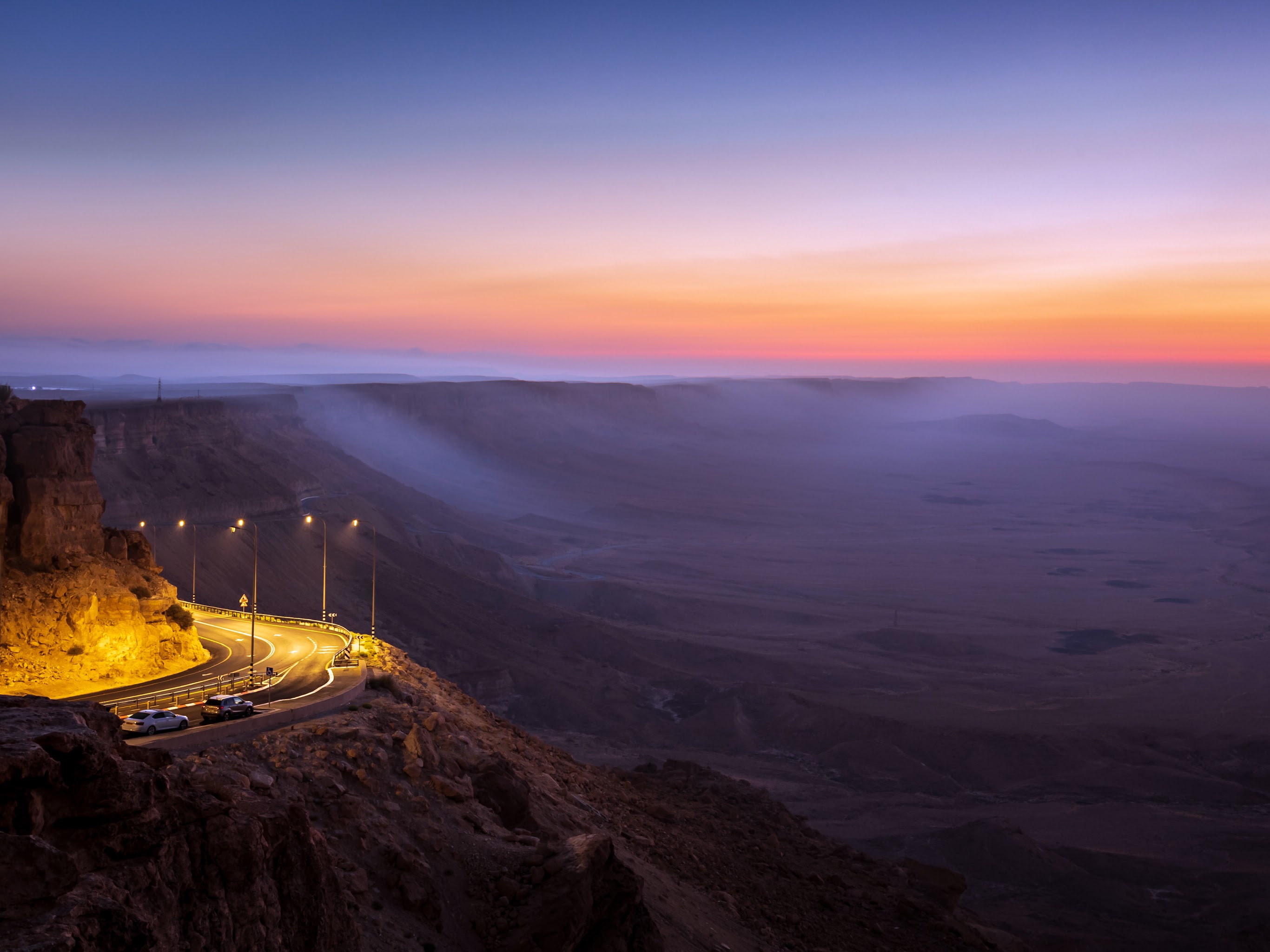 Desert Landscape, Road Trip, Sunrise, Scenic View 5K Desktop and Mobile Wallpaper Background with a maximum resolution of 5120x2880 px.
