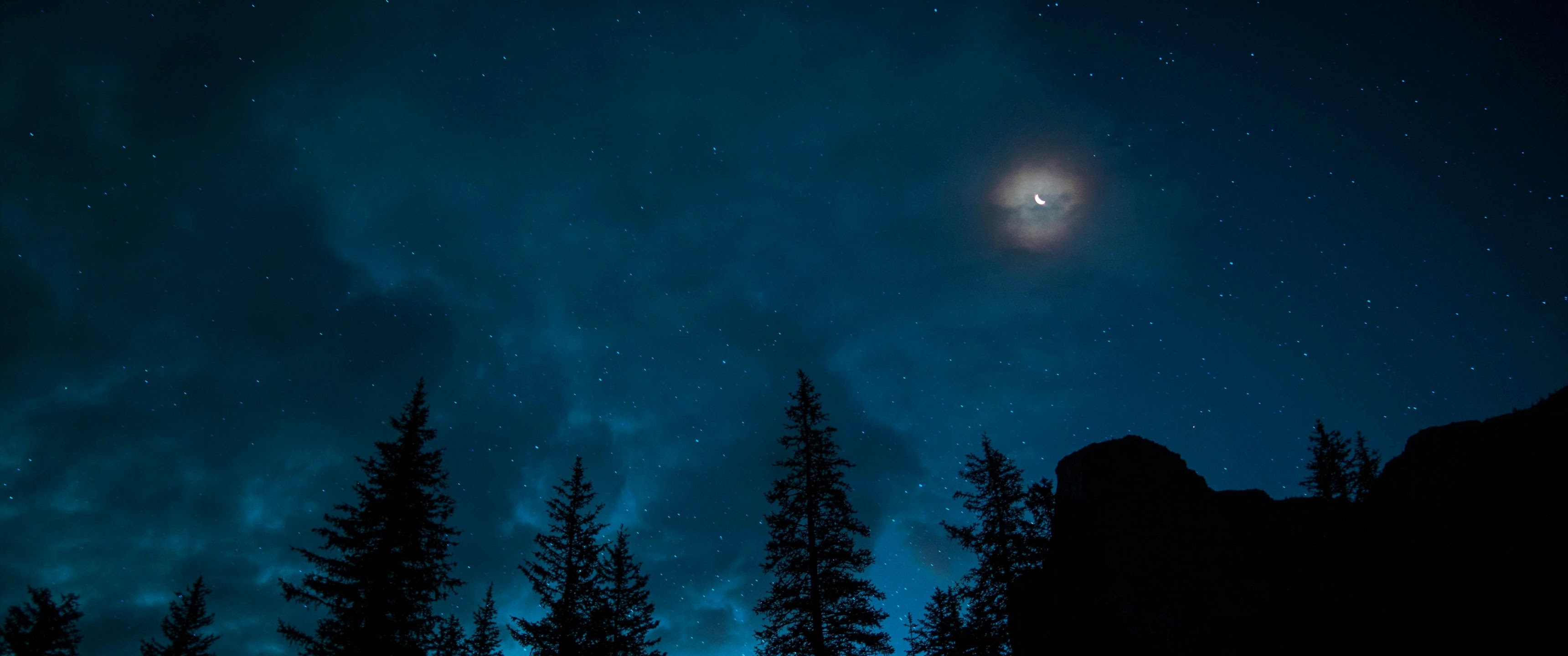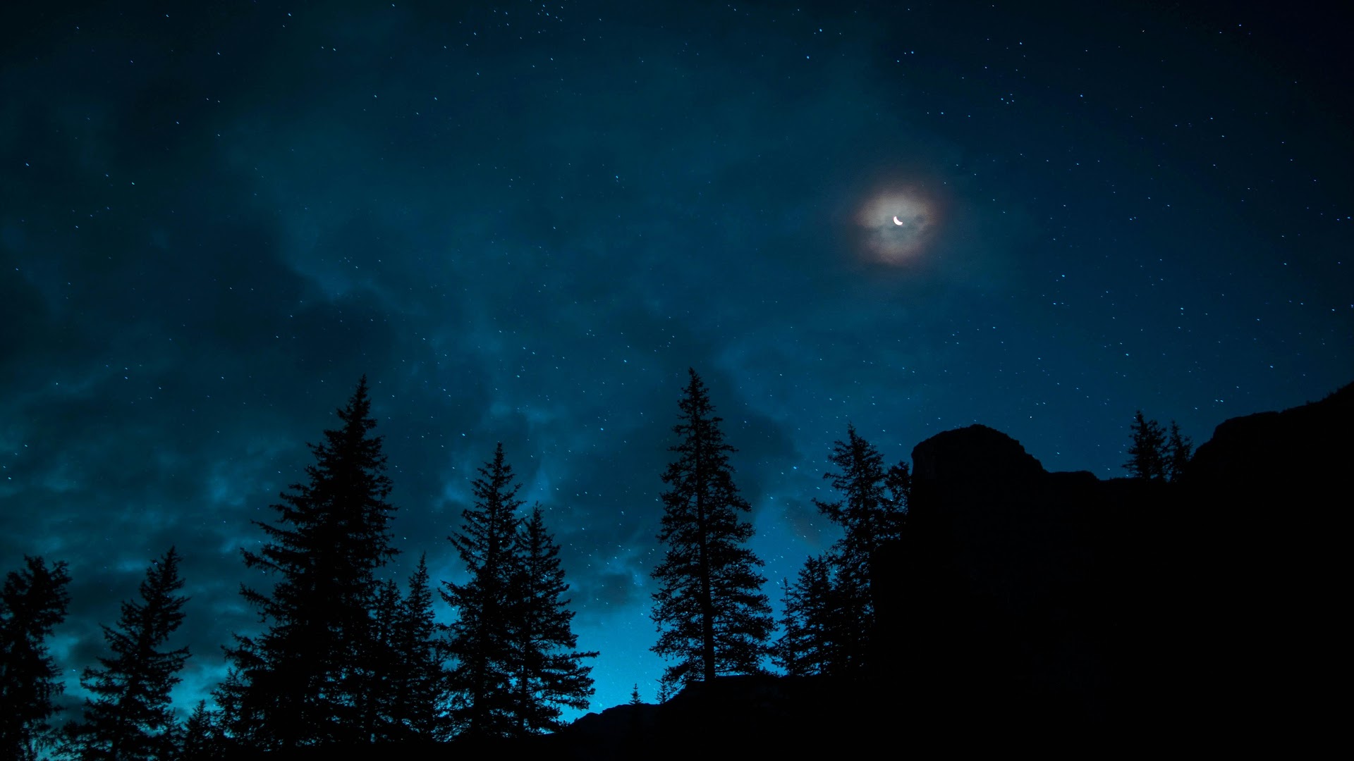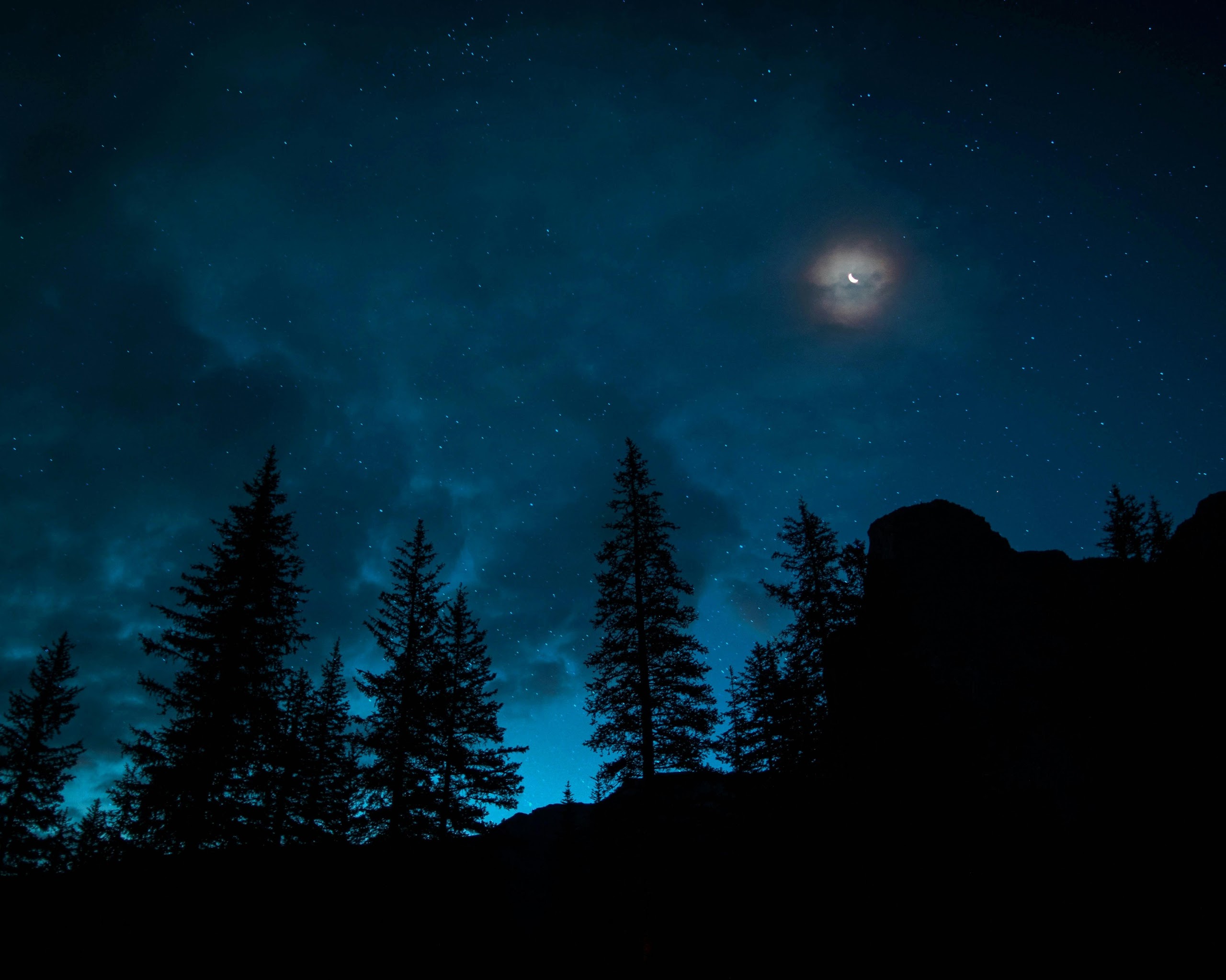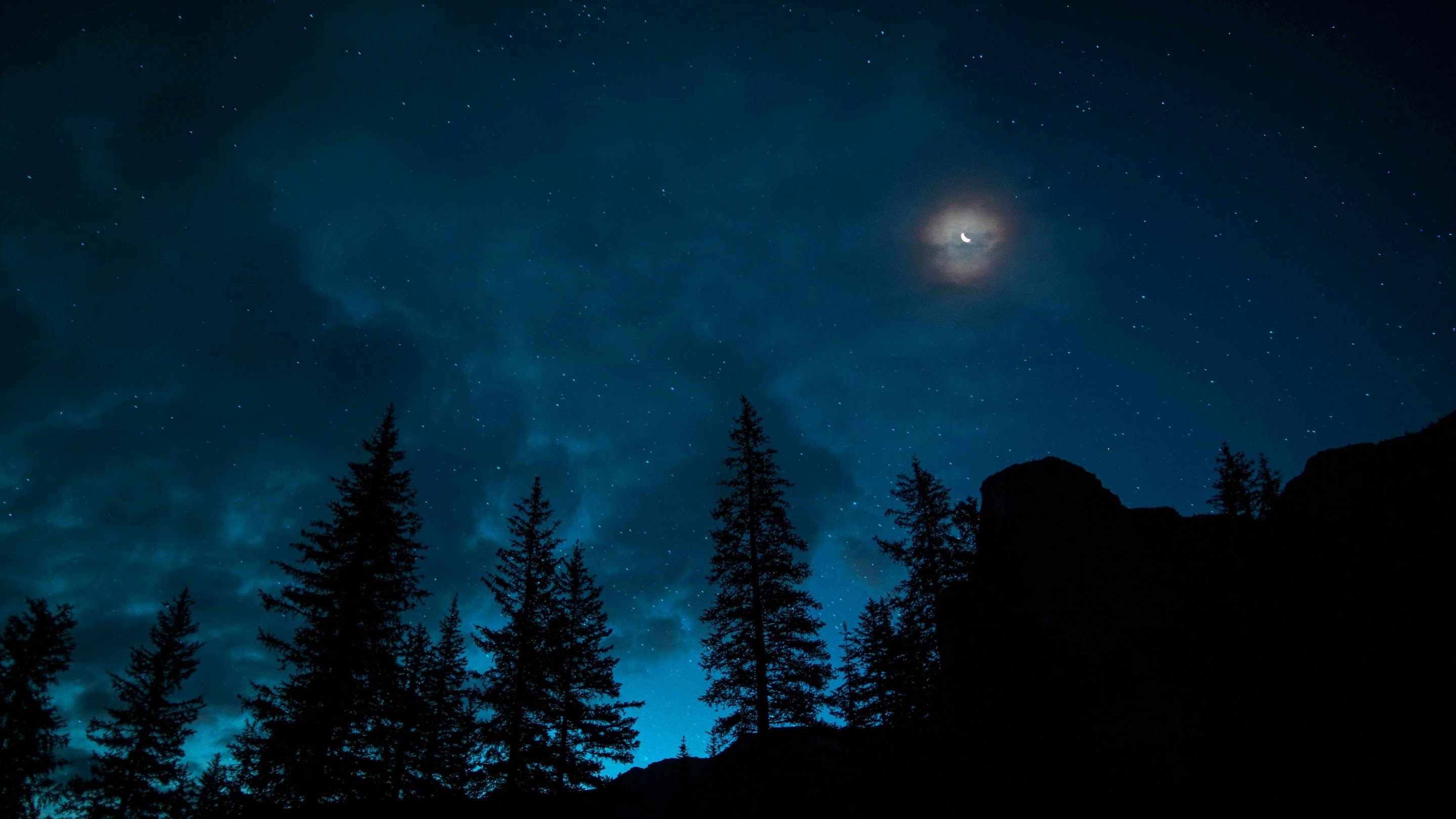 Night Sky, Pine Trees, Moonlight, Stars 5K Desktop and Mobile Wallpaper Background with a maximum resolution of 5472x3648 px.