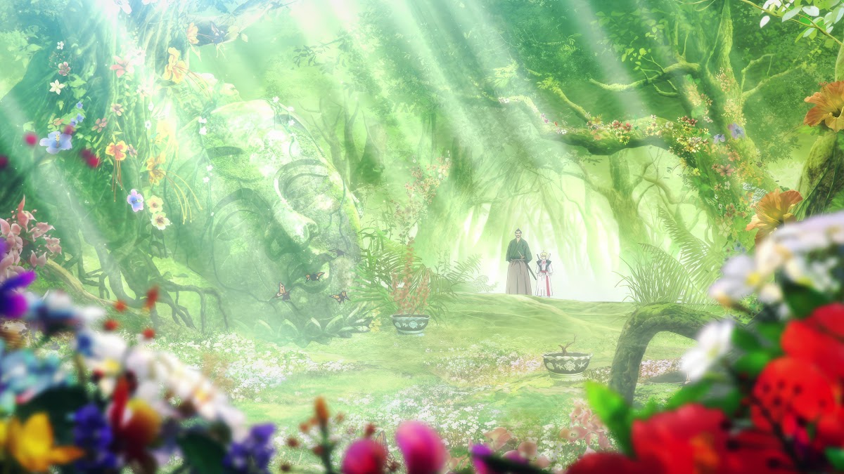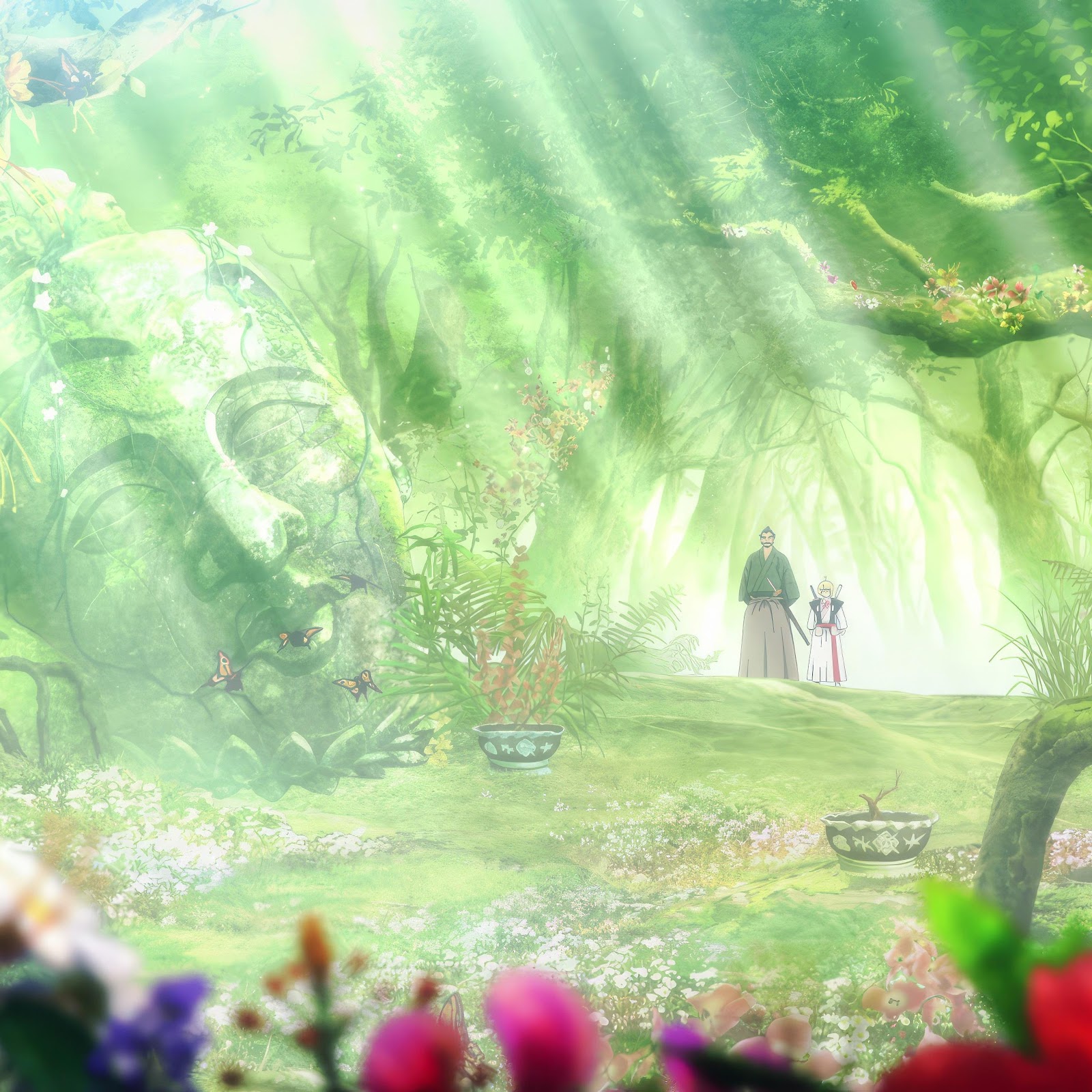 Anime Landscape, Fantasy Forest, Light Rays, Floral Garden 4K Desktop and Mobile Wallpaper Background with a maximum resolution of 4627x2603 px.