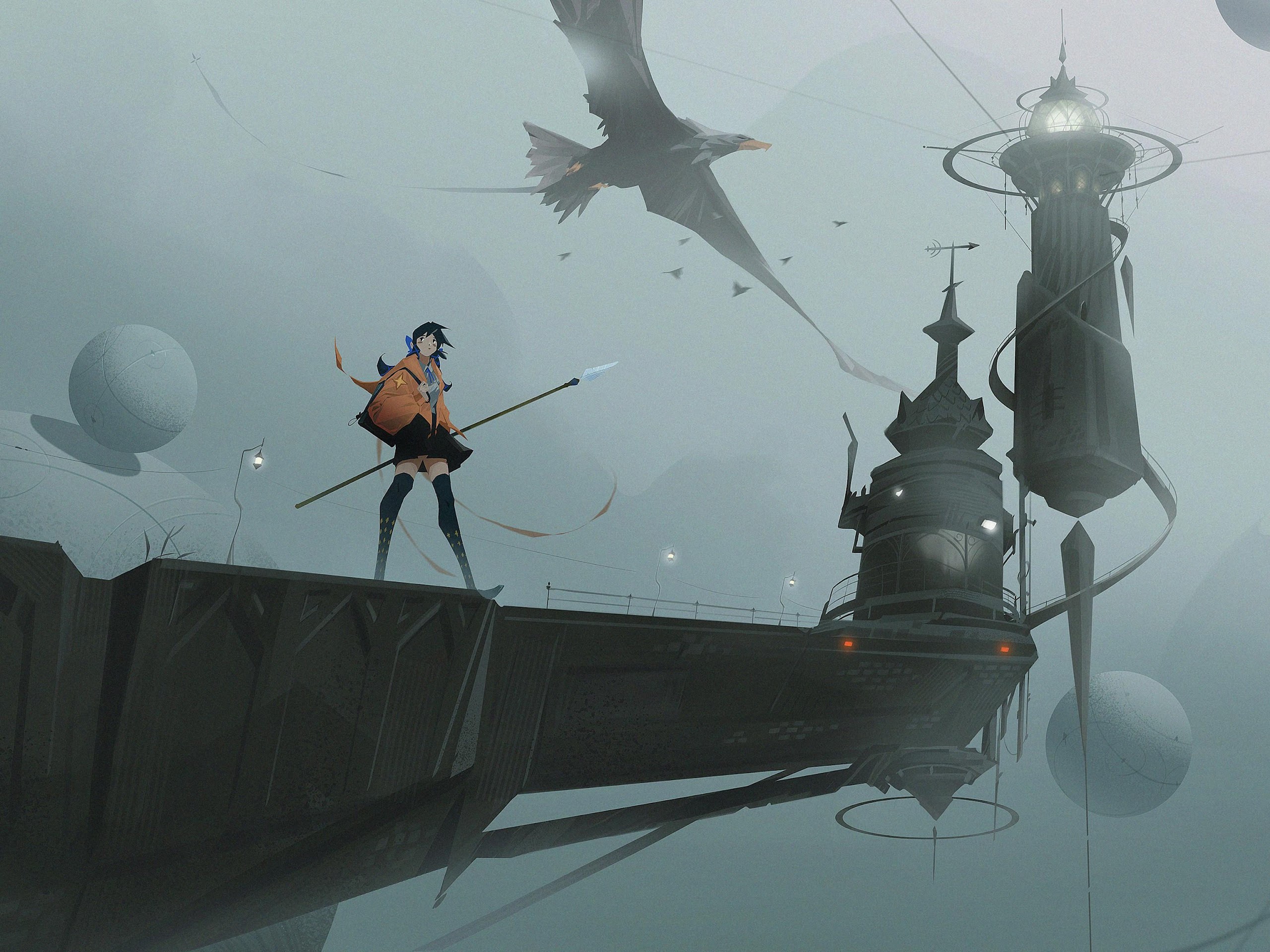 Fantasy Artwork, Anime Landscape, Bird Illustration, Floating Architecture 4K Desktop and Mobile Wallpaper Background with a maximum resolution of 3840x2303 px.