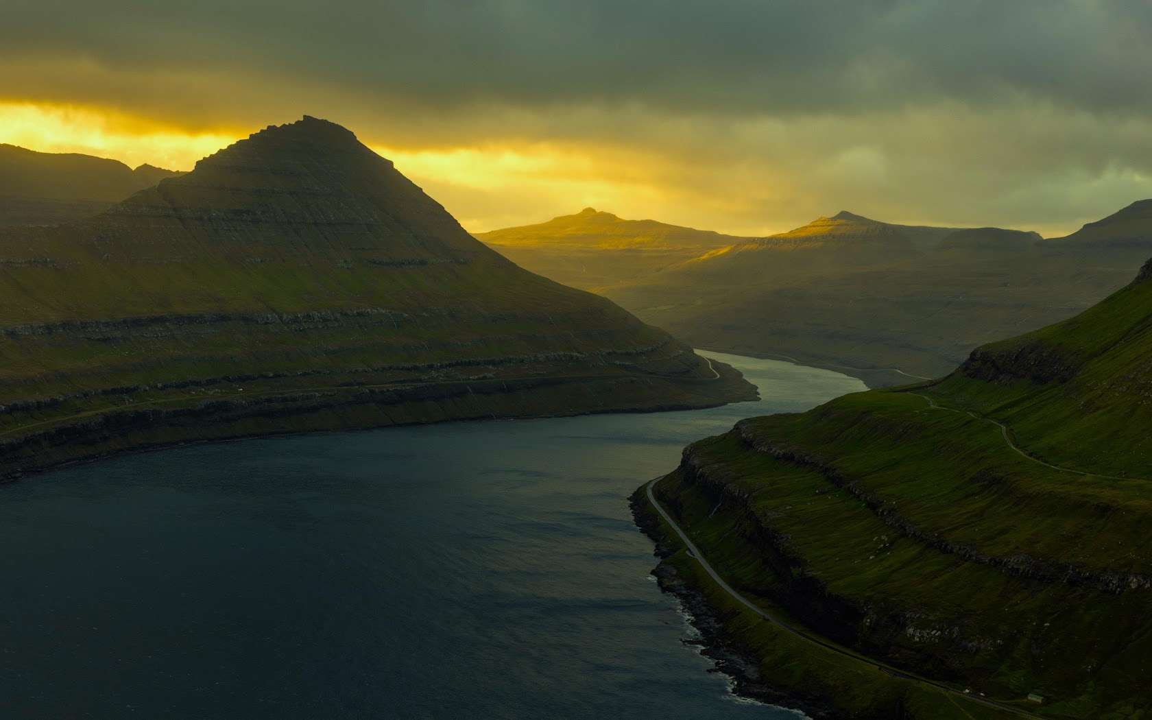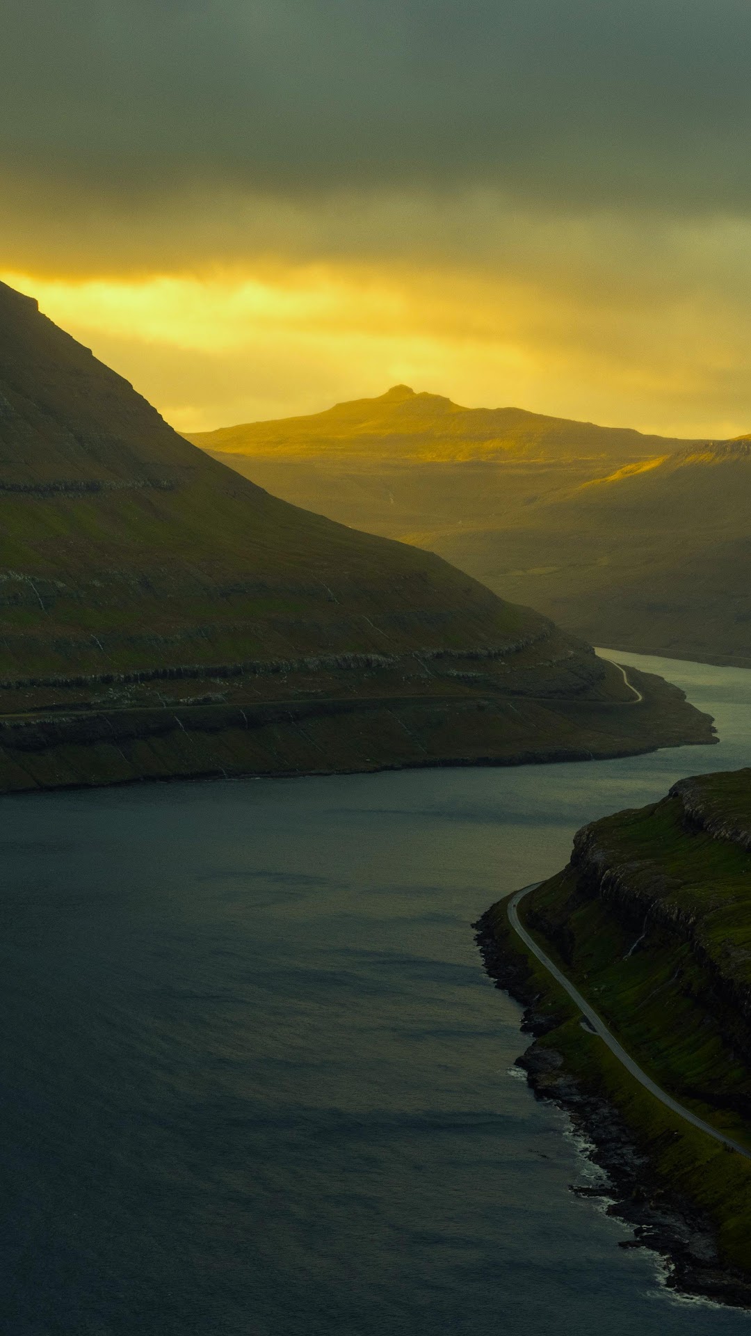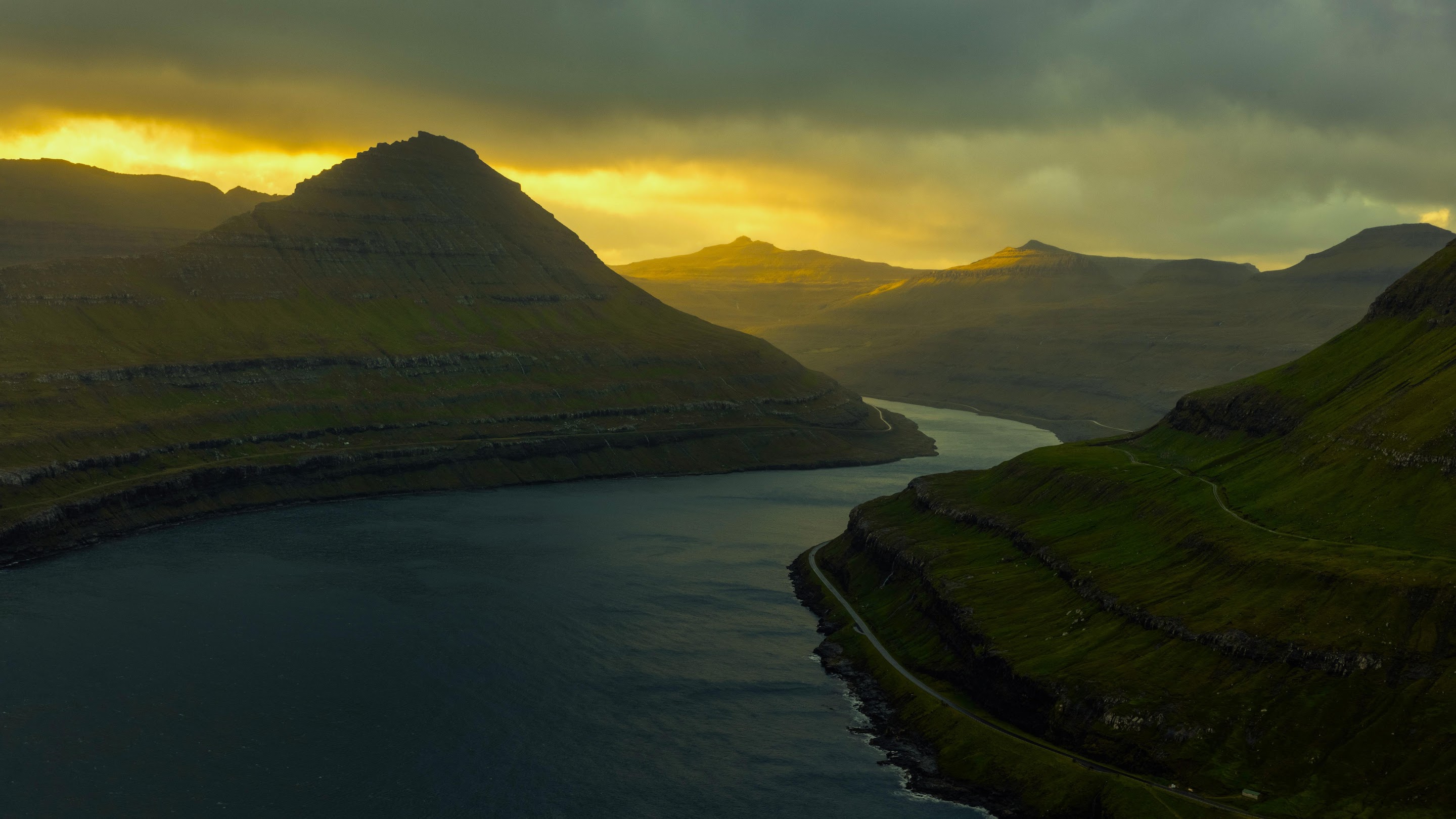 Faroe Islands, Mountain Landscape, Fjord, Scenic View 5K Desktop and Mobile Wallpaper Background with a maximum resolution of 6144x3456 px.