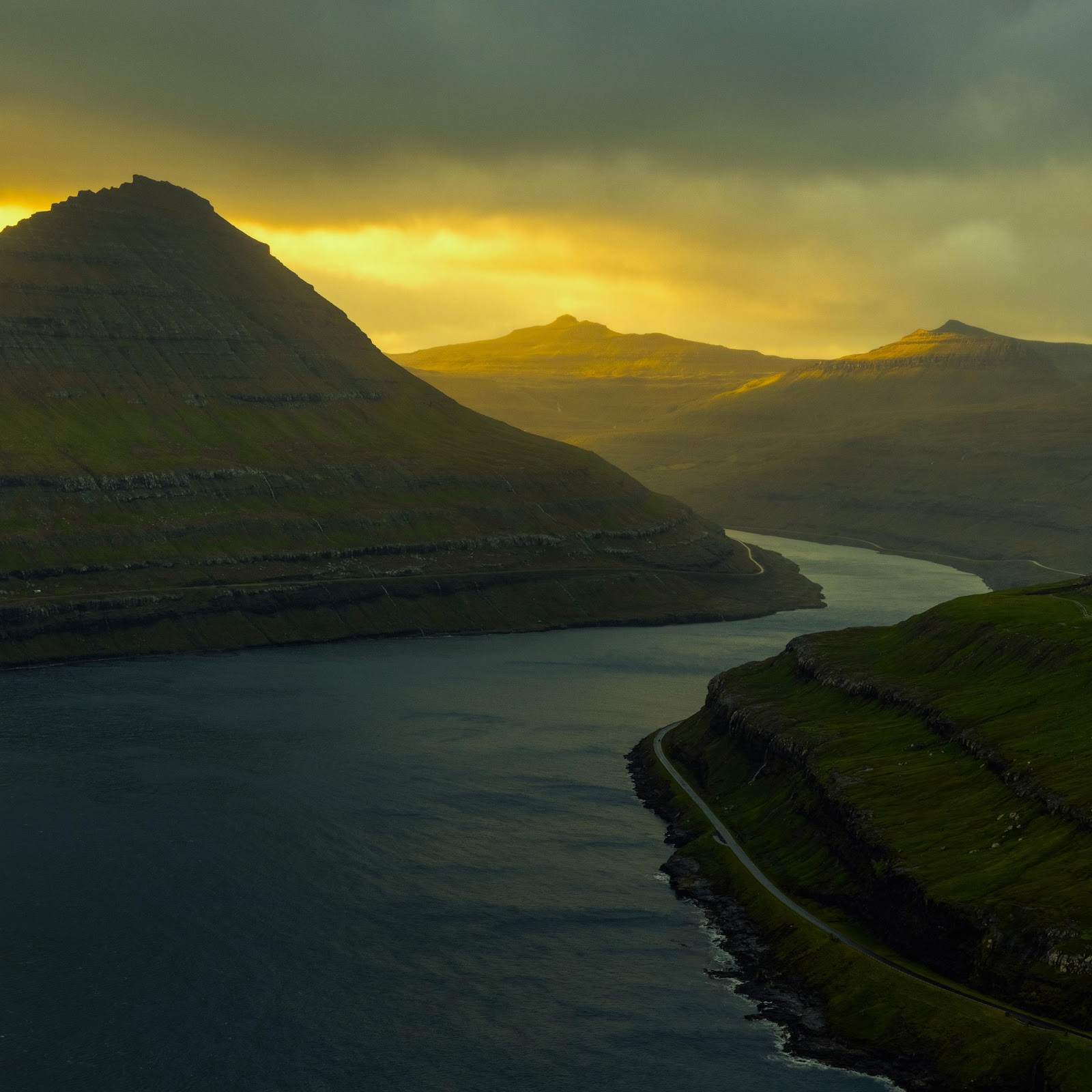 Faroe Islands, Mountain Landscape, Fjord, Scenic View 5K Desktop and Mobile Wallpaper Background with a maximum resolution of 6144x3456 px.
