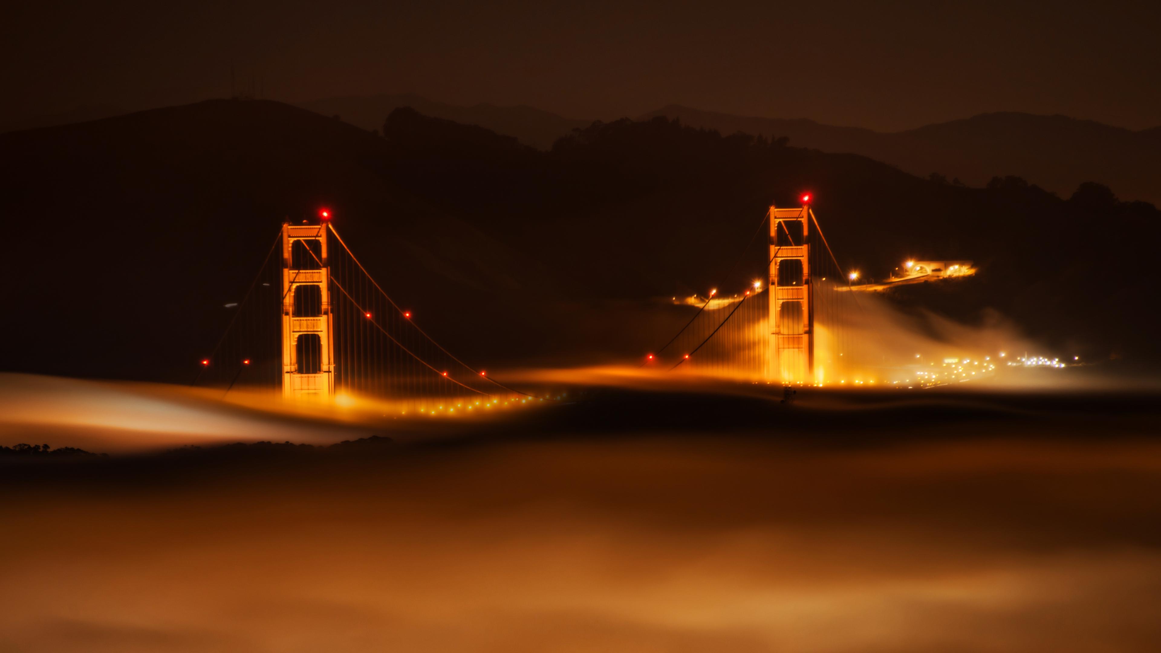Golden Gate Bridge, San Francisco, Night Photography, Fogscape 4K Desktop and Mobile Wallpaper Background with a maximum resolution of 3840x2160 px.