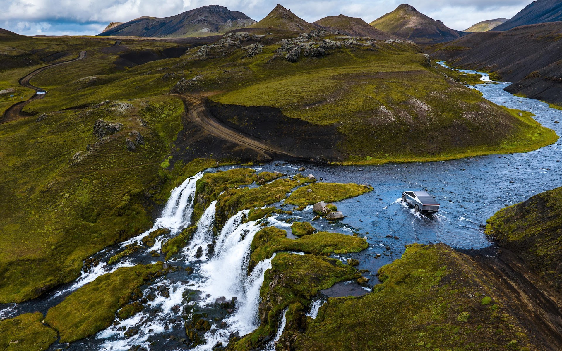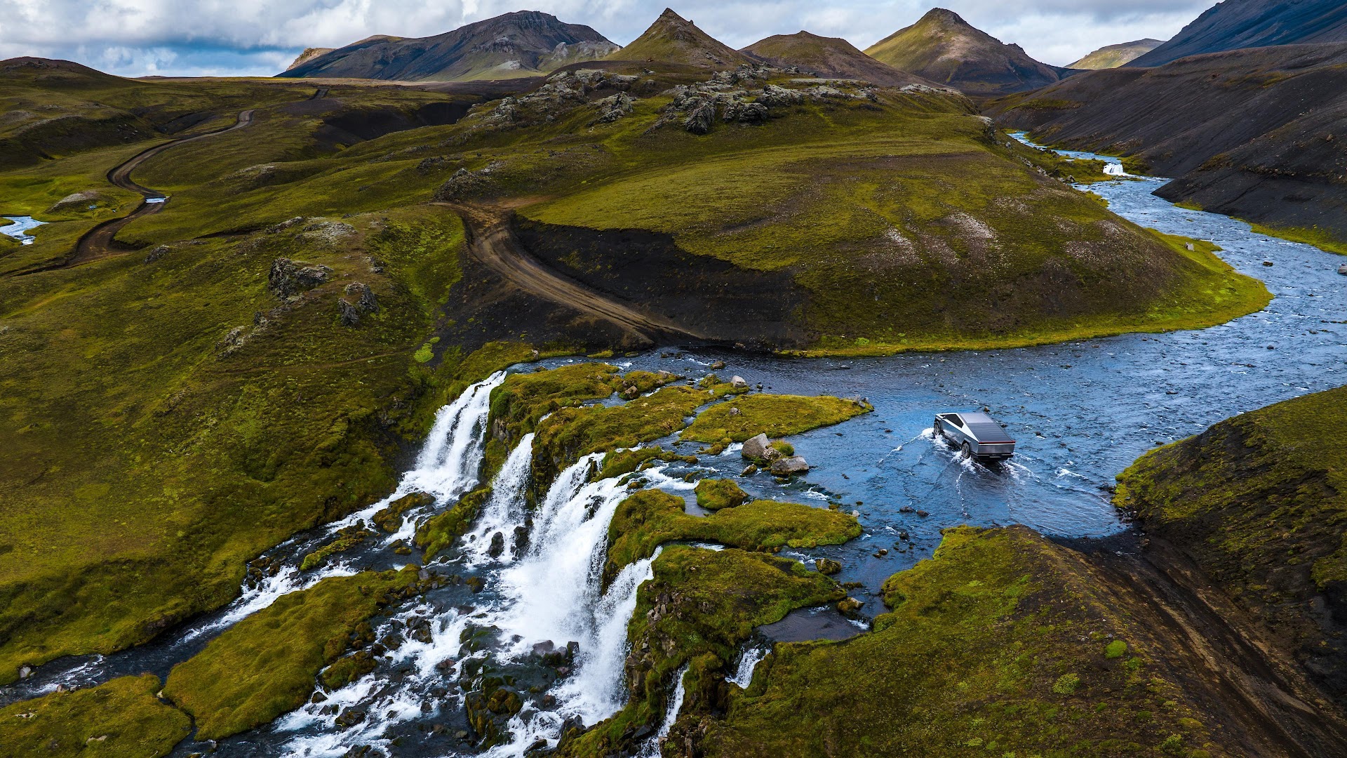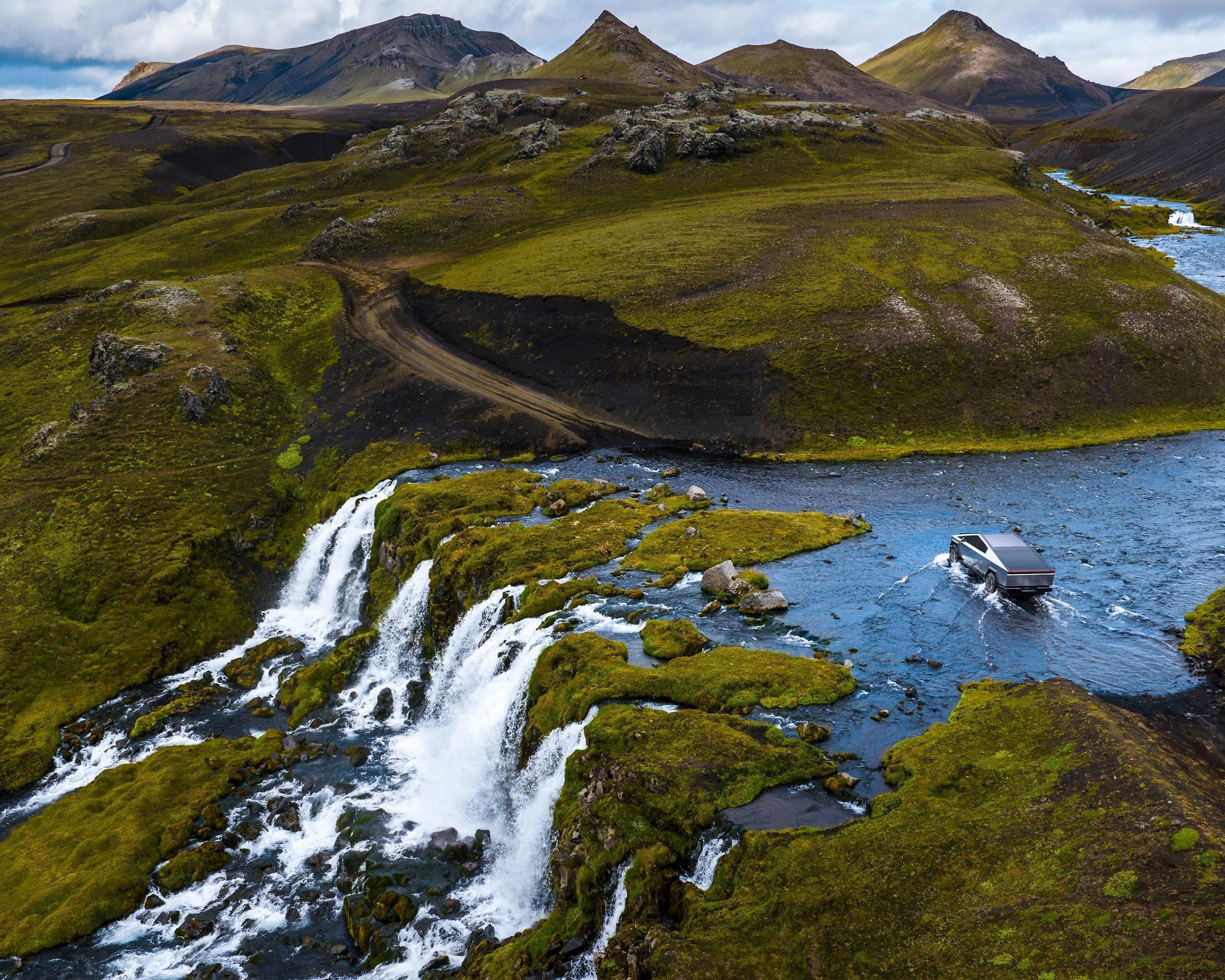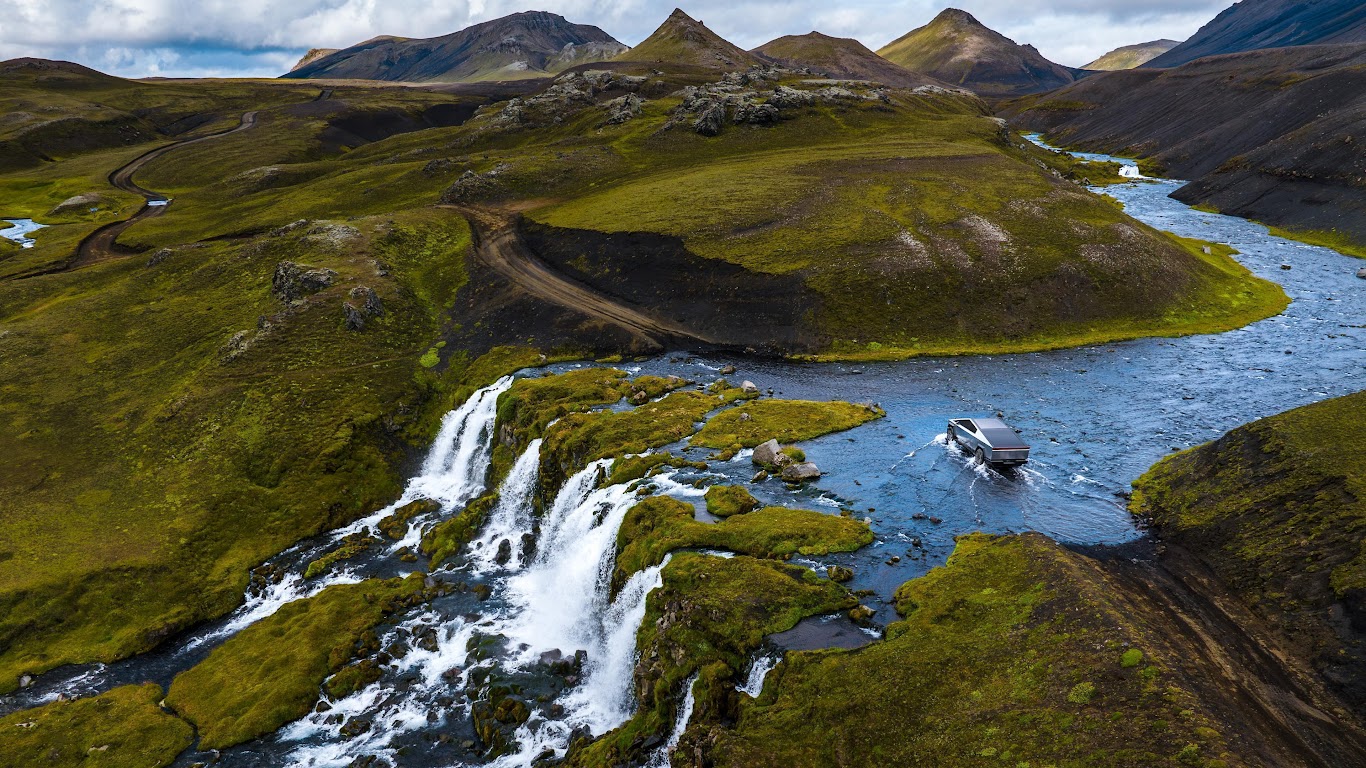 Iceland, Cybertruck, River Crossing, Off-Roading 4K Desktop and Mobile Wallpaper Background with a maximum resolution of 3840x2160 px.