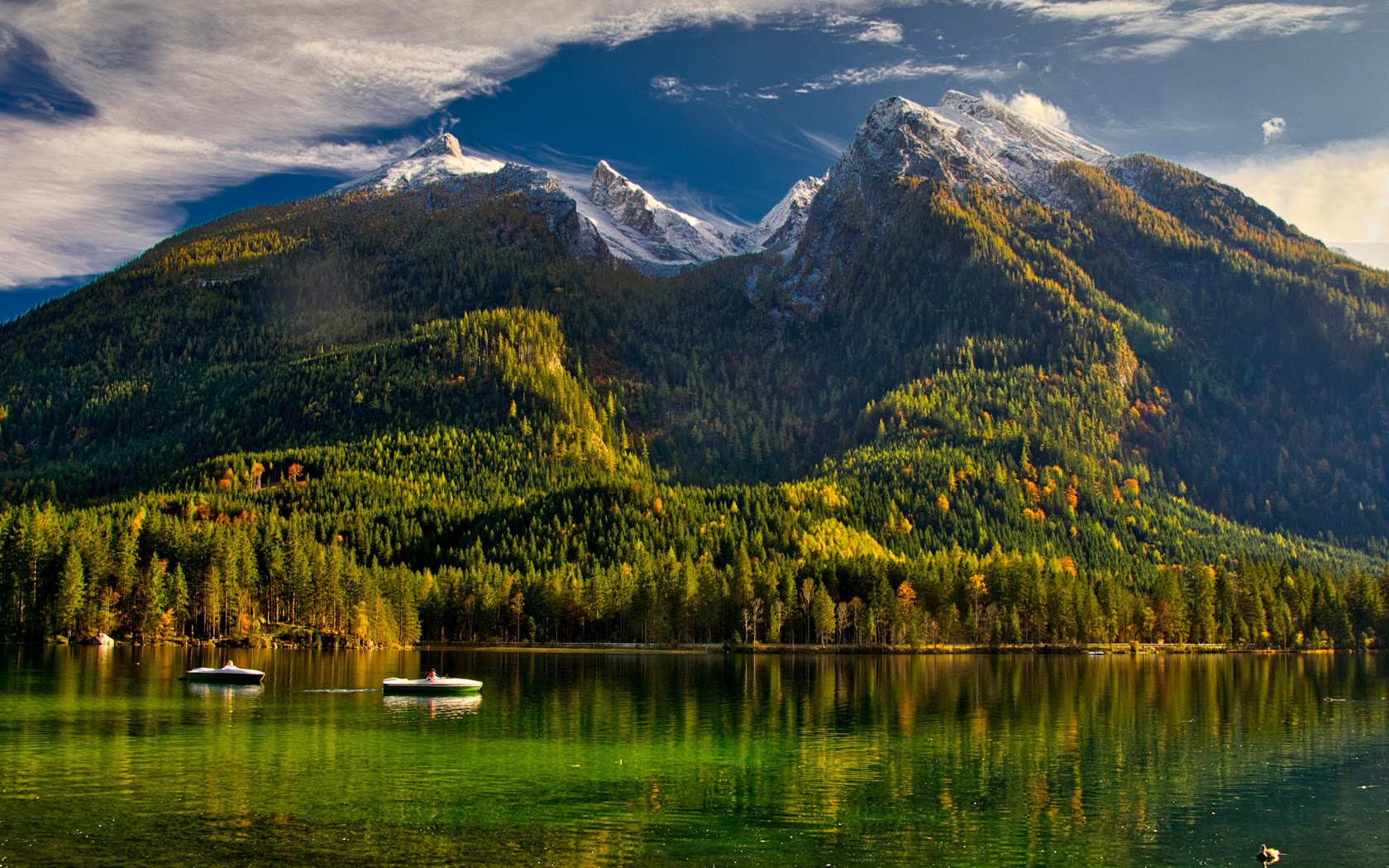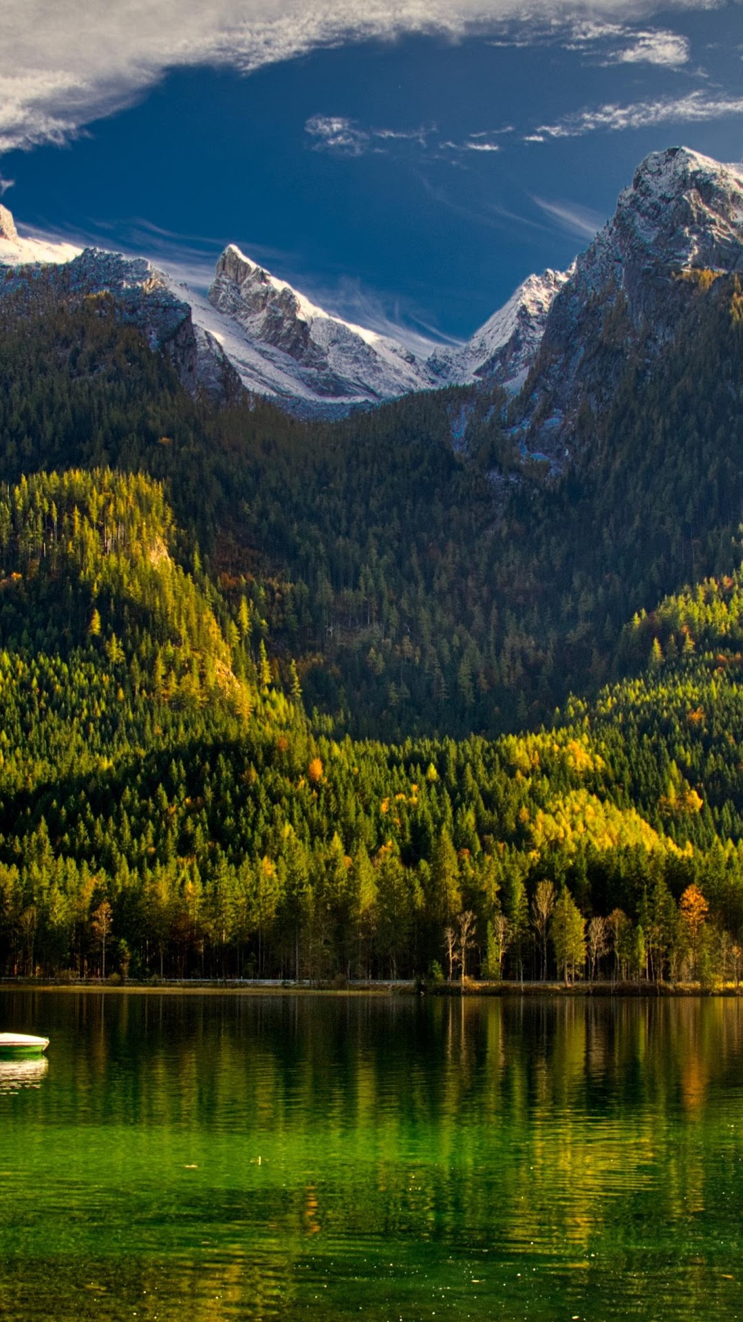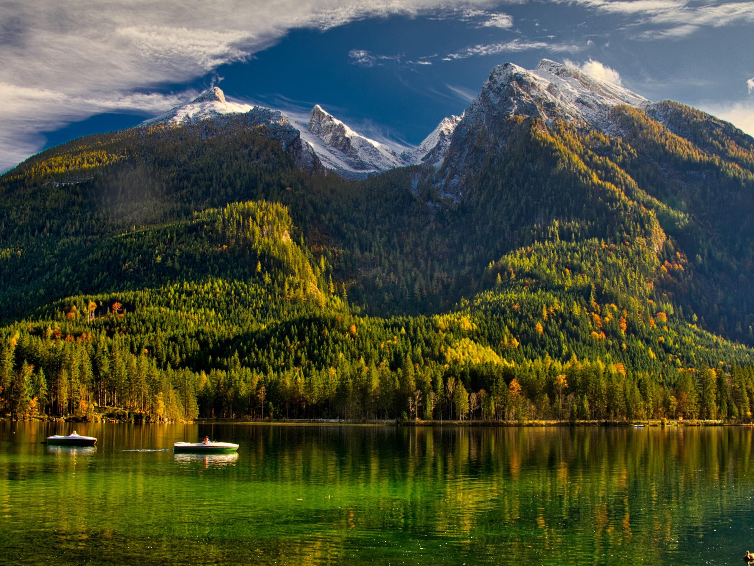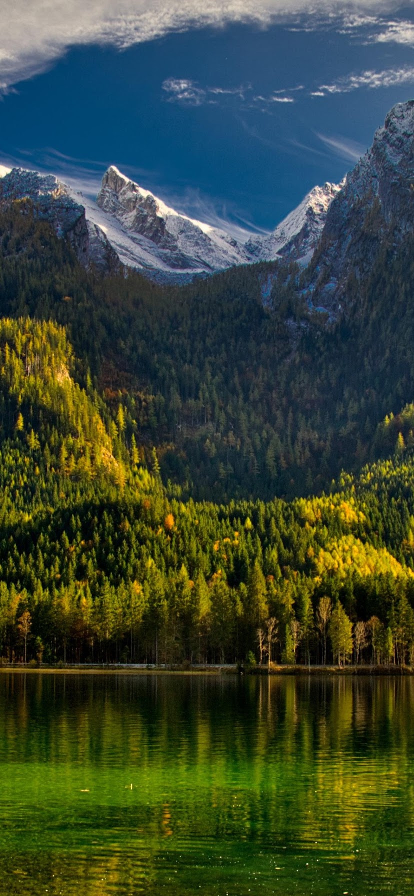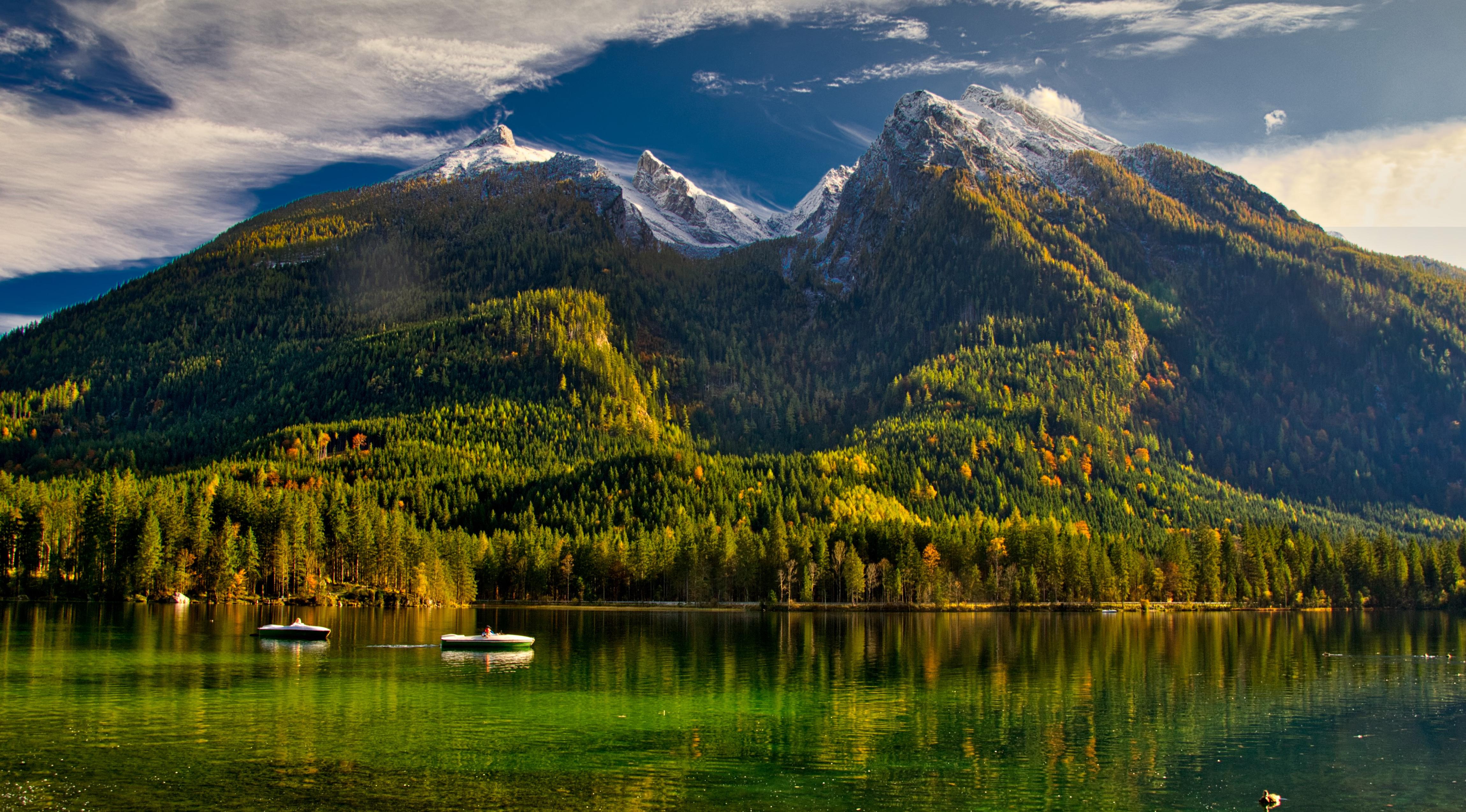 Mountain Lake, Alpine Scenery, Forest Reflection, Bavarian Alps 4K Desktop and Mobile Wallpaper Background with a maximum resolution of 4600x2550 px.