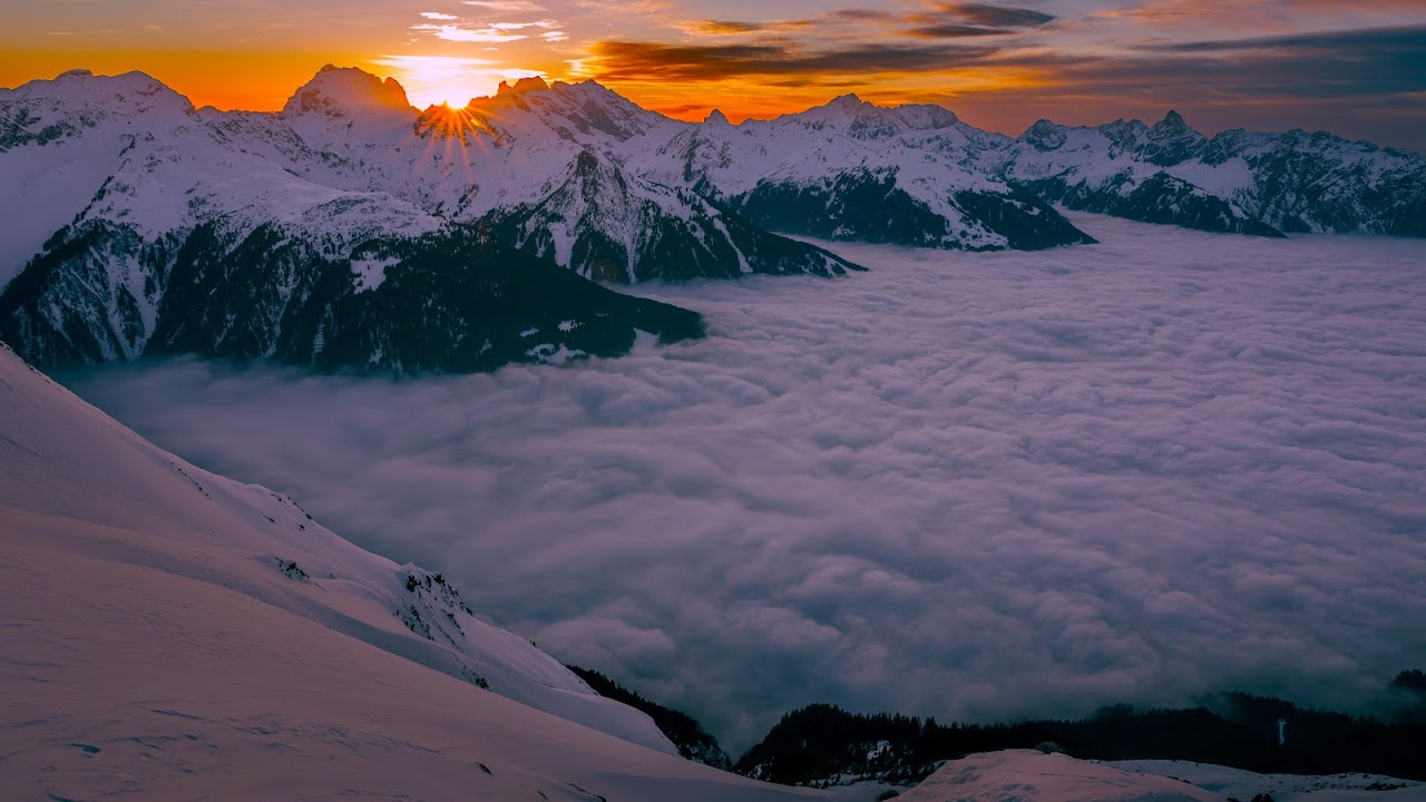Mountain Landscape, Sunrise View, Foggy Mountains, Snowy Peaks 5K Desktop and Mobile Wallpaper Background with a maximum resolution of 6144x3523 px.