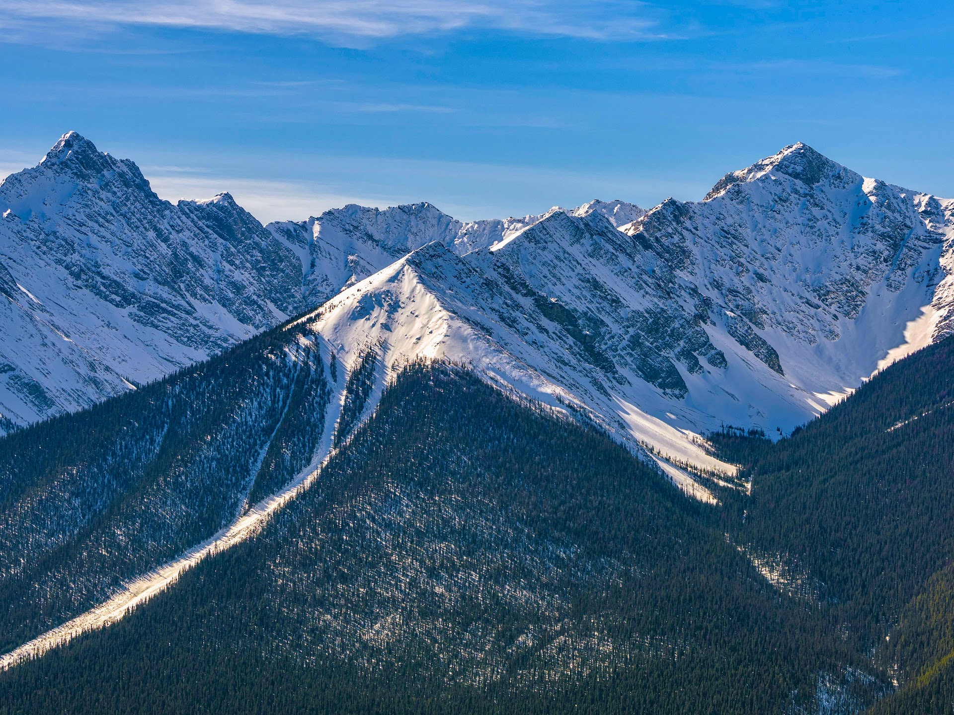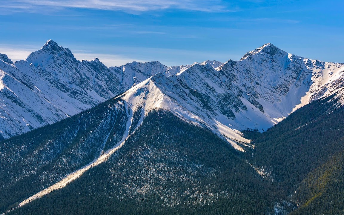 Mountain Range, Snowy Peaks, Winter Landscape, Pine Forest 5K Desktop and Mobile Wallpaper Background with a maximum resolution of 6000x3405 px.