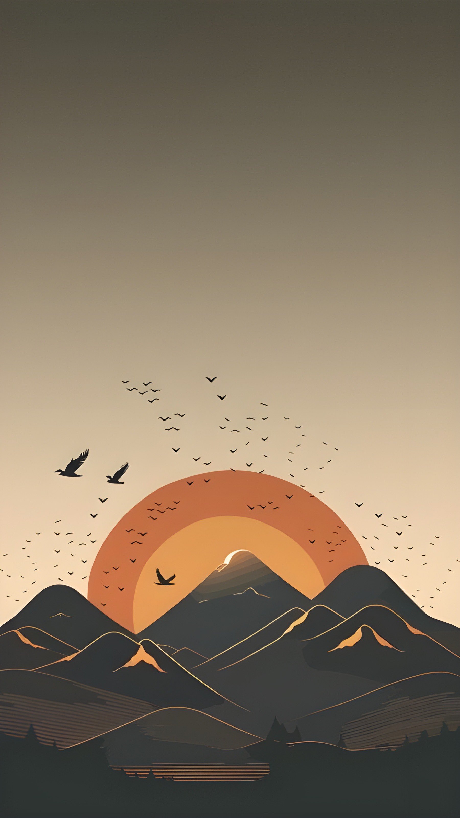 Mountainscape, Sunset, Birds, Vector Illustration 2K iPhone Phone Wallpaper