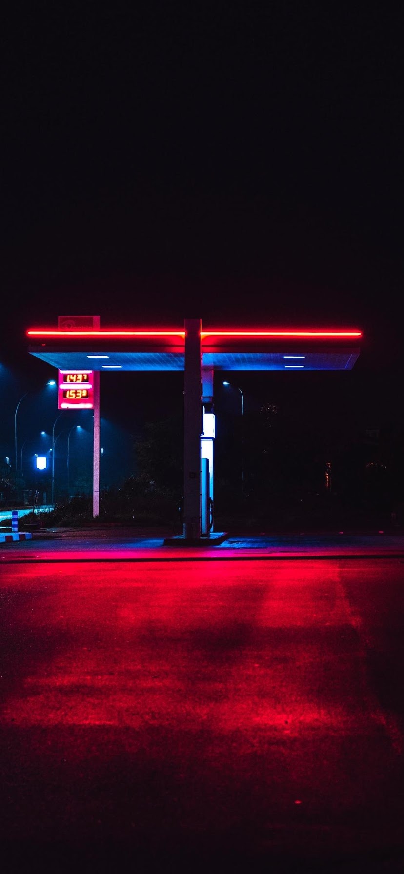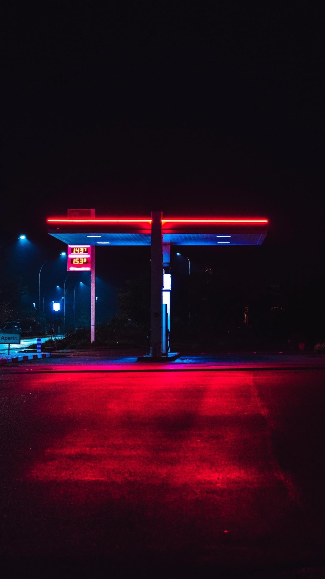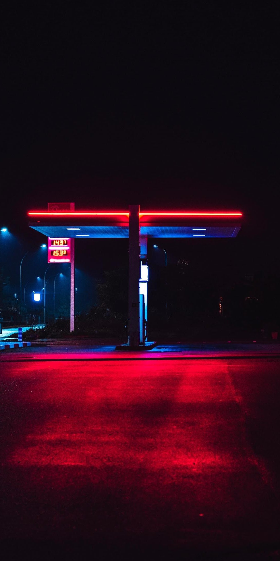 Neon Lights, Night Photography, Gas Station, Cityscape 4K Desktop and Mobile Wallpaper Background with a maximum resolution of 3840x2160 px.