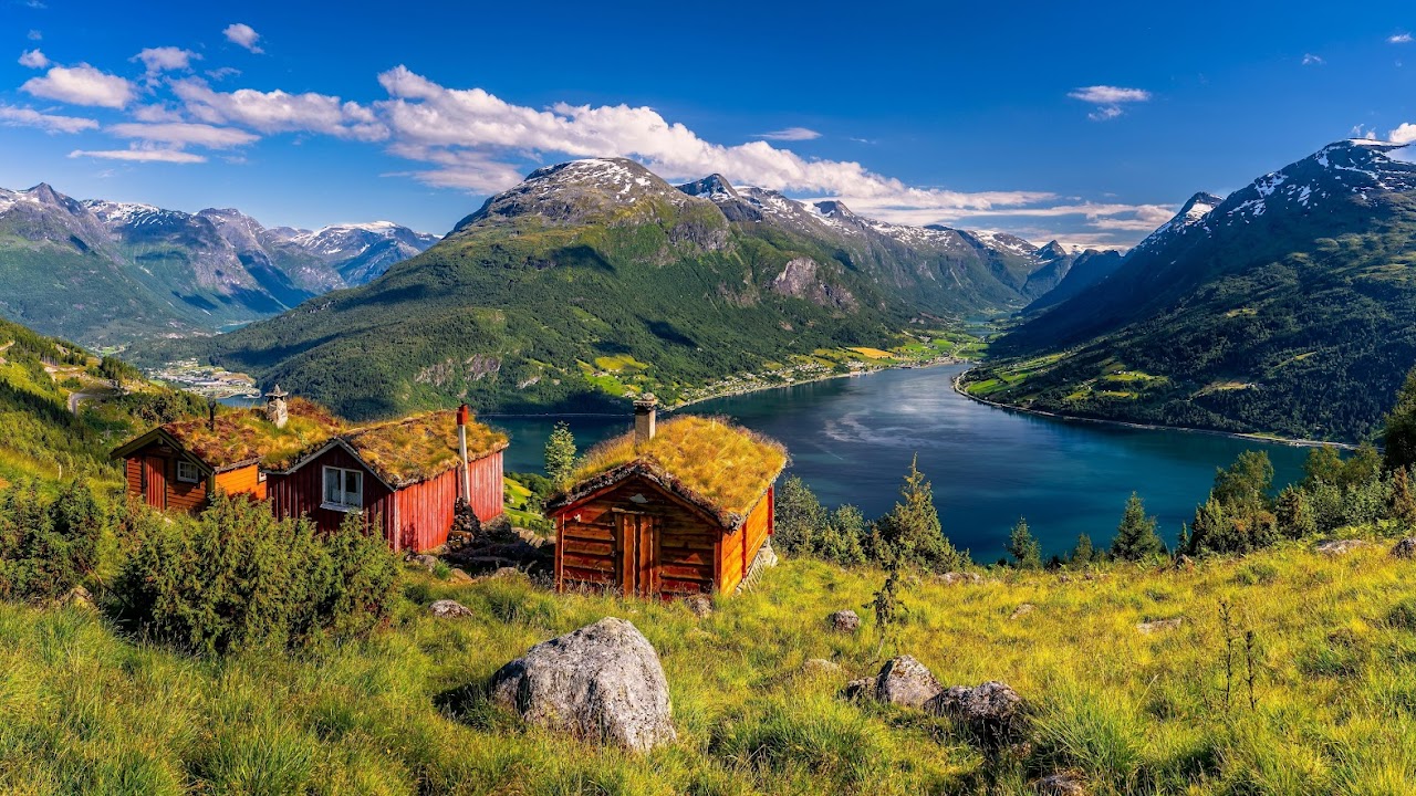 Norway, Fjord, Landscape, Cabins 5K Desktop Wallpaper