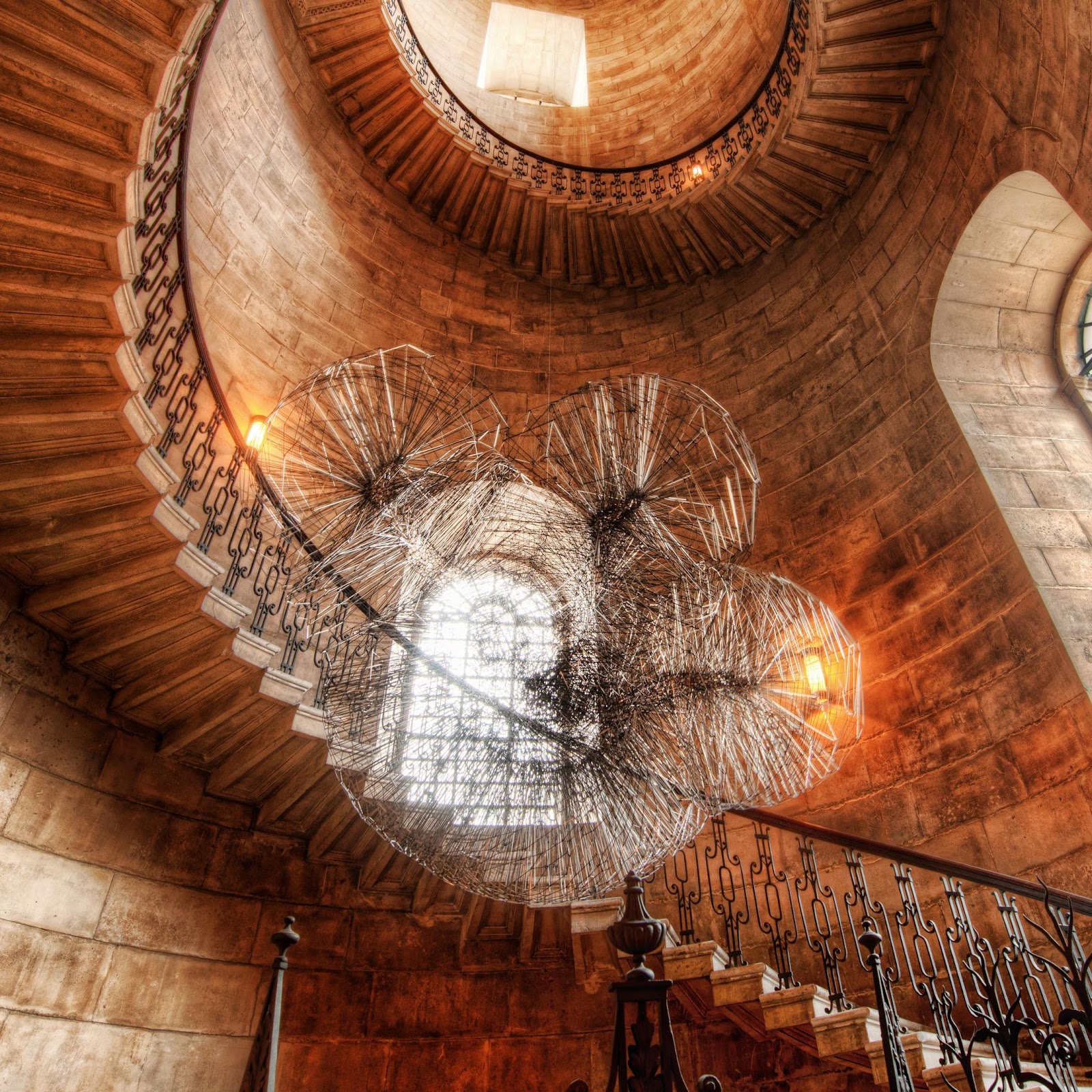 Spiral Staircase, Stone Architecture, Interior Design, Chandelier 4K Desktop Wallpaper