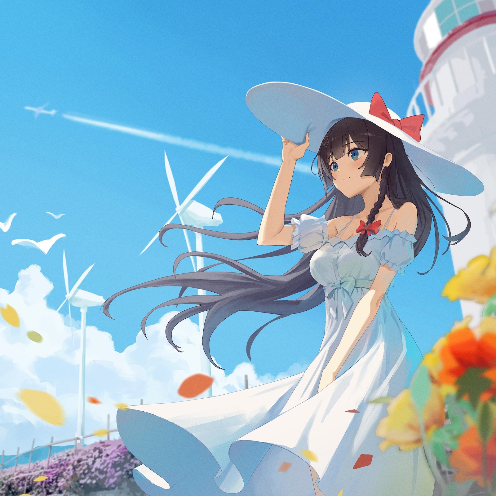 Anime Girl, Summer, Lighthouse, Wind Turbines 4K Desktop Wallpaper