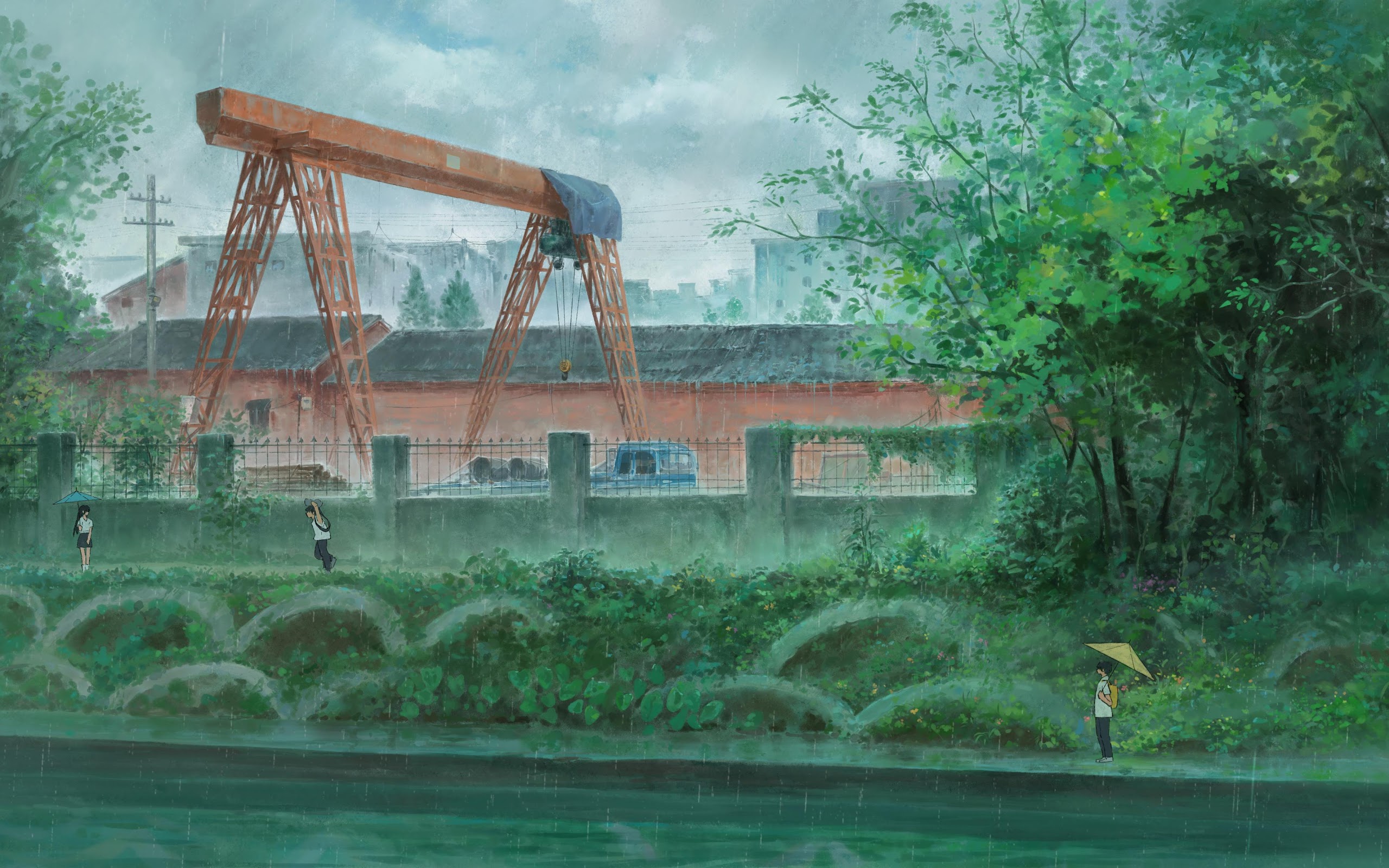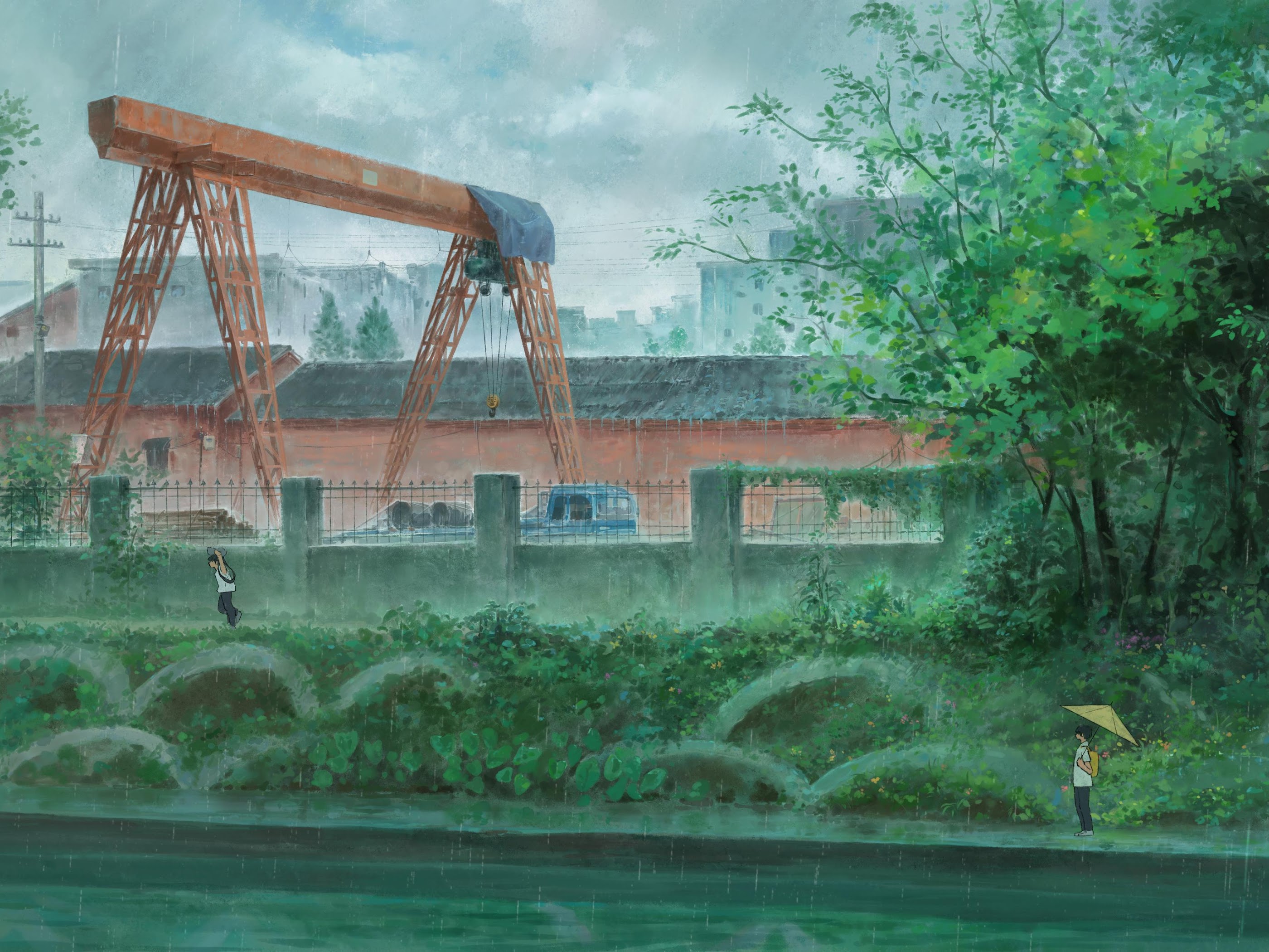 Anime, Rain, Cityscape, Crane 4K Desktop and Mobile Wallpaper Background with a maximum resolution of 3840x2274 px.