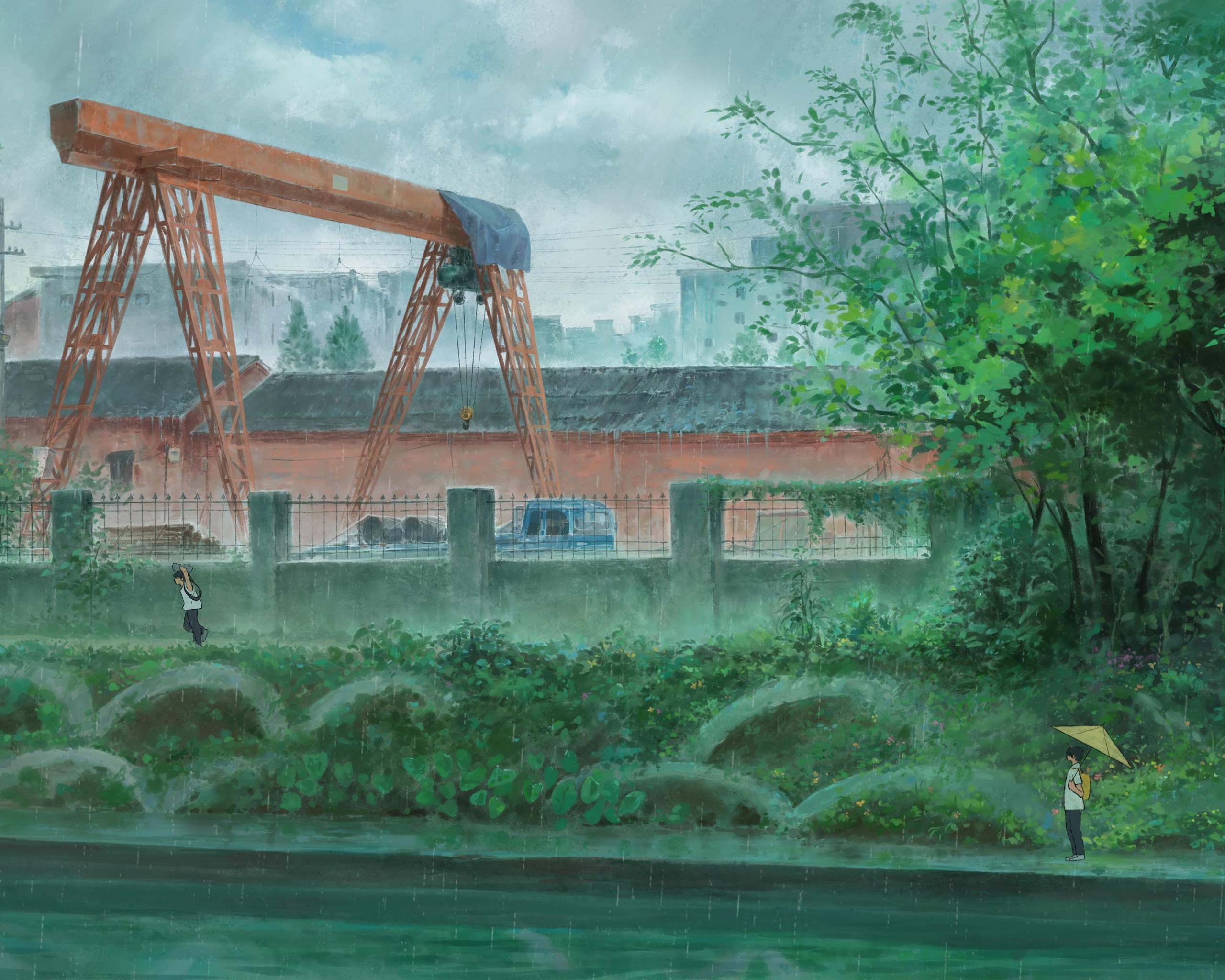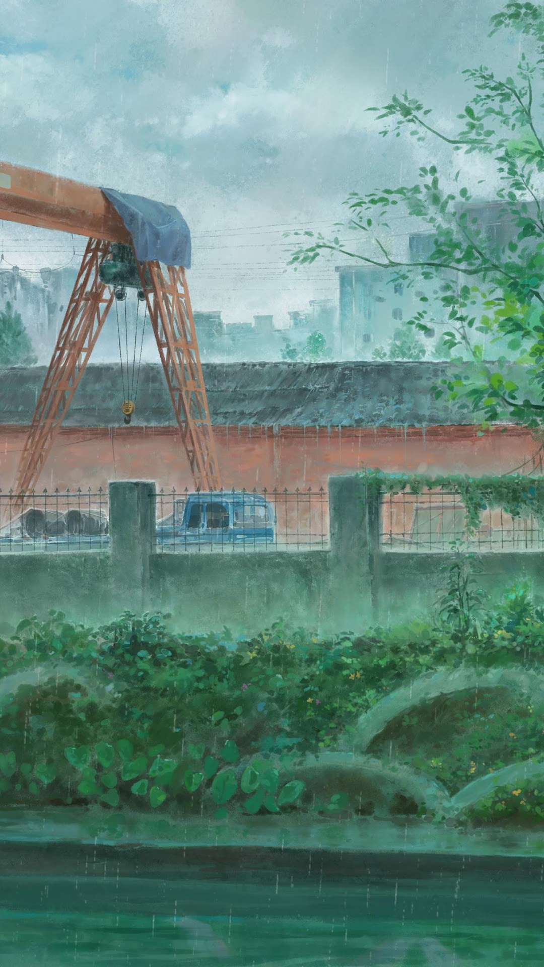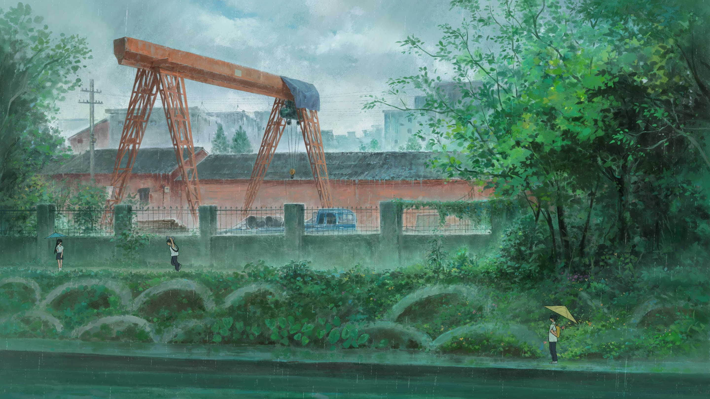 Anime, Rain, Cityscape, Crane 4K Desktop and Mobile Wallpaper Background with a maximum resolution of 3840x2274 px.