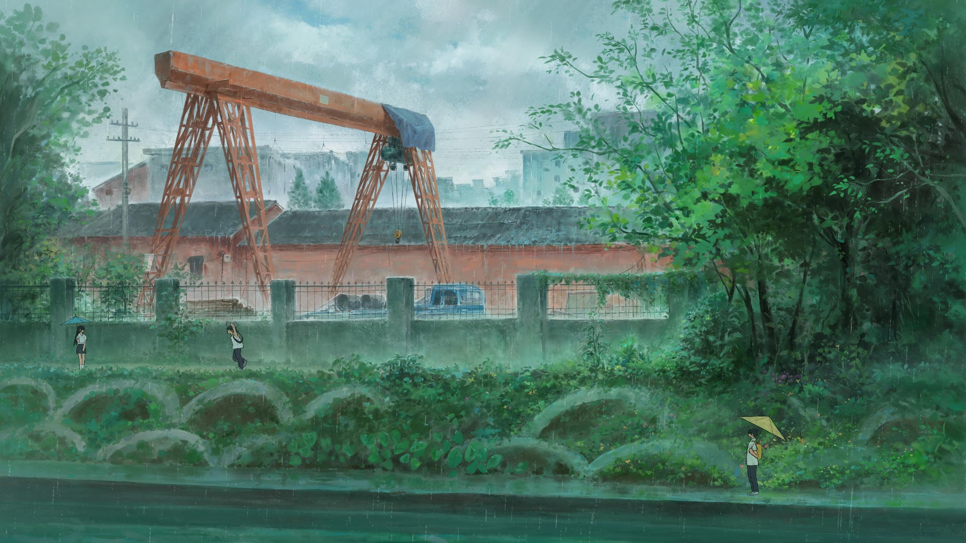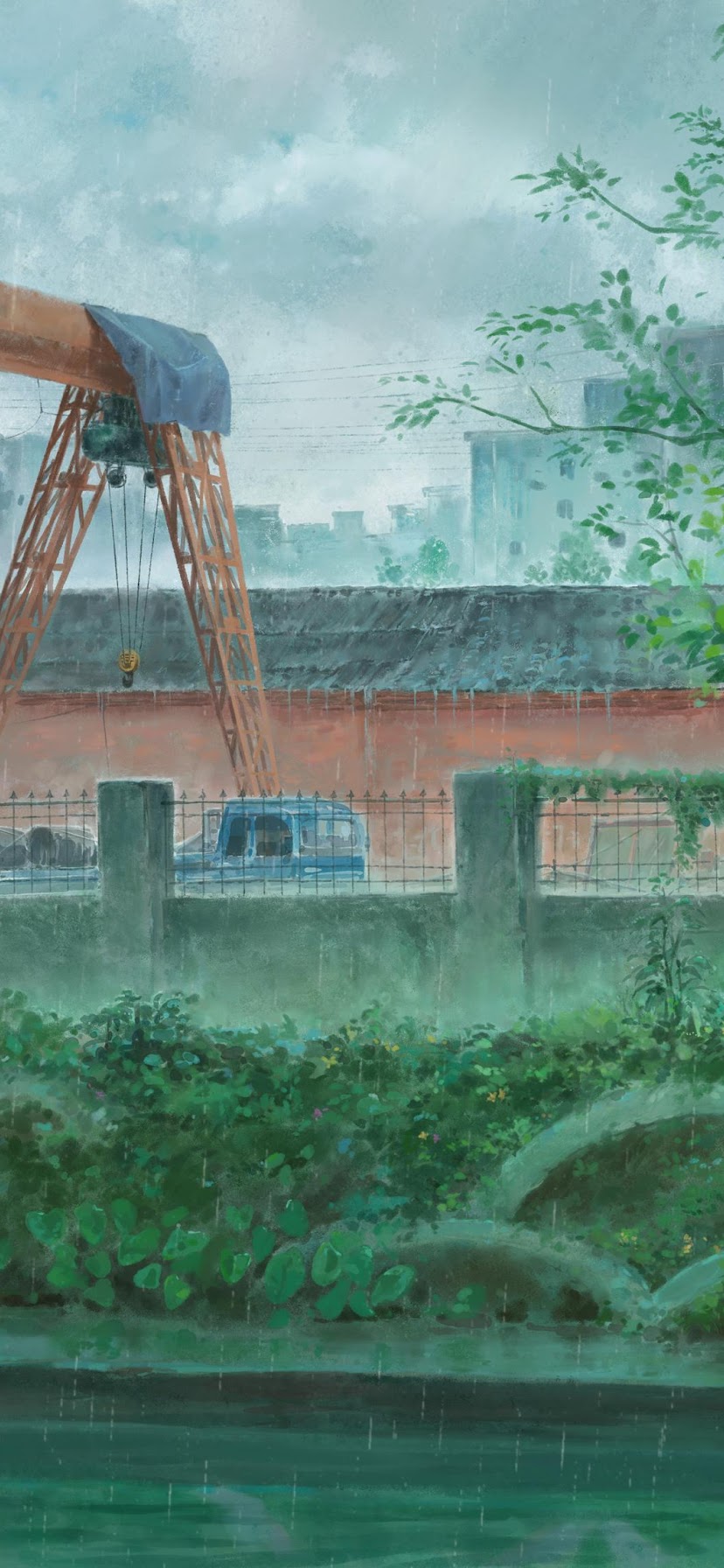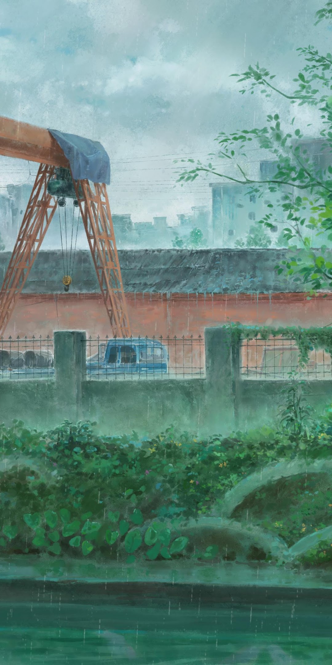 Anime, Rain, Cityscape, Crane 4K Desktop and Mobile Wallpaper Background with a maximum resolution of 3840x2274 px.