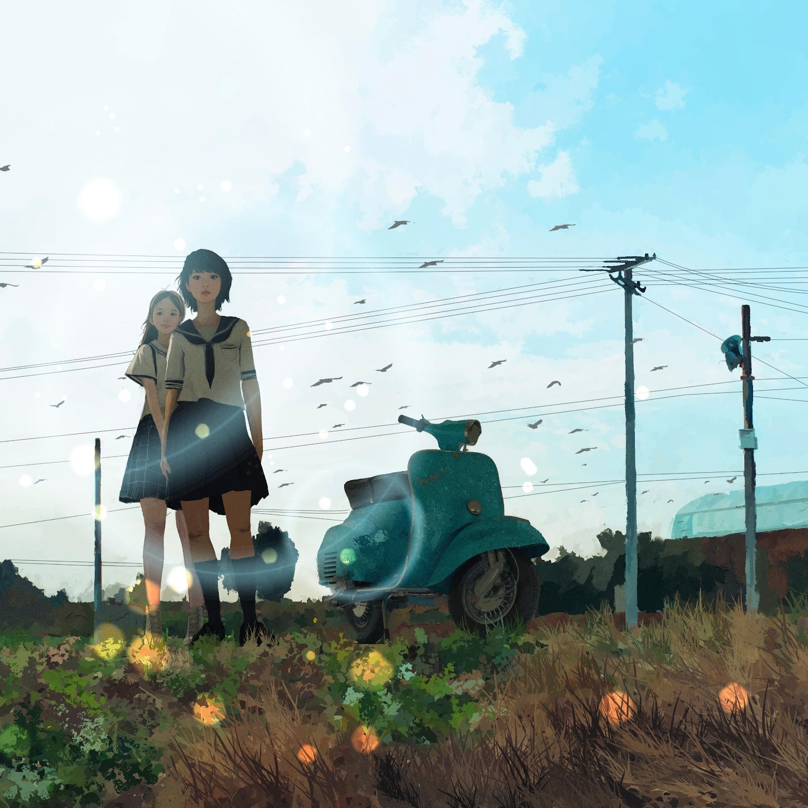 Anime, Schoolgirls, Scooter, Landscape 4K Desktop and Mobile Wallpaper Background with a maximum resolution of 4000x2250 px.