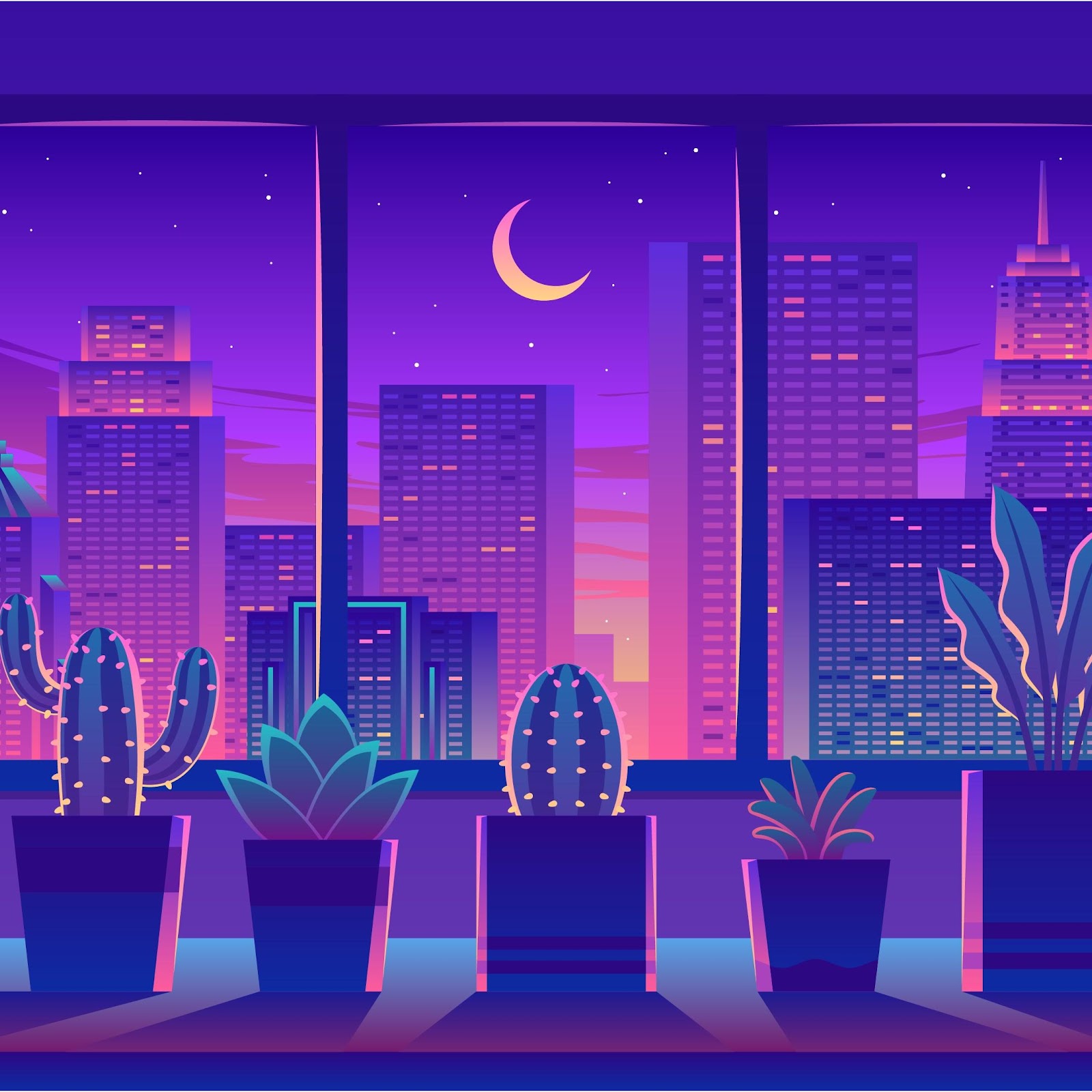 Cartoon, Night Cityscape, Plants, Window View 4K Desktop and Mobile Wallpaper Background with a maximum resolution of 3840x2160 px.