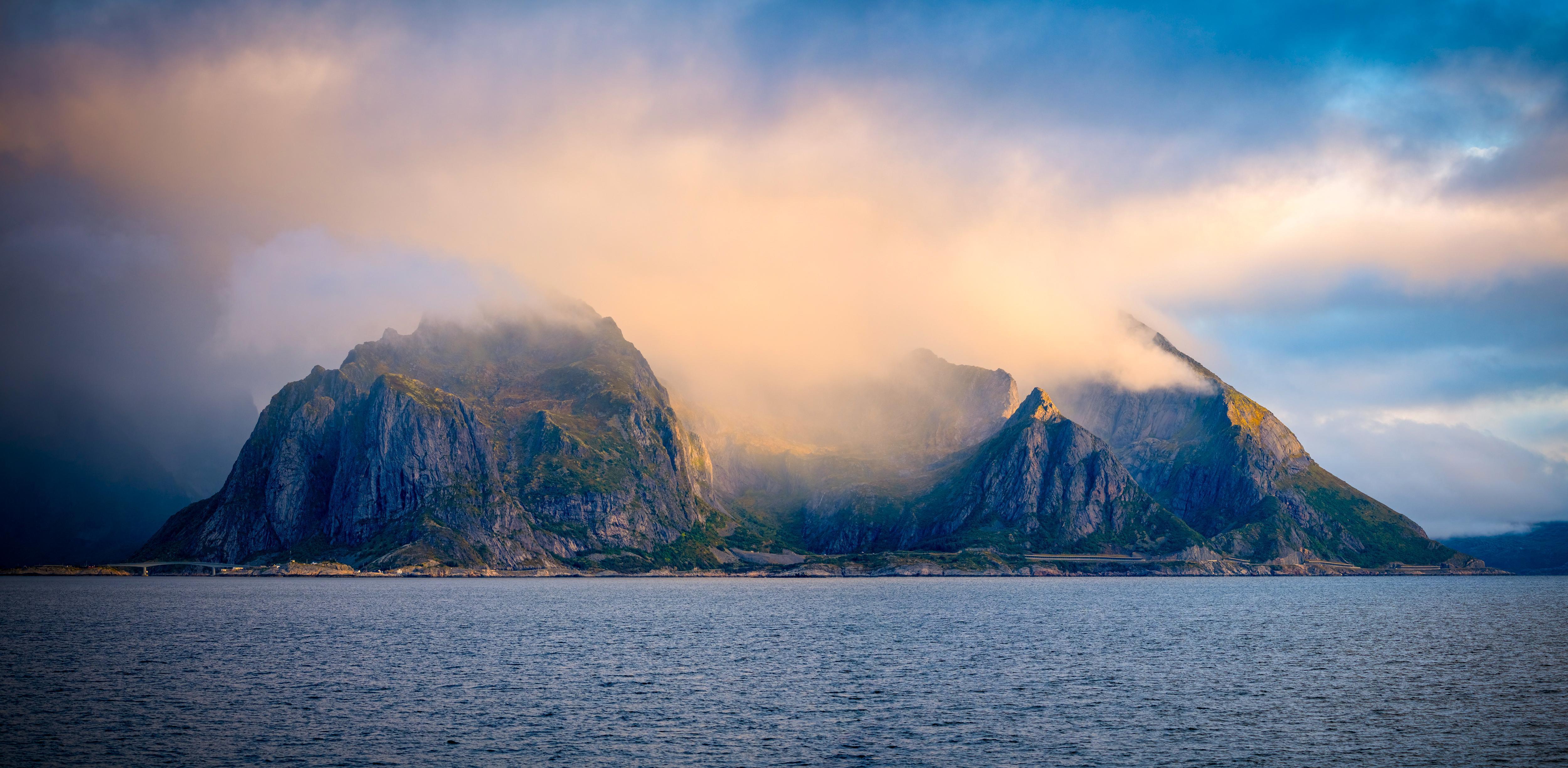 Lofoten Islands, Norway, Mountain Scenery, Coastal Landscape 4K Desktop and Mobile Wallpaper Background with a maximum resolution of 5000x2449 px.