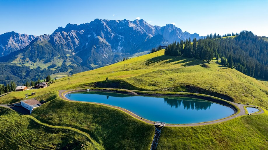 Mountain Lake, Alpine Scenery, Mountain Reservoir, Austrian Alps 5K Desktop and Mobile Wallpaper Background with a maximum resolution of 5120x2880 px.