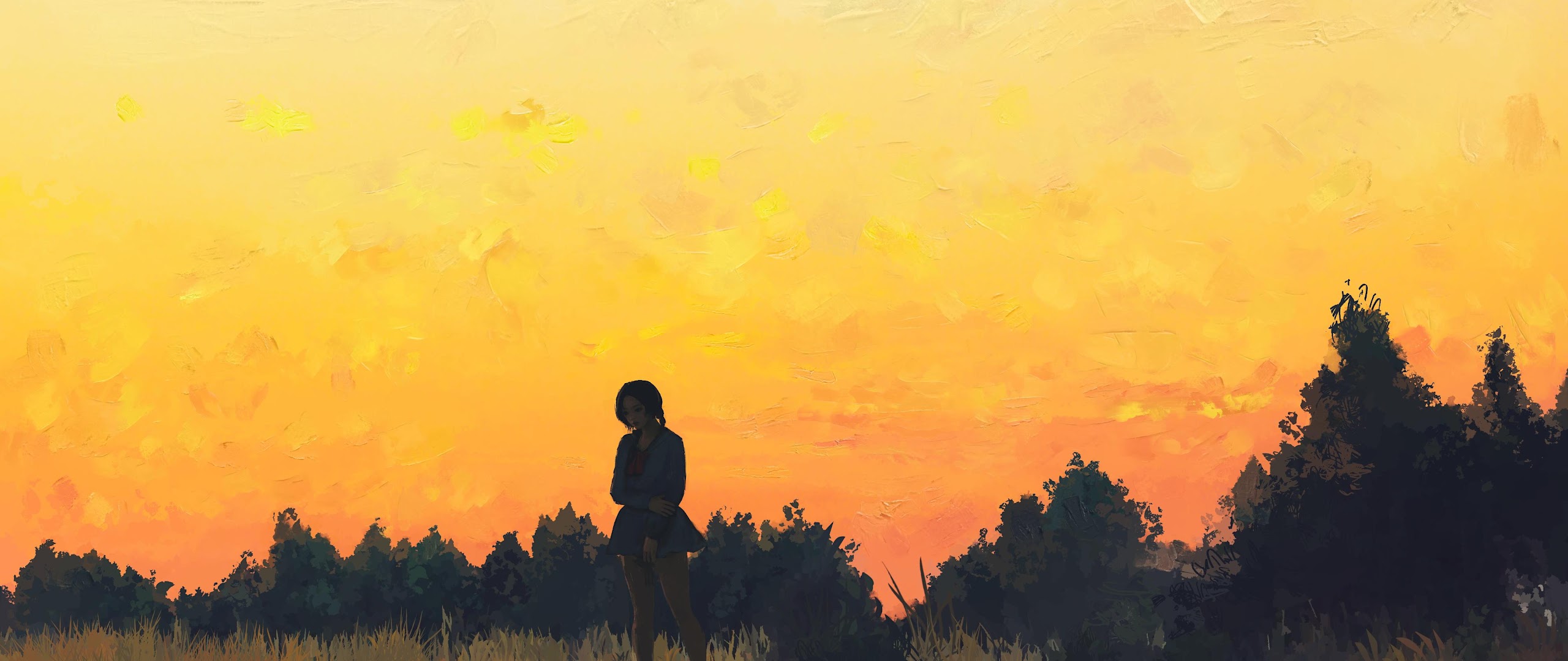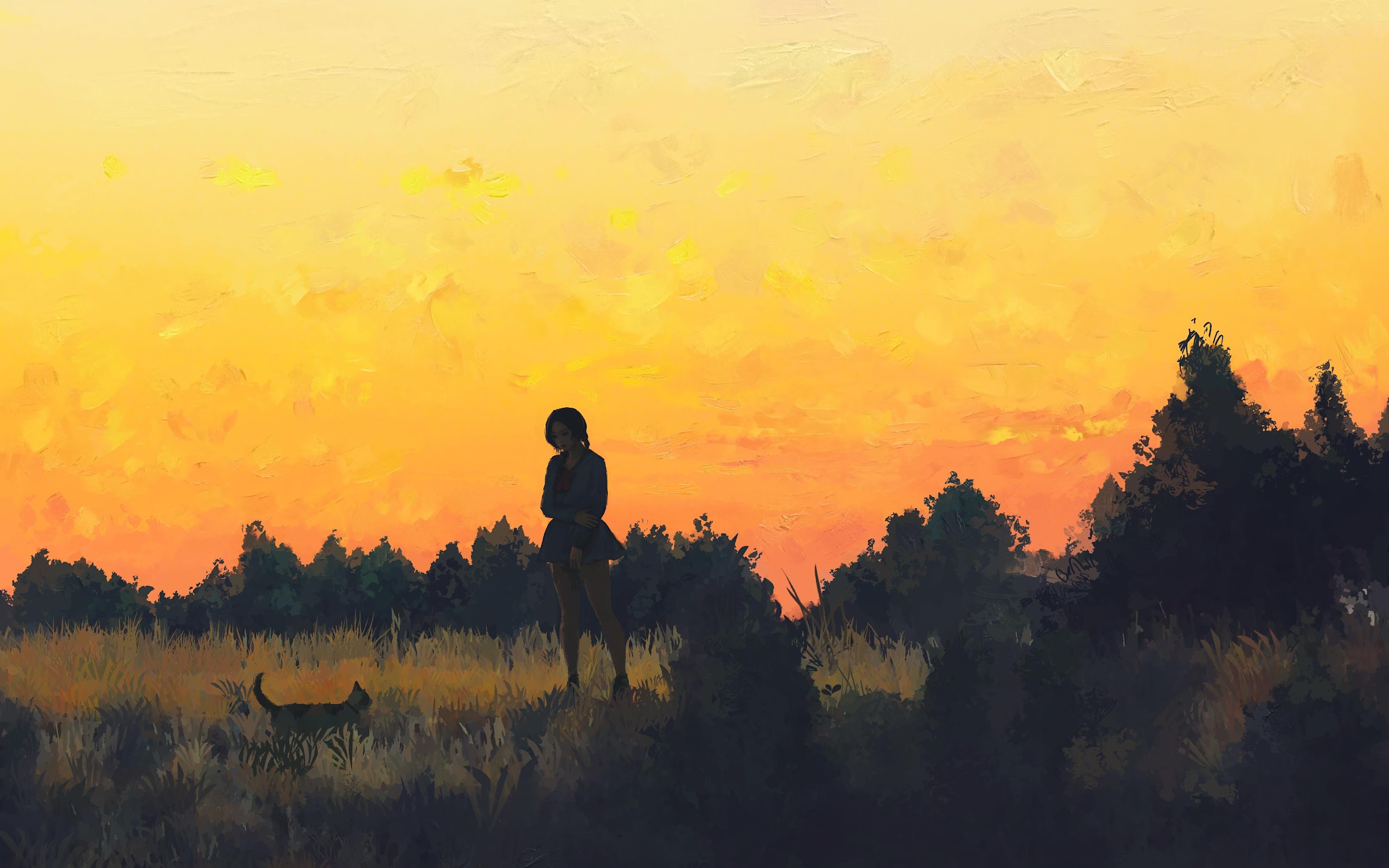 Sunset Illustration, Anime Landscape, Golden Hour, Tranquil Scene 4K Desktop and Mobile Wallpaper Background with a maximum resolution of 4000x2666 px.