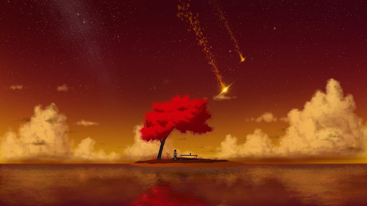 Sunset, Island, Starfall, Red Tree 8K Desktop and Mobile Wallpaper Background with a maximum resolution of 8000x4500 px.