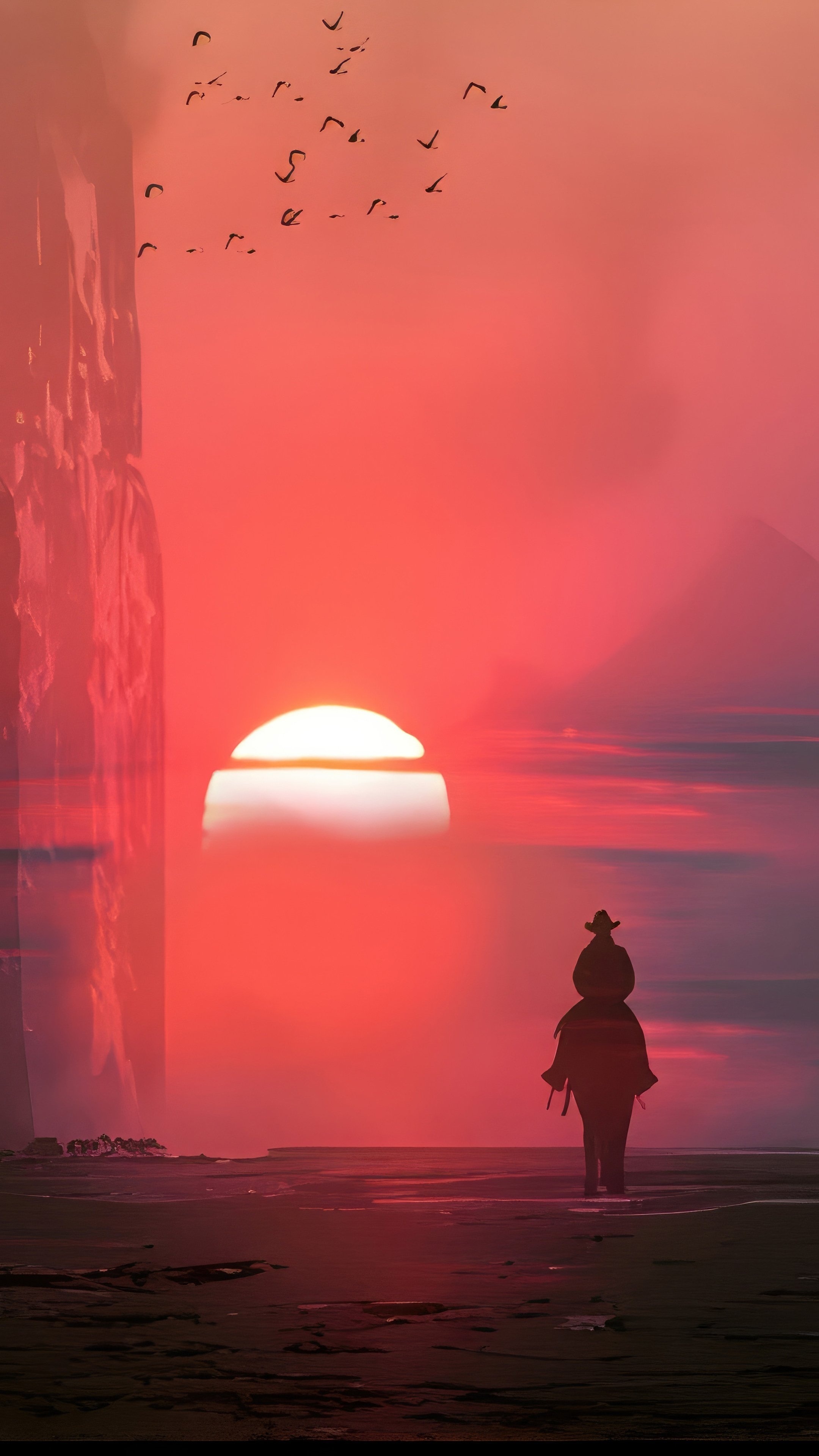 Sunset, Silhouette, Cowboy, Red Sky 4K iPhone Wallpaper Background with a maximum resolution of 2160x3840 px.