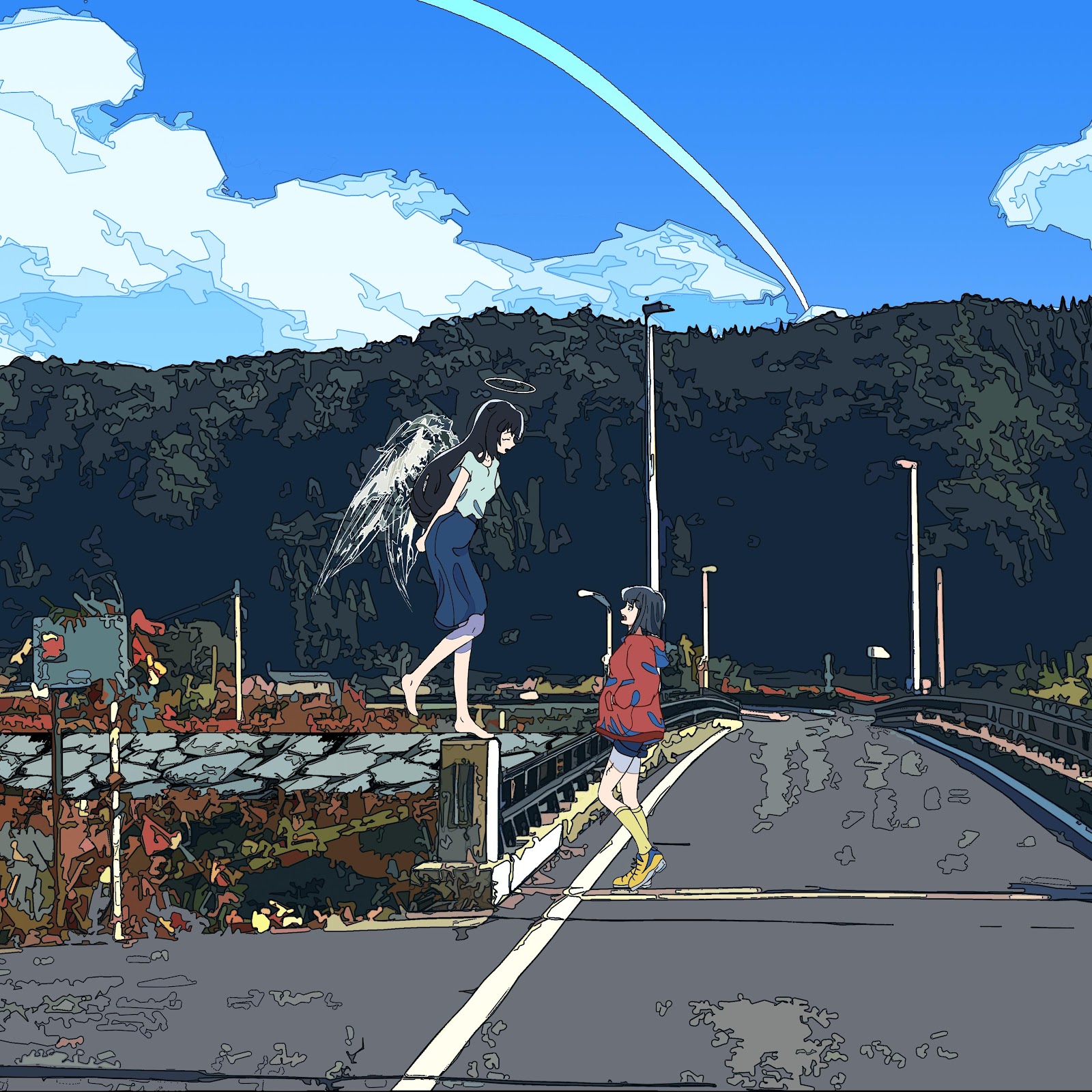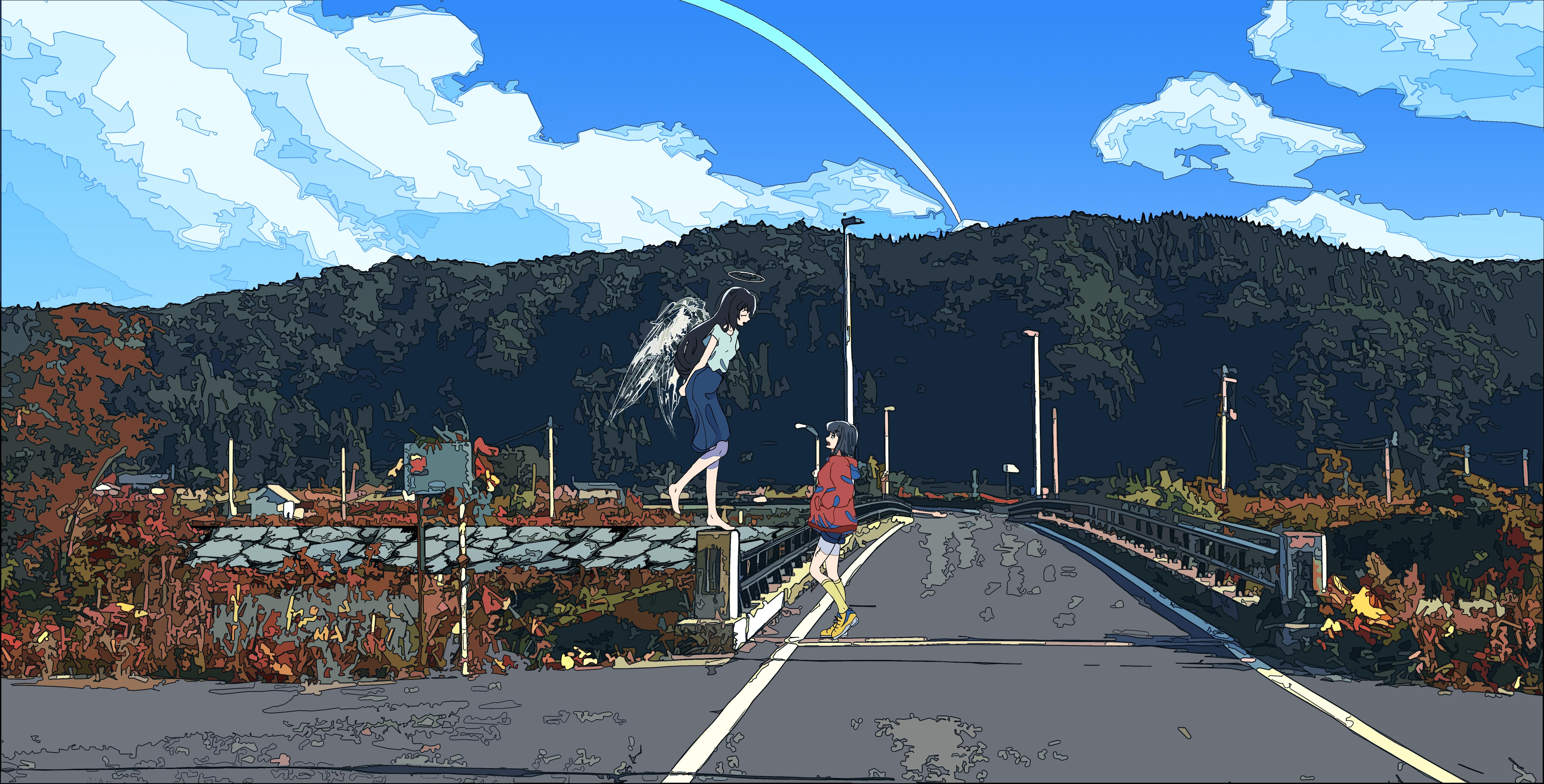 Anime, Angel, Bridge, Rural Landscape 5K Desktop and Mobile Wallpaper Background with a maximum resolution of 7200x3656 px.