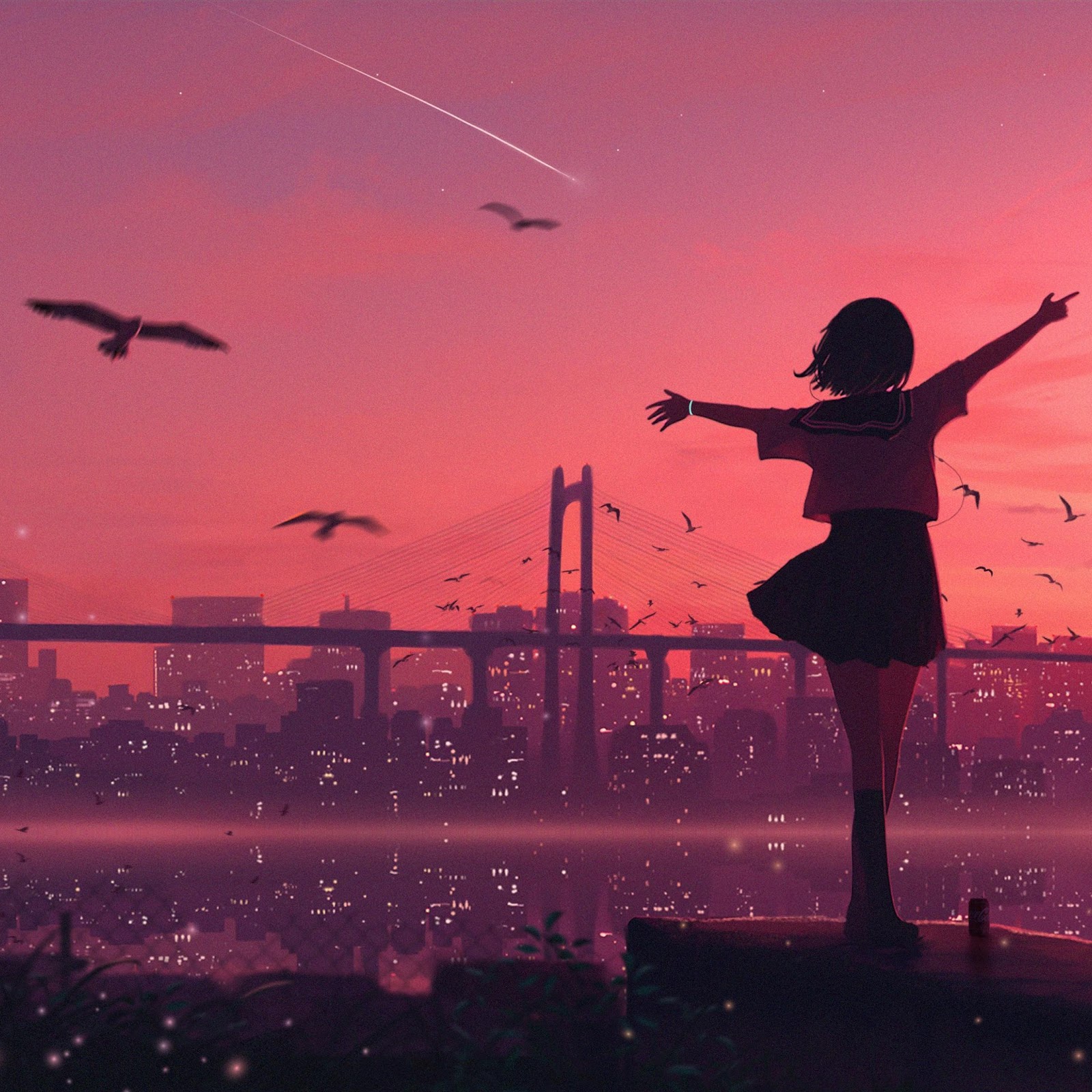 Anime, Cityscape, Sunset, Birds 4K Desktop and Mobile Wallpaper Background with a maximum resolution of 3840x2160 px.