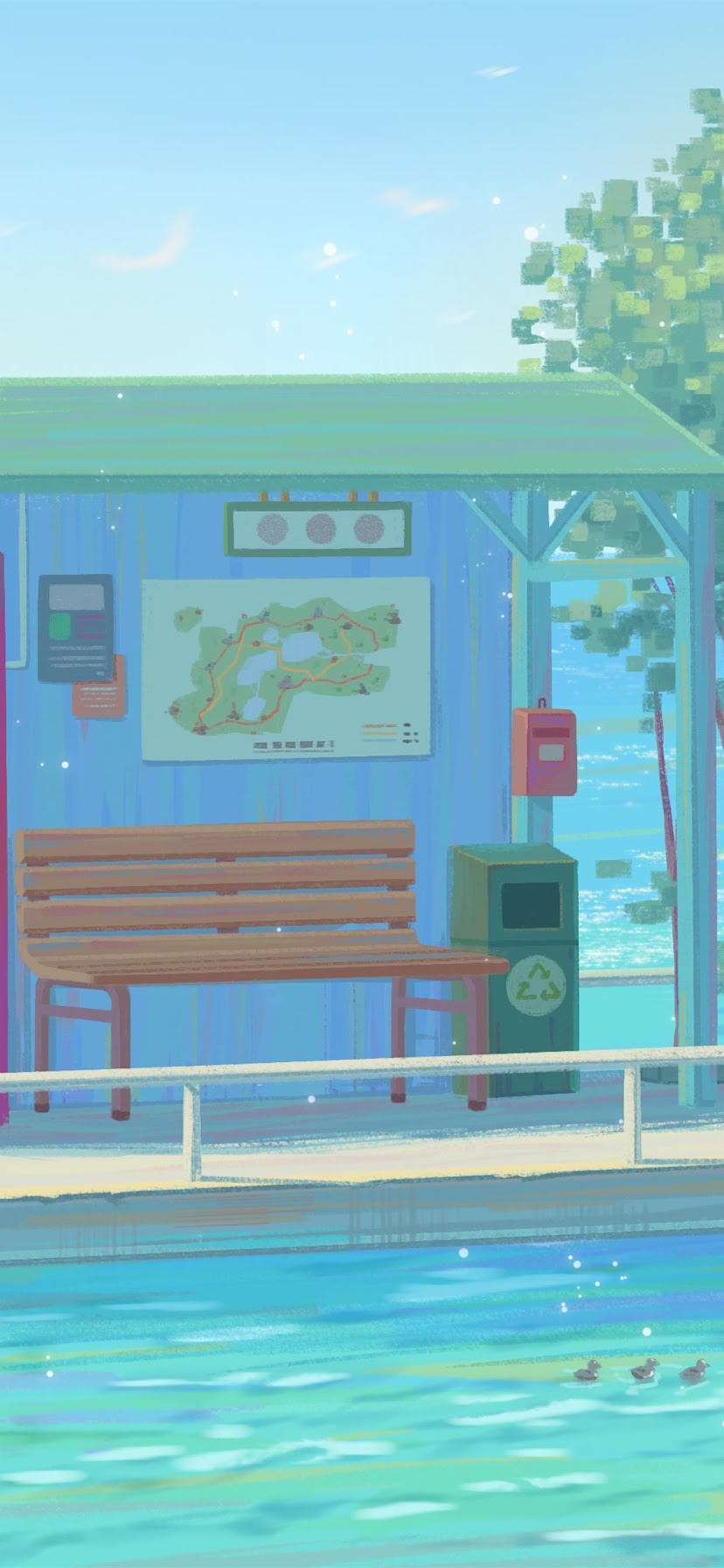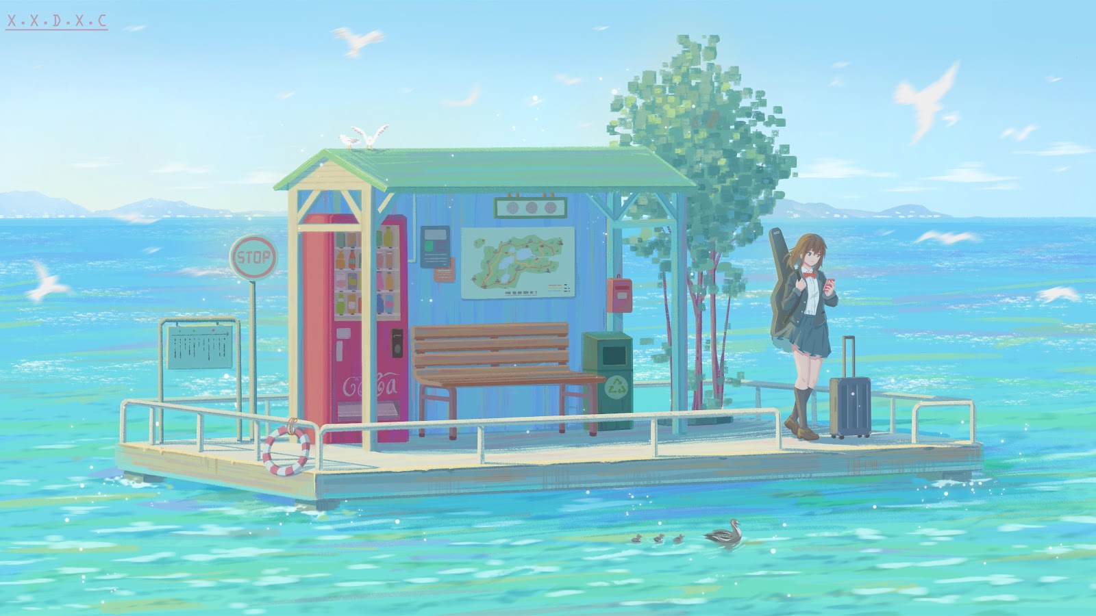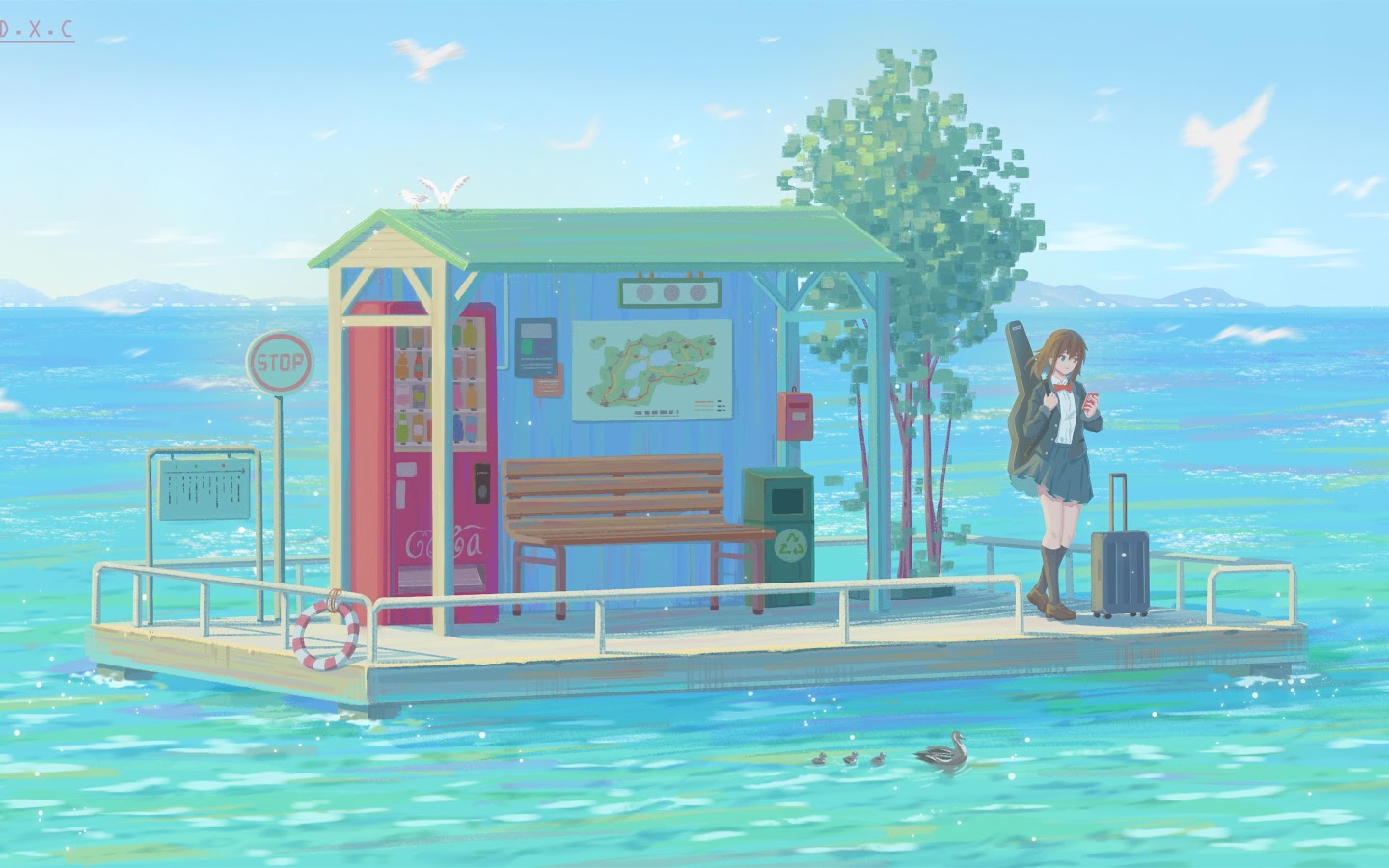 Anime Scenery, Floating Platform, Coastal Art, Schoolgirl Travel 4K Desktop Wallpaper